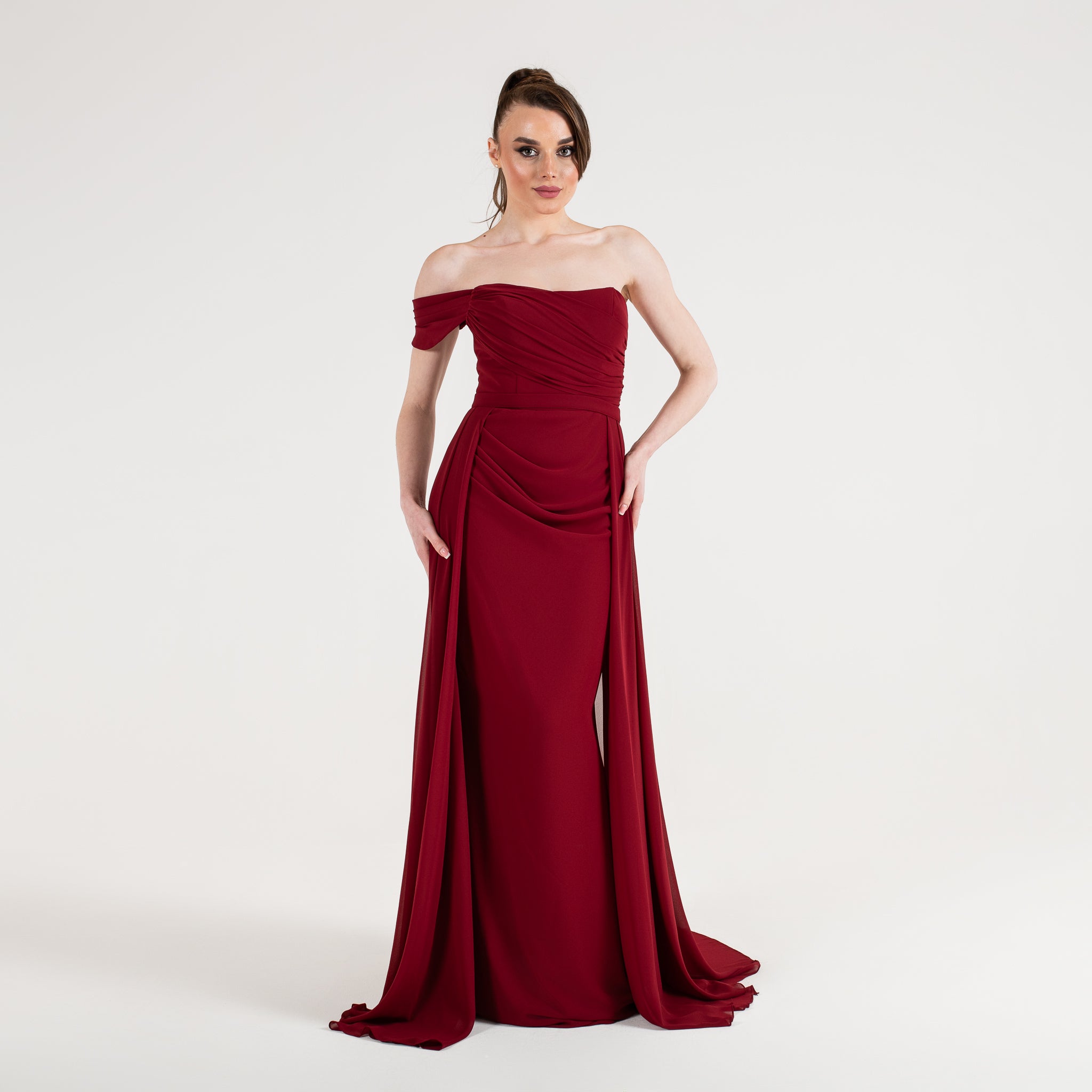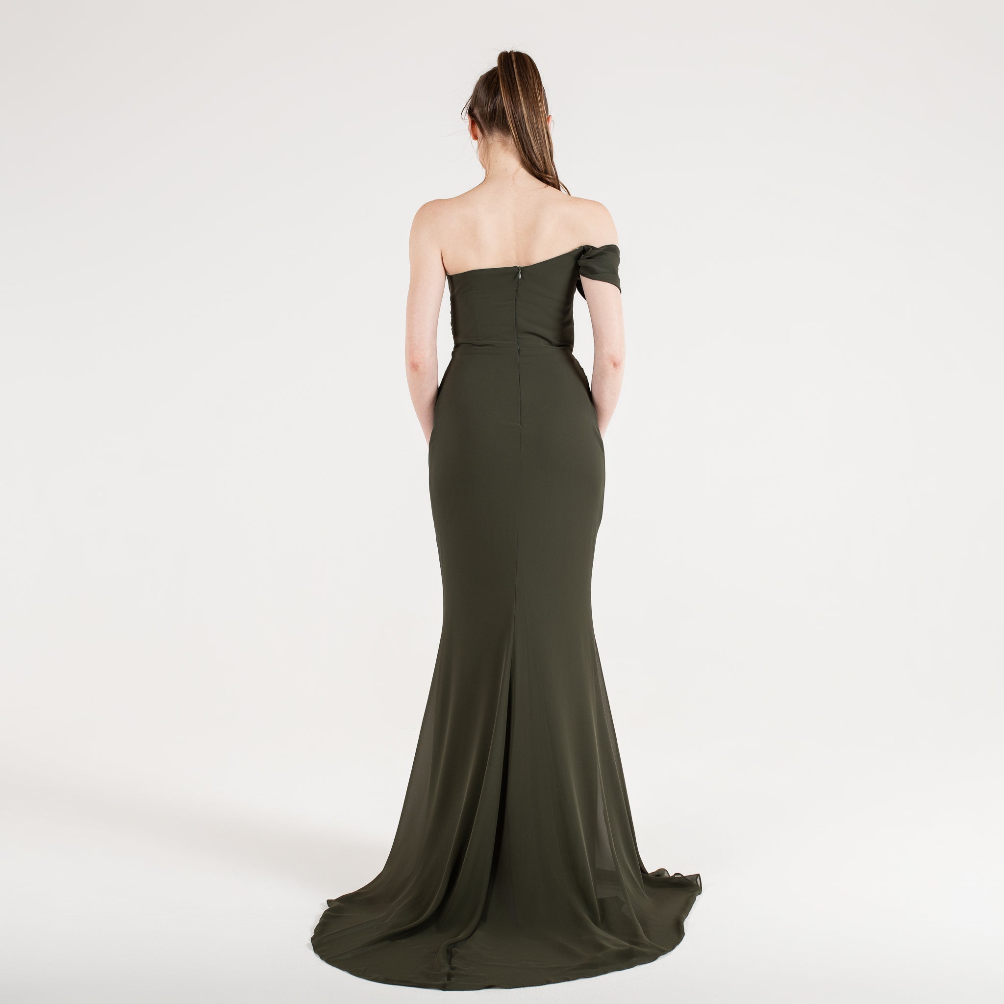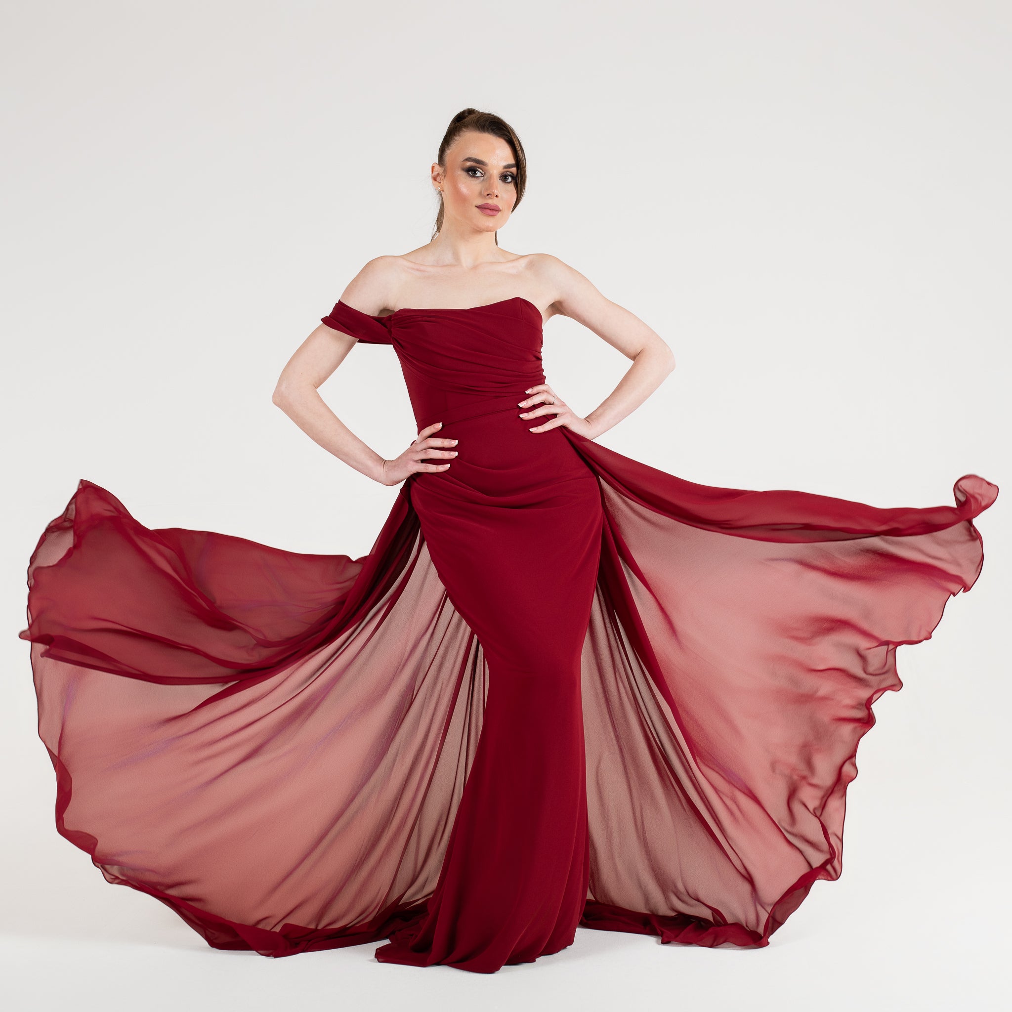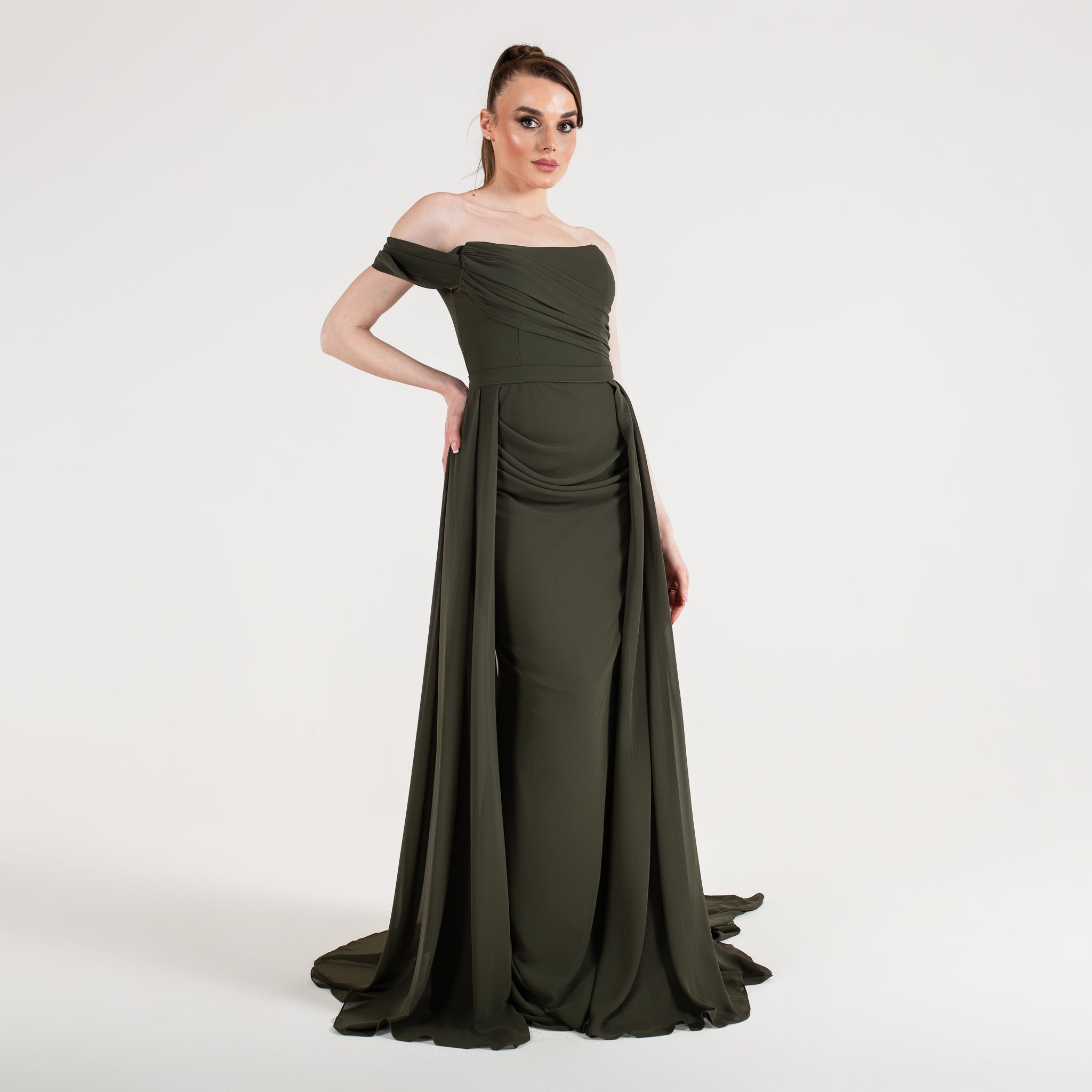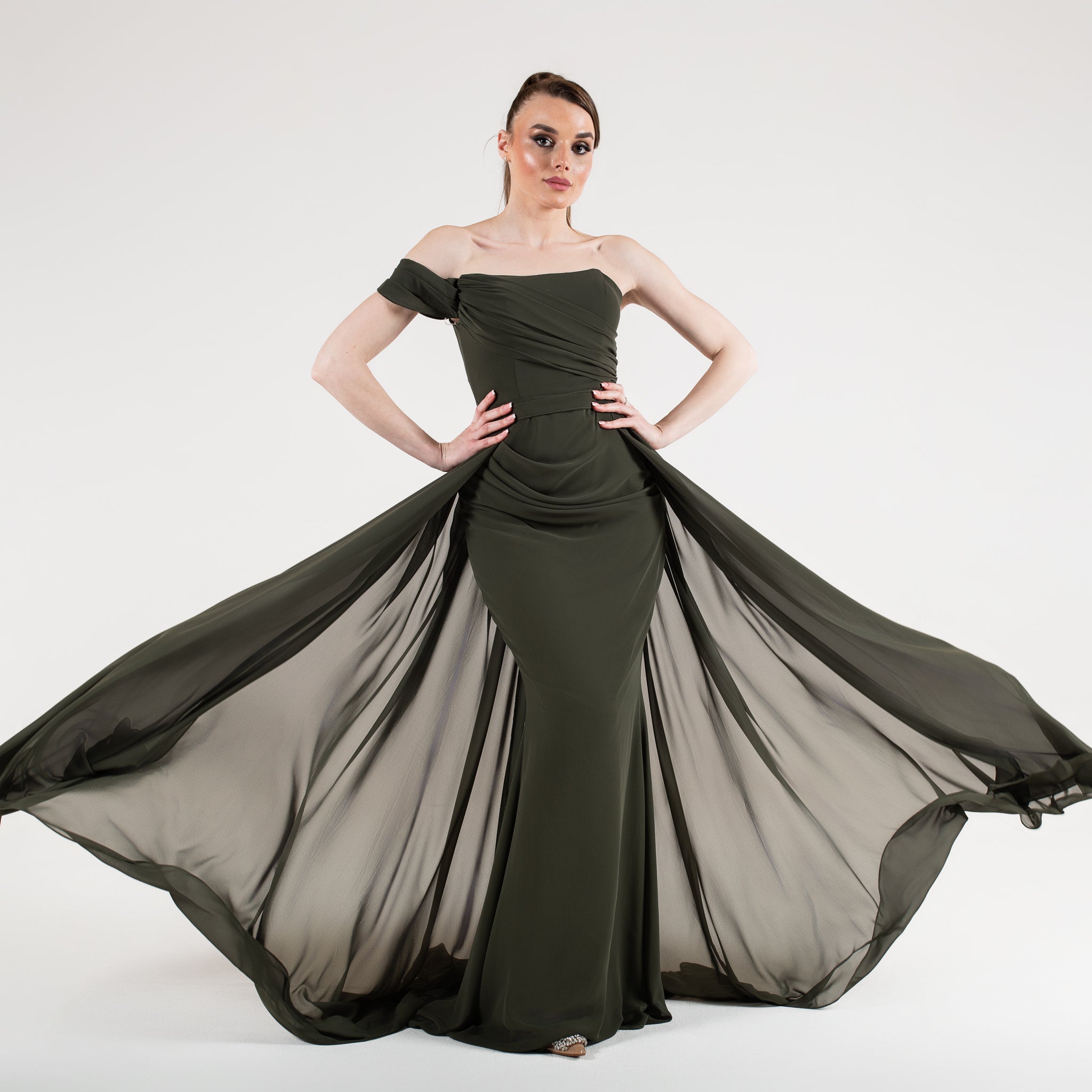 Cette somptueuse robe longue incarne l’élégance pure et la féminité affirmée. Confectionnée dans un tissu fluide et structuré, elle épouse parfaitement les courbes grâce à sa coupe sirène qui s’évase subtilement à partir des genoux, créant un effet dramatique et gracieux à l’arrière avec sa petite traîne. Son bustier asymétrique, délicatement drapé, laisse les épaules nues tout en offrant un maintien sophistiqué, accentué par une manche tombante romantique. Des jeux de plis sur le buste et au niveau des hanches ajoutent du relief et mettent en valeur la silhouette. Ce modèle est sublimé par une surjupe vaporeuse en mousseline ton sur ton, qui s’ouvre à l’avant et apporte volume, mouvement et une touche théâtrale irrésistible. Idéale pour une soirée de gala ou un événement formel, cette robe allie sensualité, raffinement et prestance avec un charme incontestable.