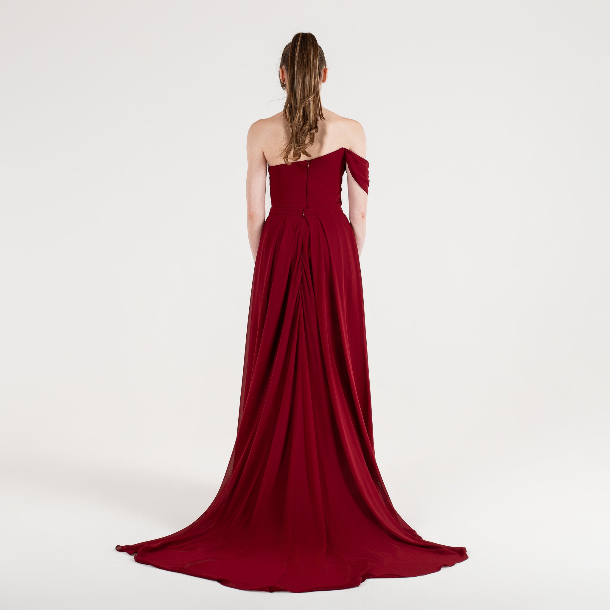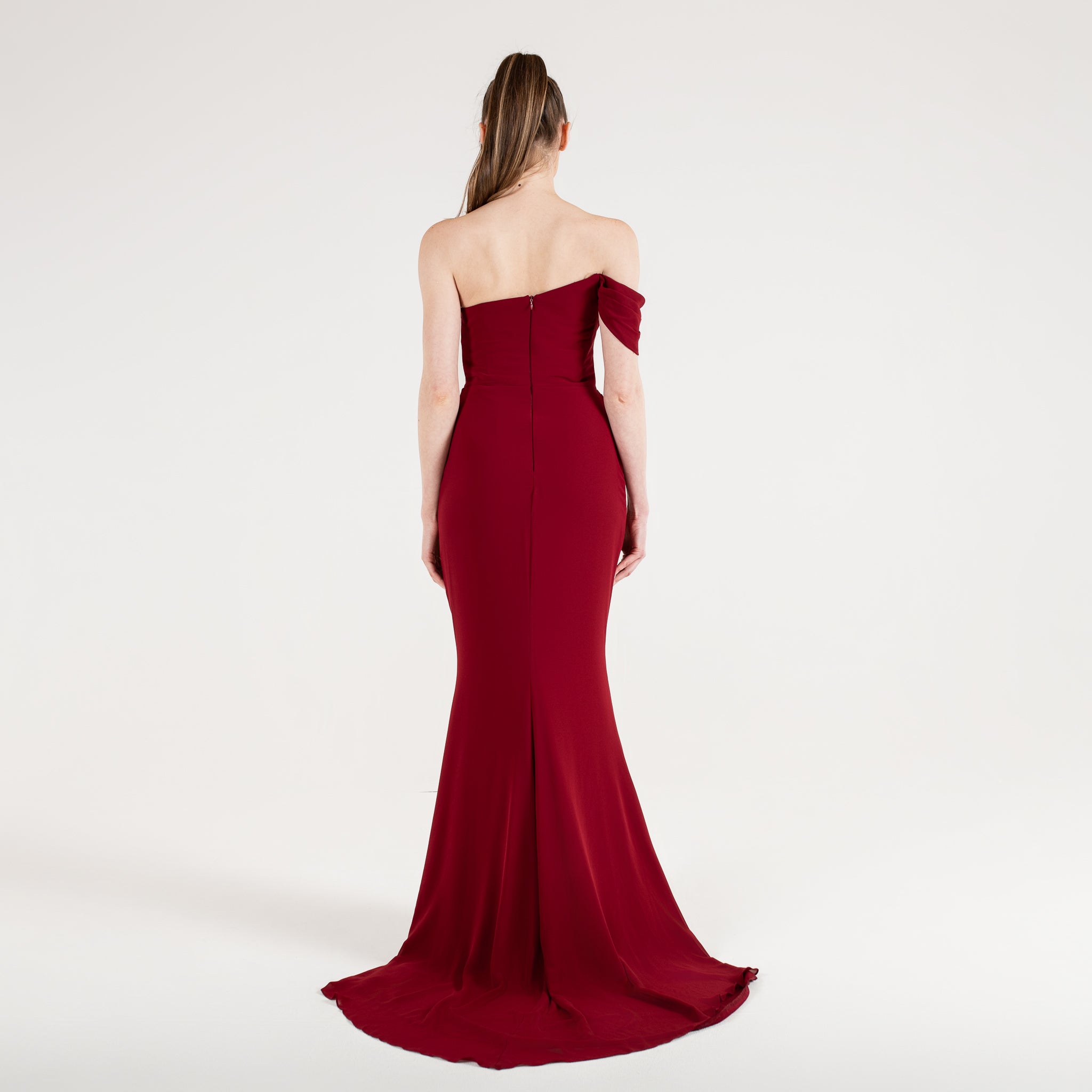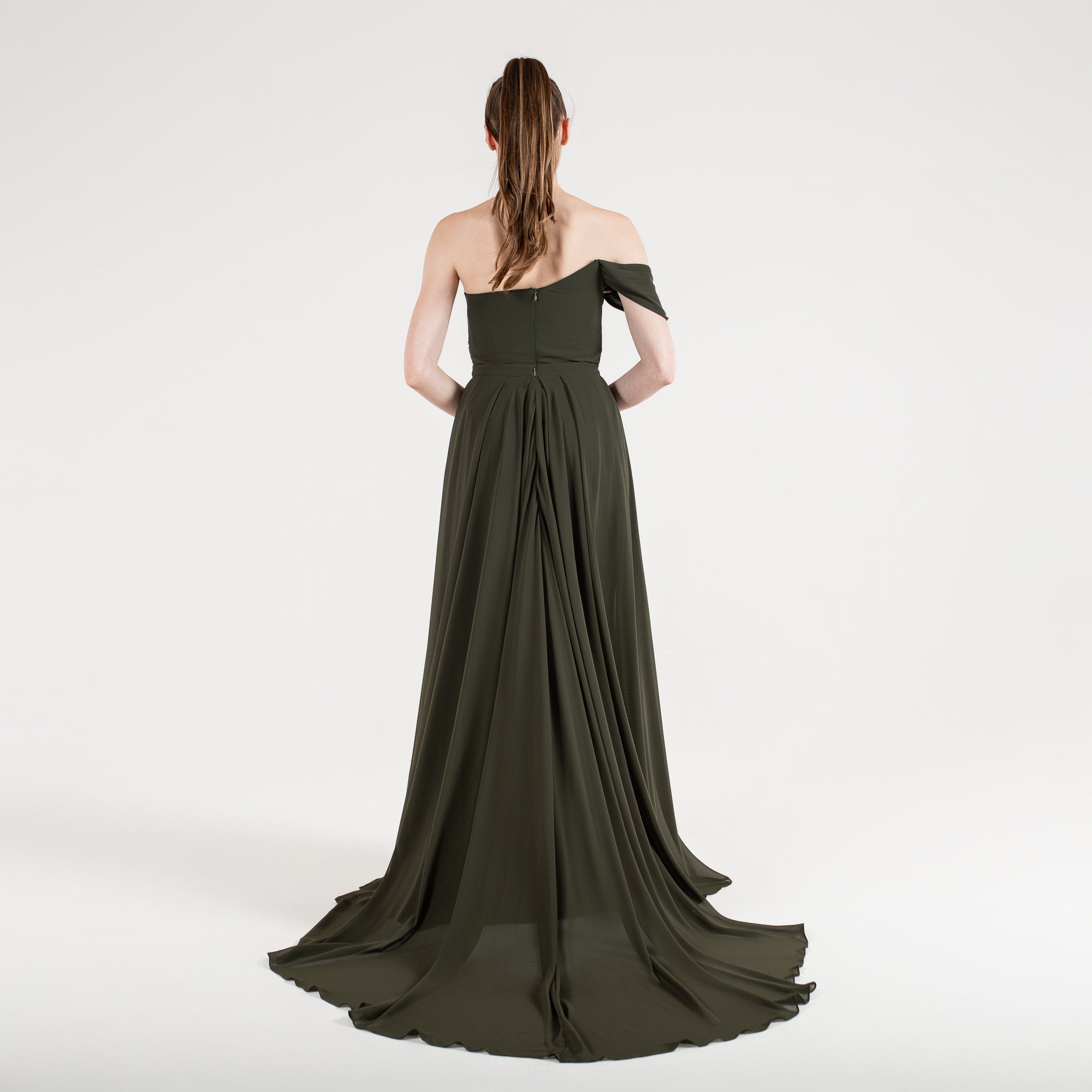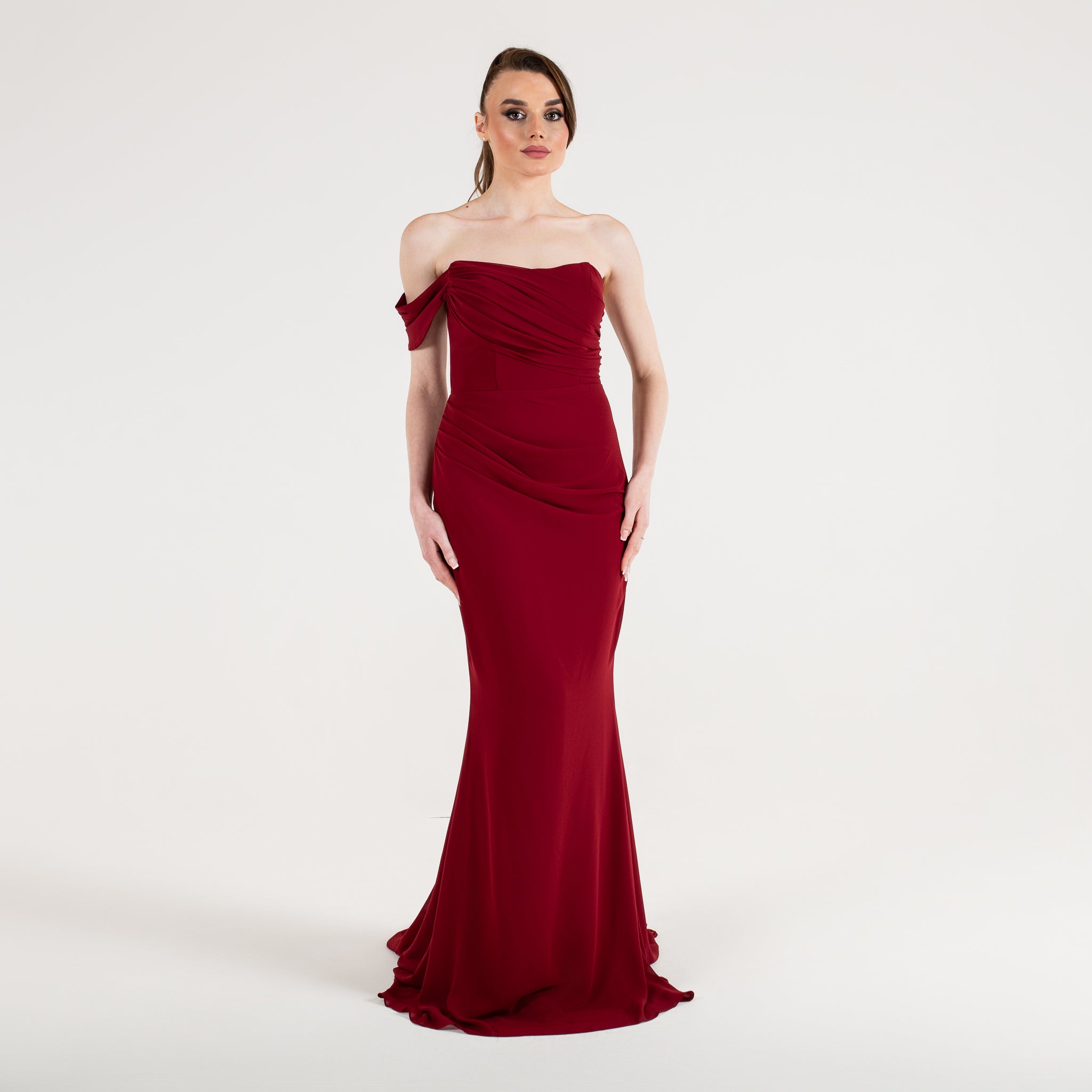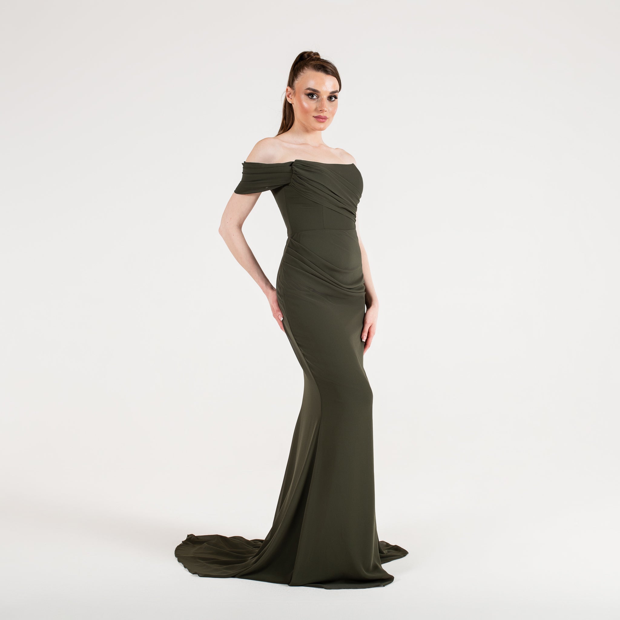 Cette somptueuse robe longue incarne l’élégance pure et la féminité affirmée. Confectionnée dans un tissu fluide et structuré, elle épouse parfaitement les courbes grâce à sa coupe sirène qui s’évase subtilement à partir des genoux, créant un effet dramatique et gracieux à l’arrière avec sa petite traîne. Son bustier asymétrique, délicatement drapé, laisse les épaules nues tout en offrant un maintien sophistiqué, accentué par une manche tombante romantique. Des jeux de plis sur le buste et au niveau des hanches ajoutent du relief et mettent en valeur la silhouette. Ce modèle est sublimé par une surjupe vaporeuse en mousseline ton sur ton, qui s’ouvre à l’avant et apporte volume, mouvement et une touche théâtrale irrésistible. Idéale pour une soirée de gala ou un événement formel, cette robe allie sensualité, raffinement et prestance avec un charme incontestable.