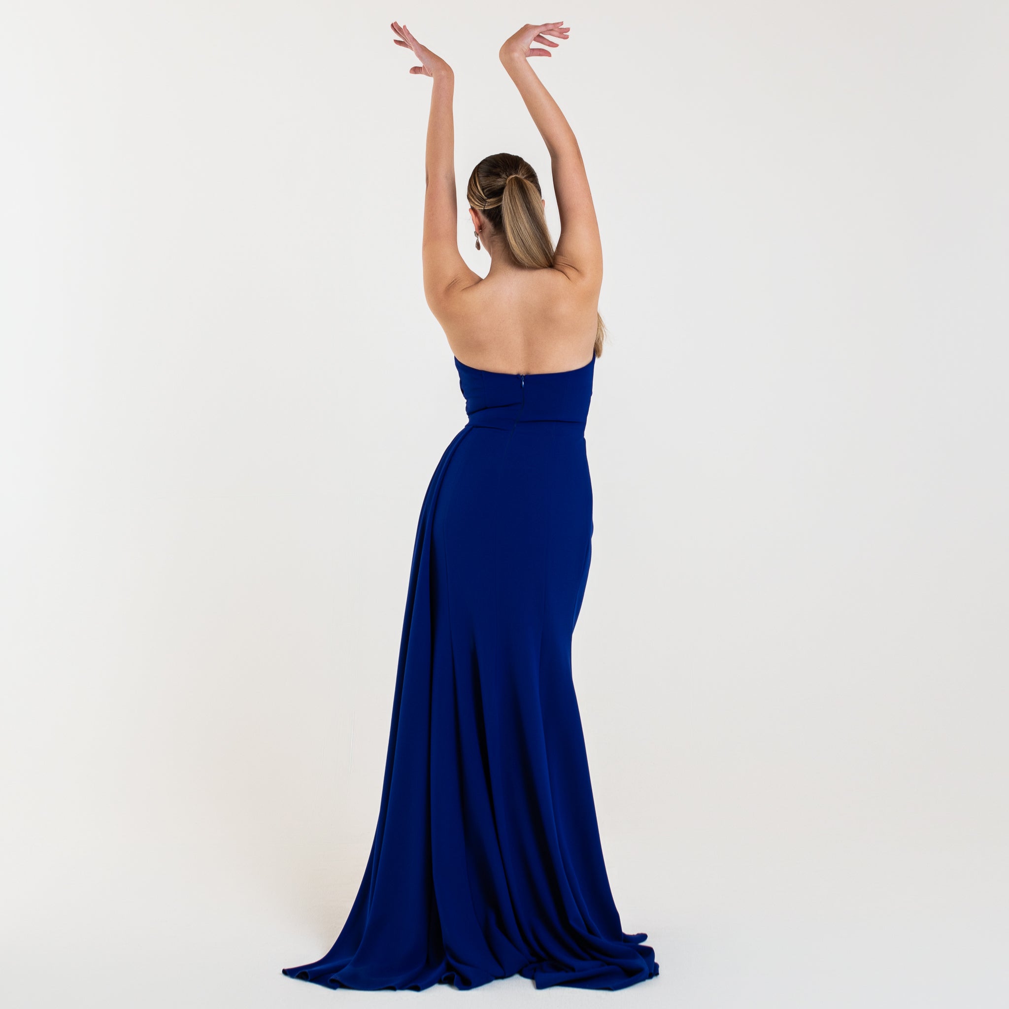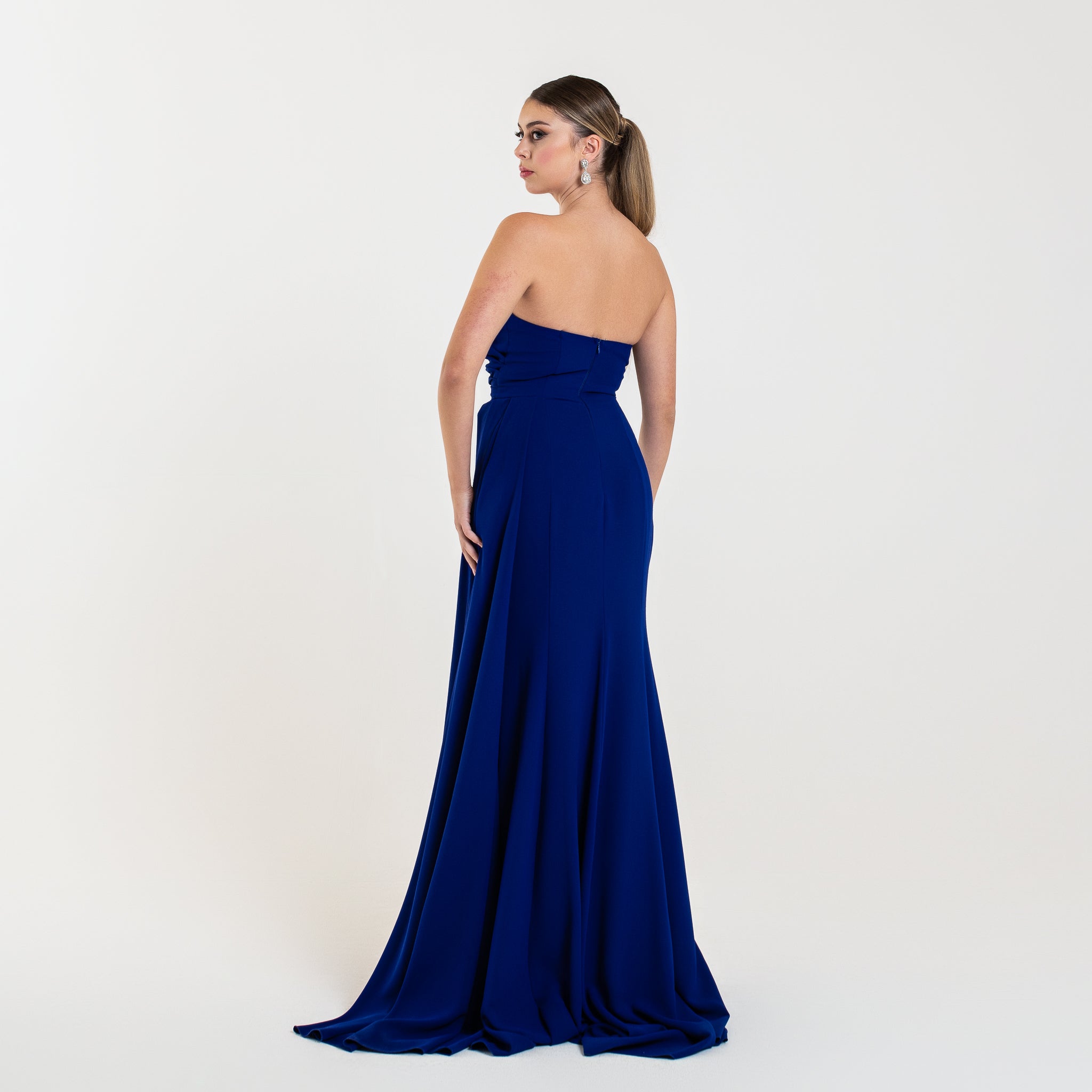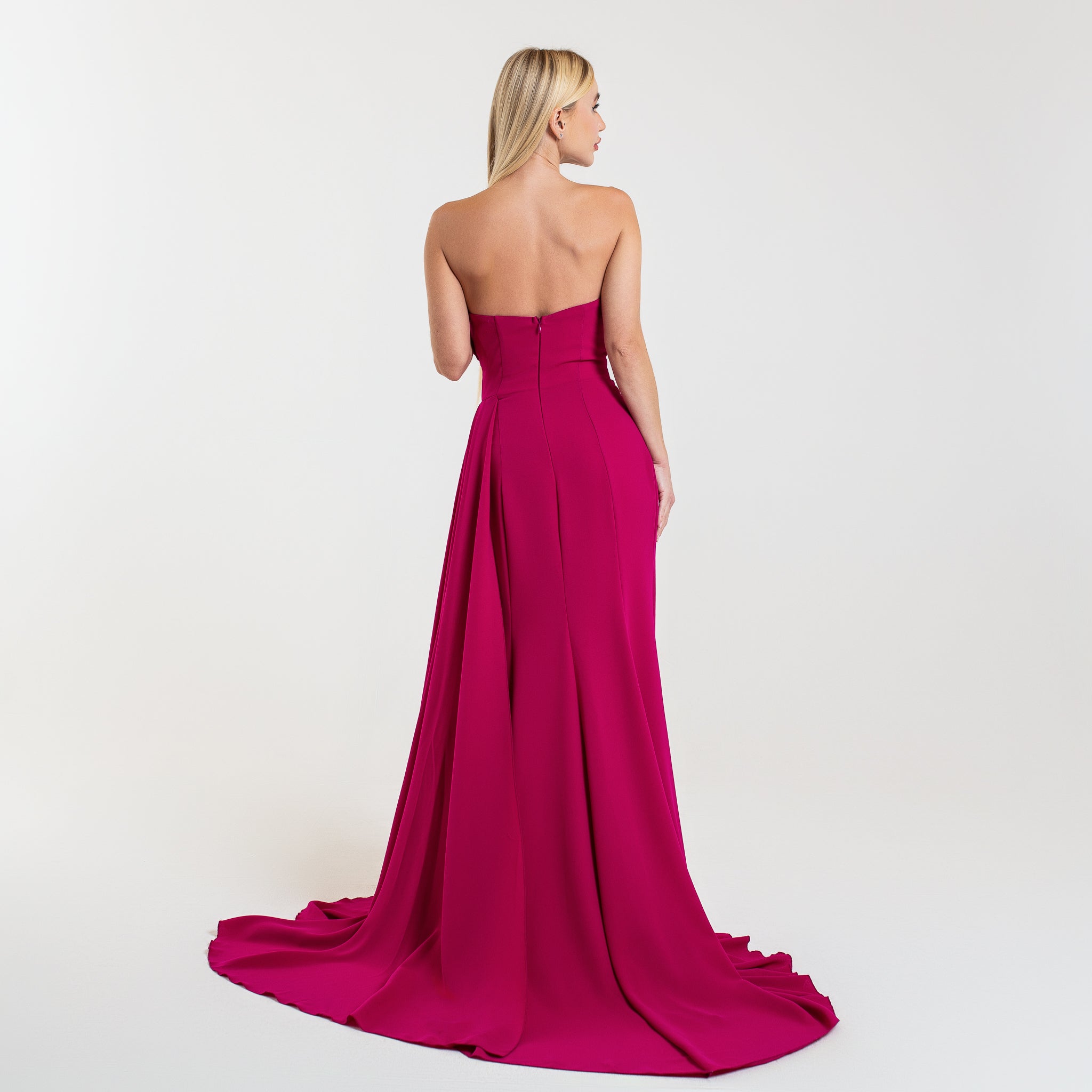 Cette robe est une pièce saisissante et élégante, parfaite pour un événement formel ou une soirée spéciale. Elle est de longueur longue et arbore une coupe bustier sans bretelles, mettant en valeur les épaules et le décolleté de manière raffinée. Le buste est structuré, avec un léger drapé qui ajoute de la texture et un effet flatteur sur la poitrine.