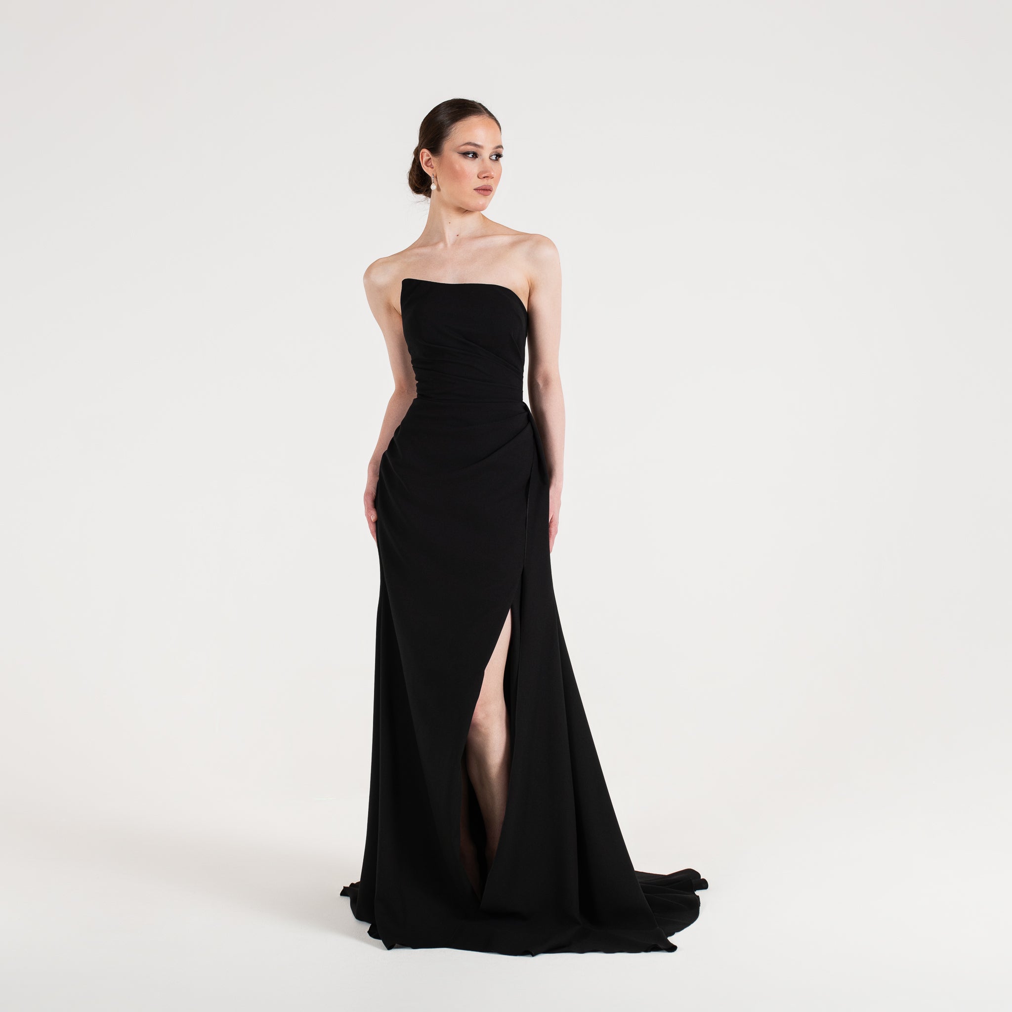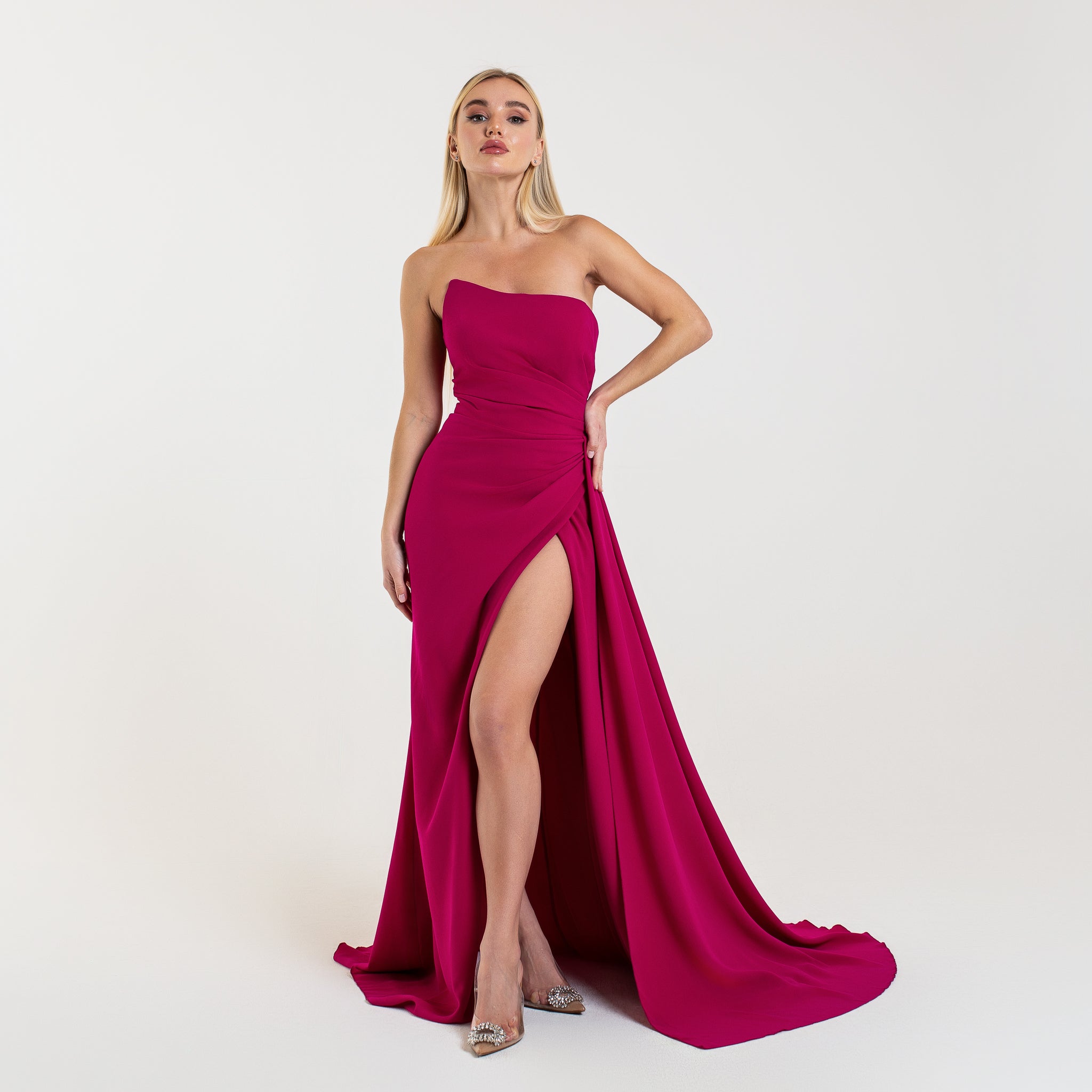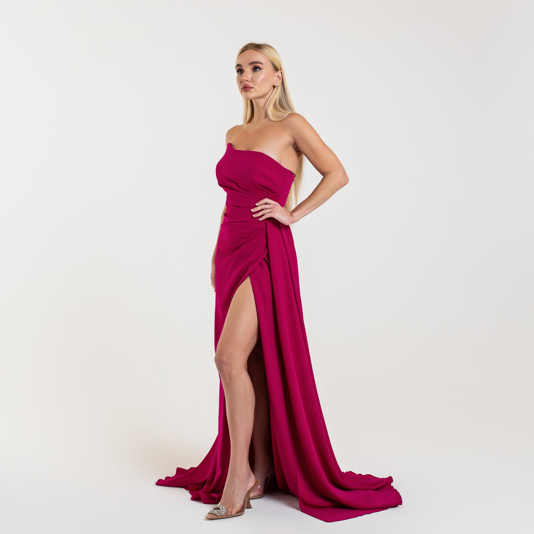 Cette robe est une pièce saisissante et élégante, parfaite pour un événement formel ou une soirée spéciale. Elle est de longueur longue et arbore une coupe bustier sans bretelles, mettant en valeur les épaules et le décolleté de manière raffinée. Le buste est structuré, avec un léger drapé qui ajoute de la texture et un effet flatteur sur la poitrine.