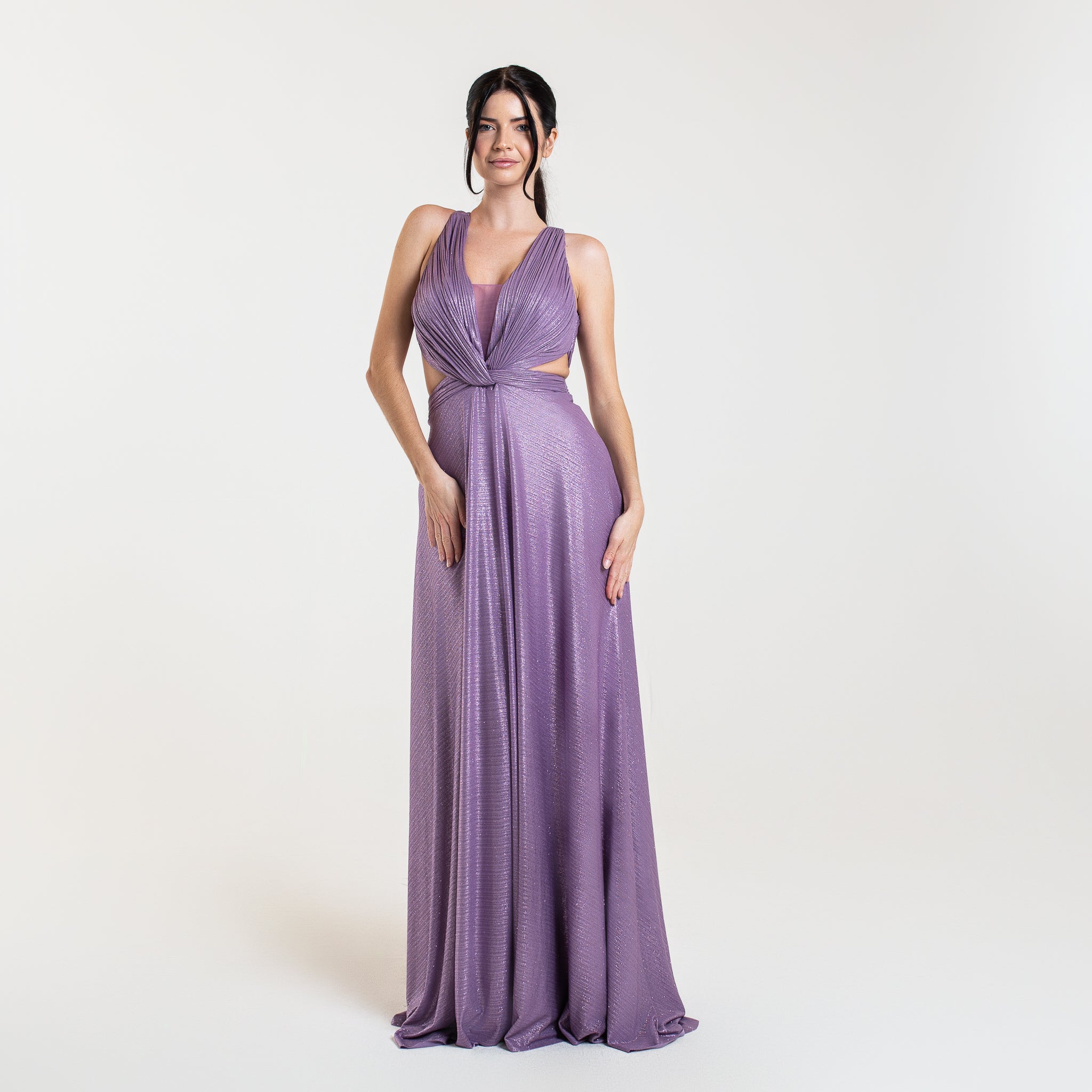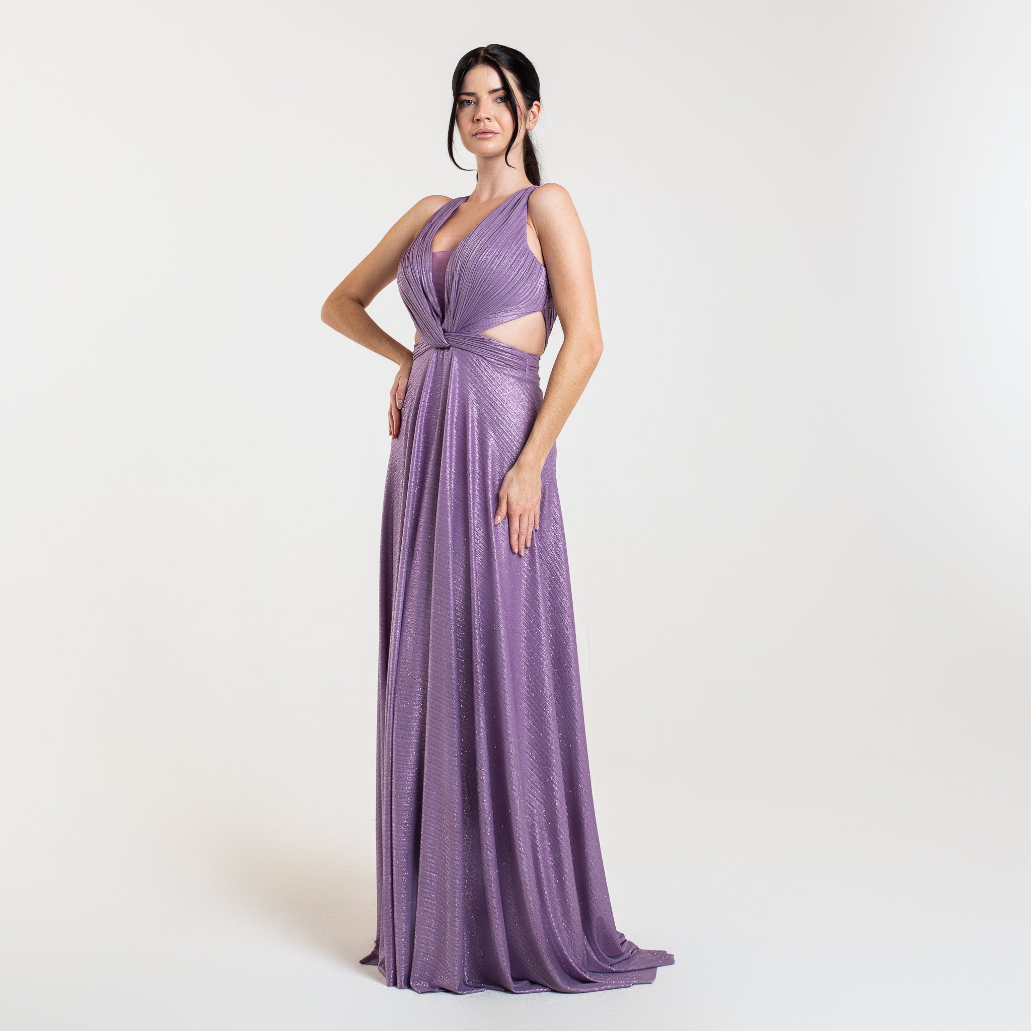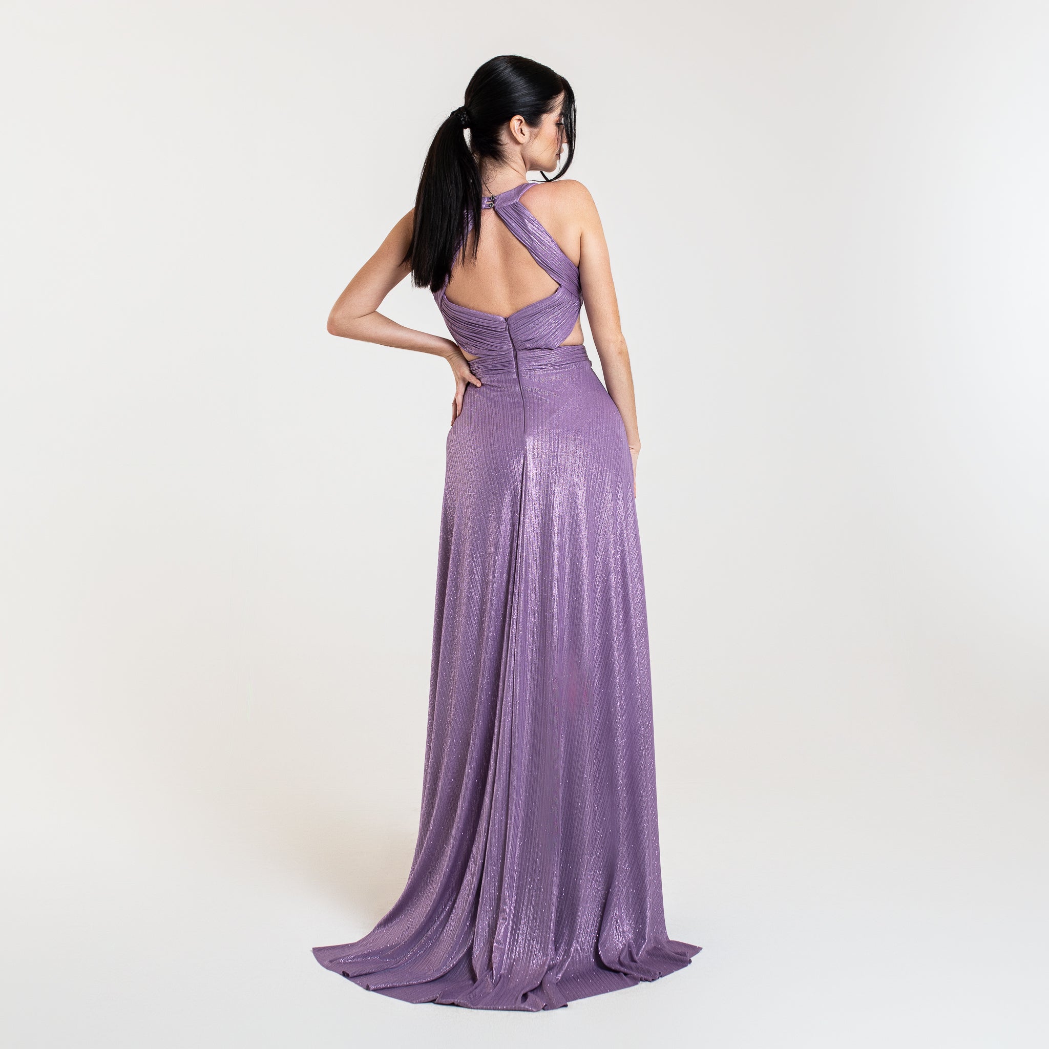Cette robe longue en tissu plissé fin et brillant offre à la fois élégance et fluidité. Avec son décolleté plongeant en V, un dos ouvert et une taille marquée par une bande de tissu plissé, elle met en valeur votre silhouette. Parfaite pour un gala, un mariage ou tout événement formel, elle allie un design classique et moderne pour une allure gracieuse.