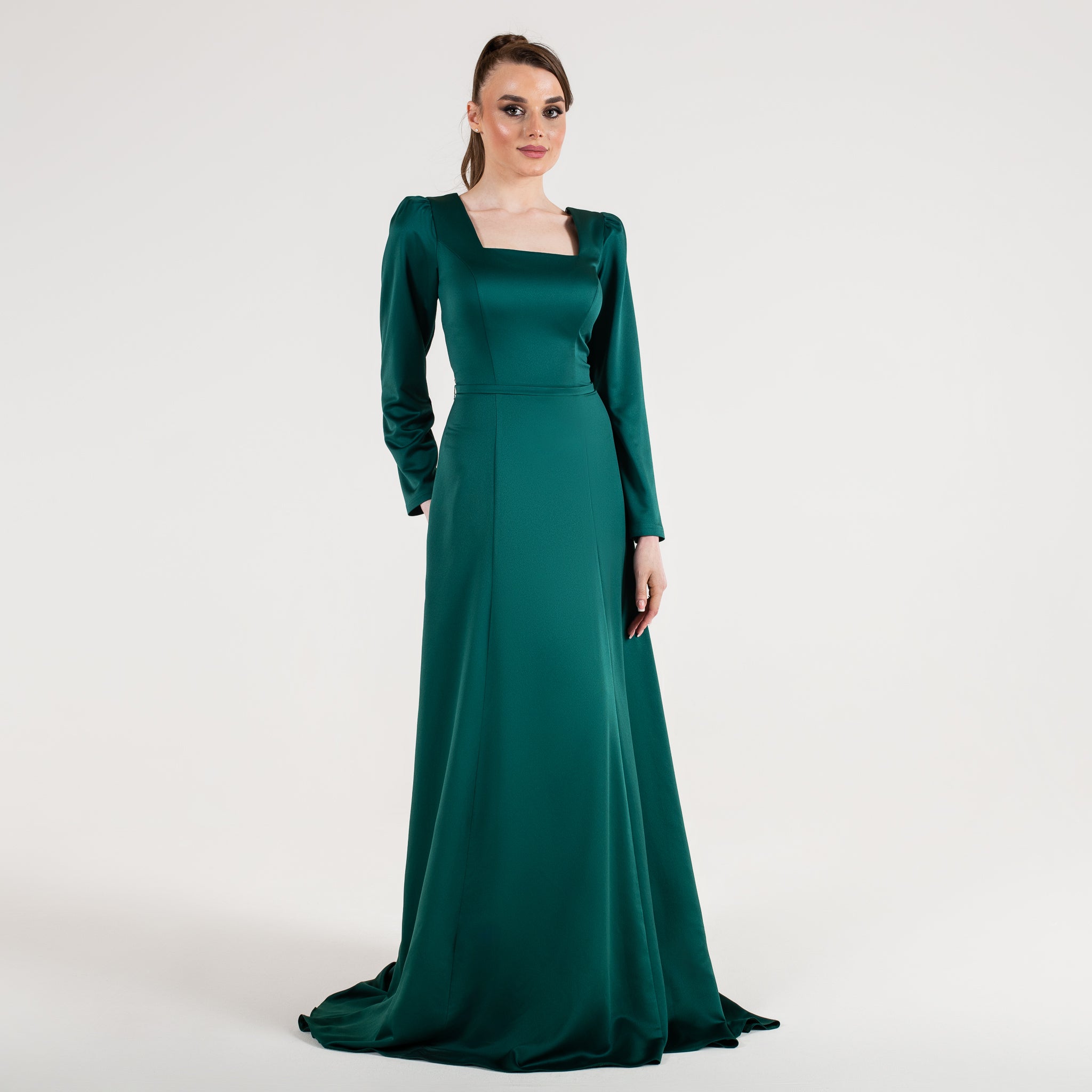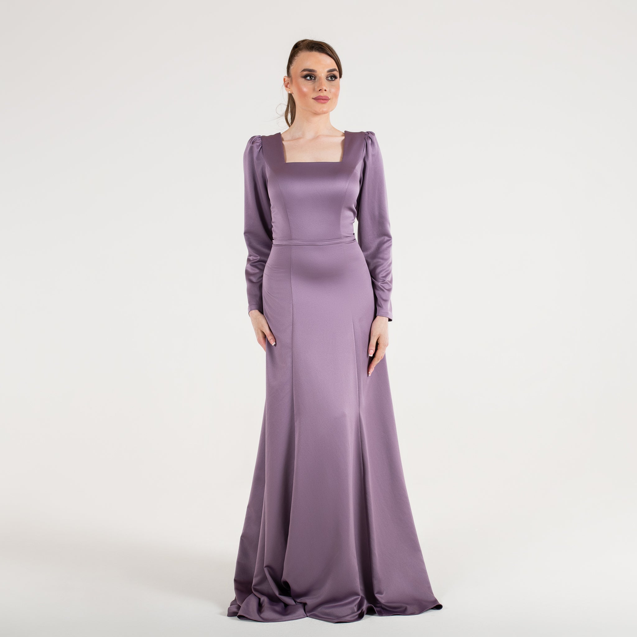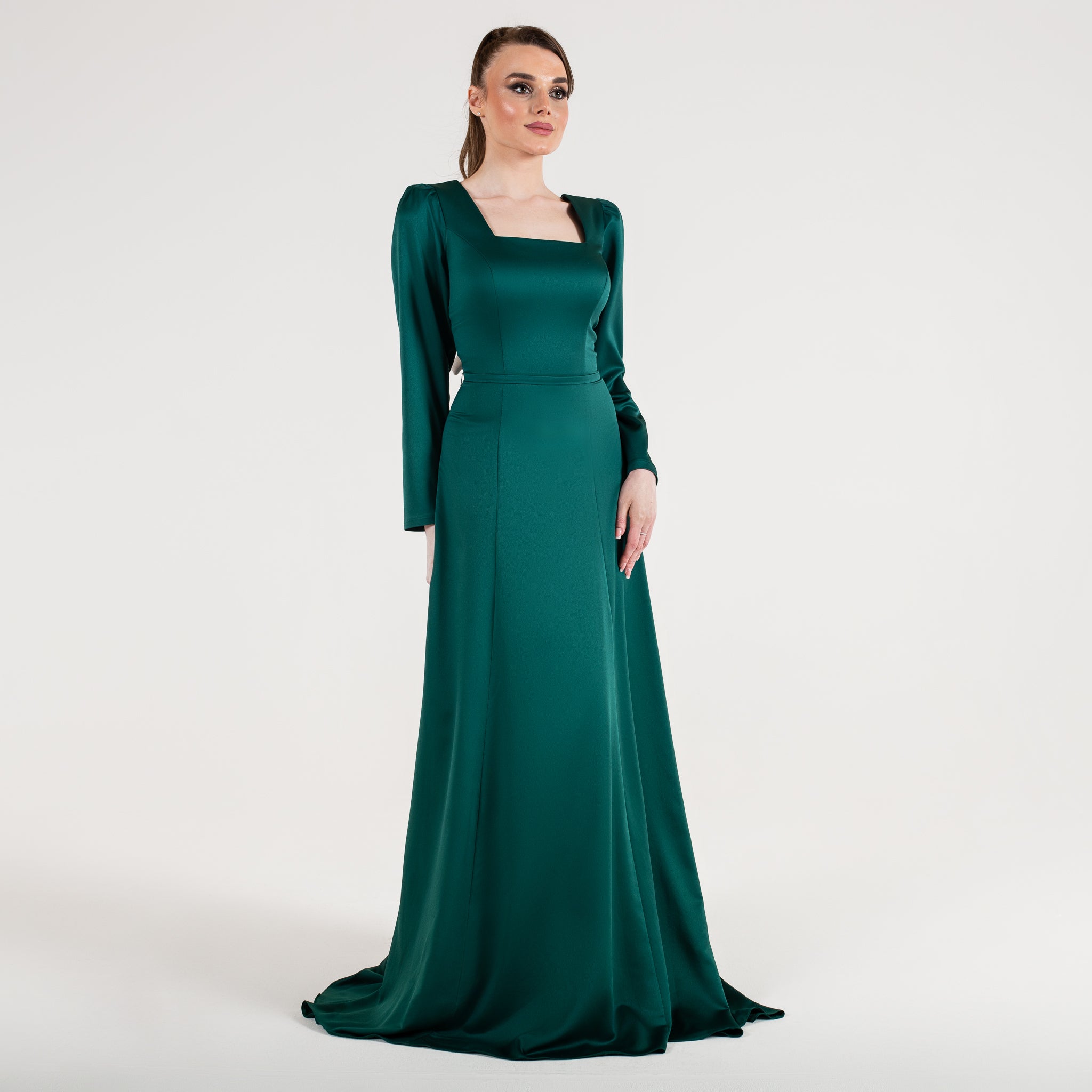 Cette somptueuse robe longue incarne l’élégance intemporelle avec une touche de modernité. Dotée d’un décolleté carré structuré, elle souligne avec finesse le port de tête tout en mettant en valeur le buste grâce à une coupe ajustée à la taille. Les manches longues légèrement bouffantes aux épaules ajoutent une touche de sophistication et d’équilibre à la silhouette élancée que dessine la jupe fluide, qui tombe avec grâce jusqu’au sol en formant une délicate traîne. Le dos, fermé par un zip discret, conserve l’harmonie du design et révèle subtilement la nuque avec un décolleté carré assorti à l’avant. Idéale pour une soirée chic, un gala ou une cérémonie, cette robe séduit par sa simplicité noble et sa fluidité majestueuse.
