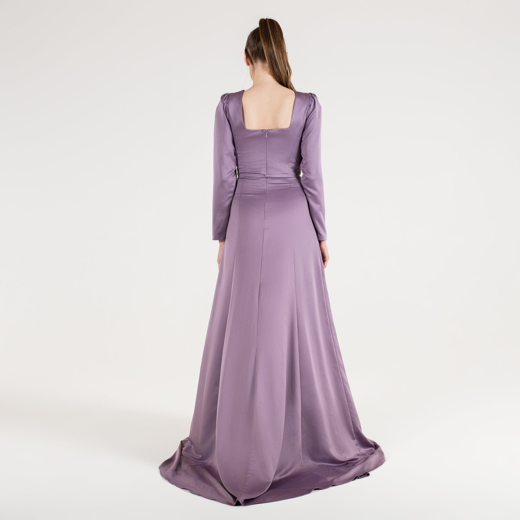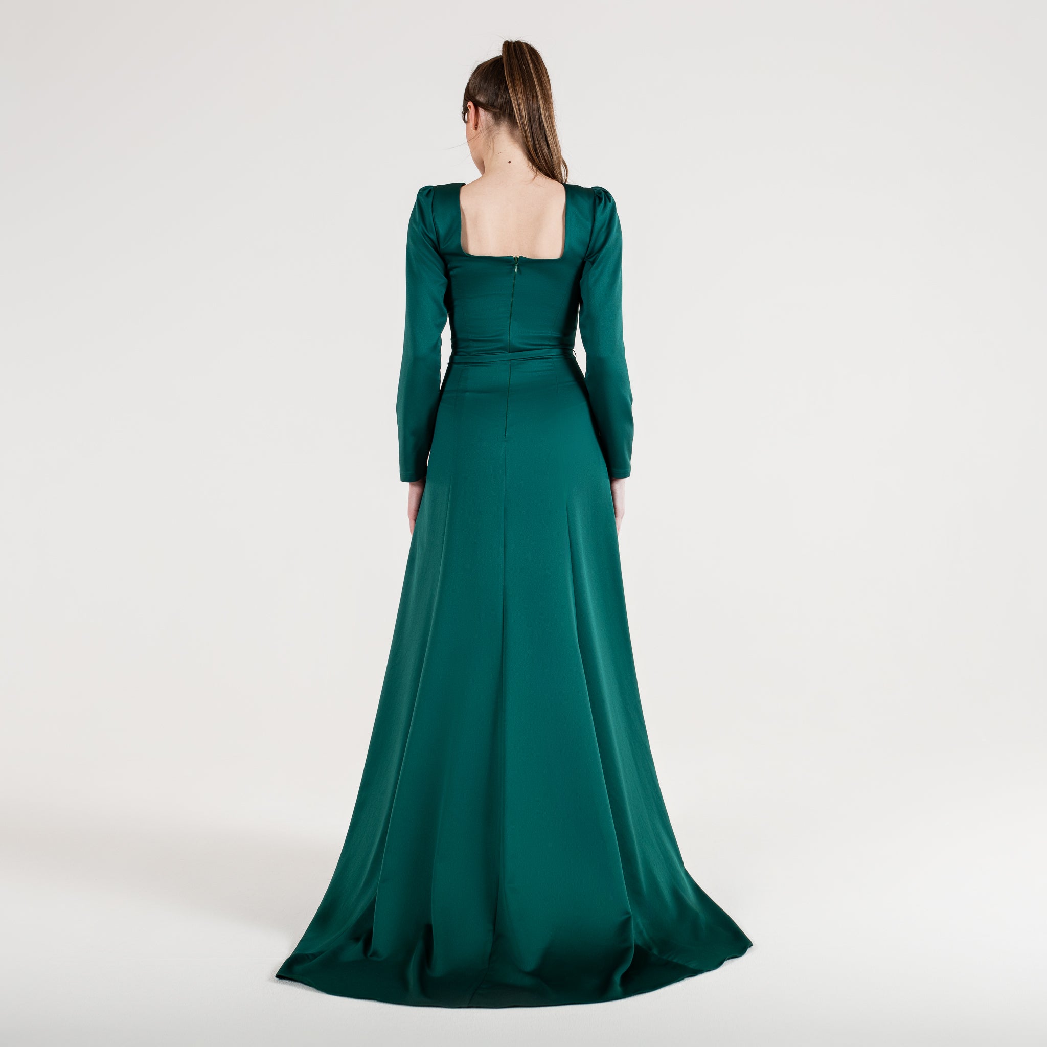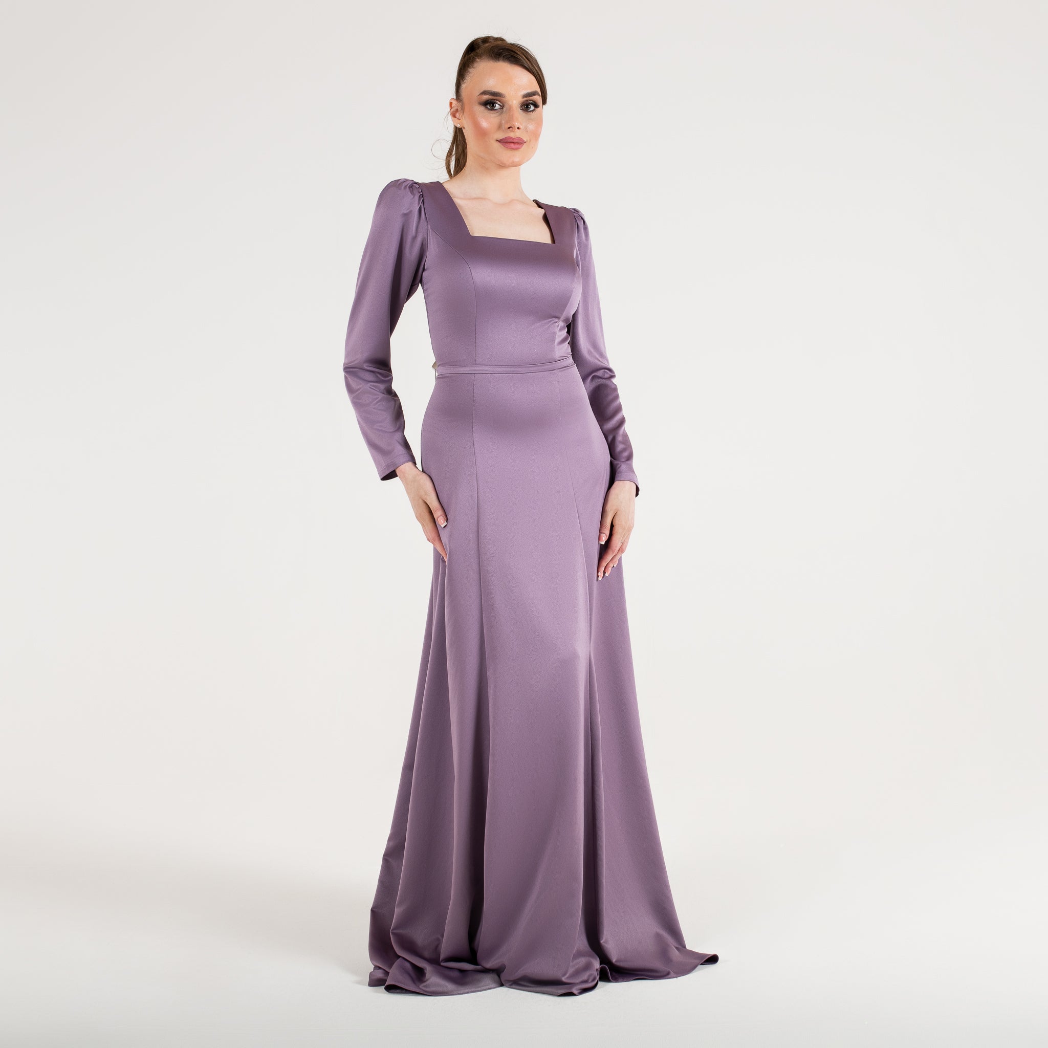 Cette somptueuse robe longue incarne l’élégance intemporelle avec une touche de modernité. Dotée d’un décolleté carré structuré, elle souligne avec finesse le port de tête tout en mettant en valeur le buste grâce à une coupe ajustée à la taille. Les manches longues légèrement bouffantes aux épaules ajoutent une touche de sophistication et d’équilibre à la silhouette élancée que dessine la jupe fluide, qui tombe avec grâce jusqu’au sol en formant une délicate traîne. Le dos, fermé par un zip discret, conserve l’harmonie du design et révèle subtilement la nuque avec un décolleté carré assorti à l’avant. Idéale pour une soirée chic, un gala ou une cérémonie, cette robe séduit par sa simplicité noble et sa fluidité majestueuse.