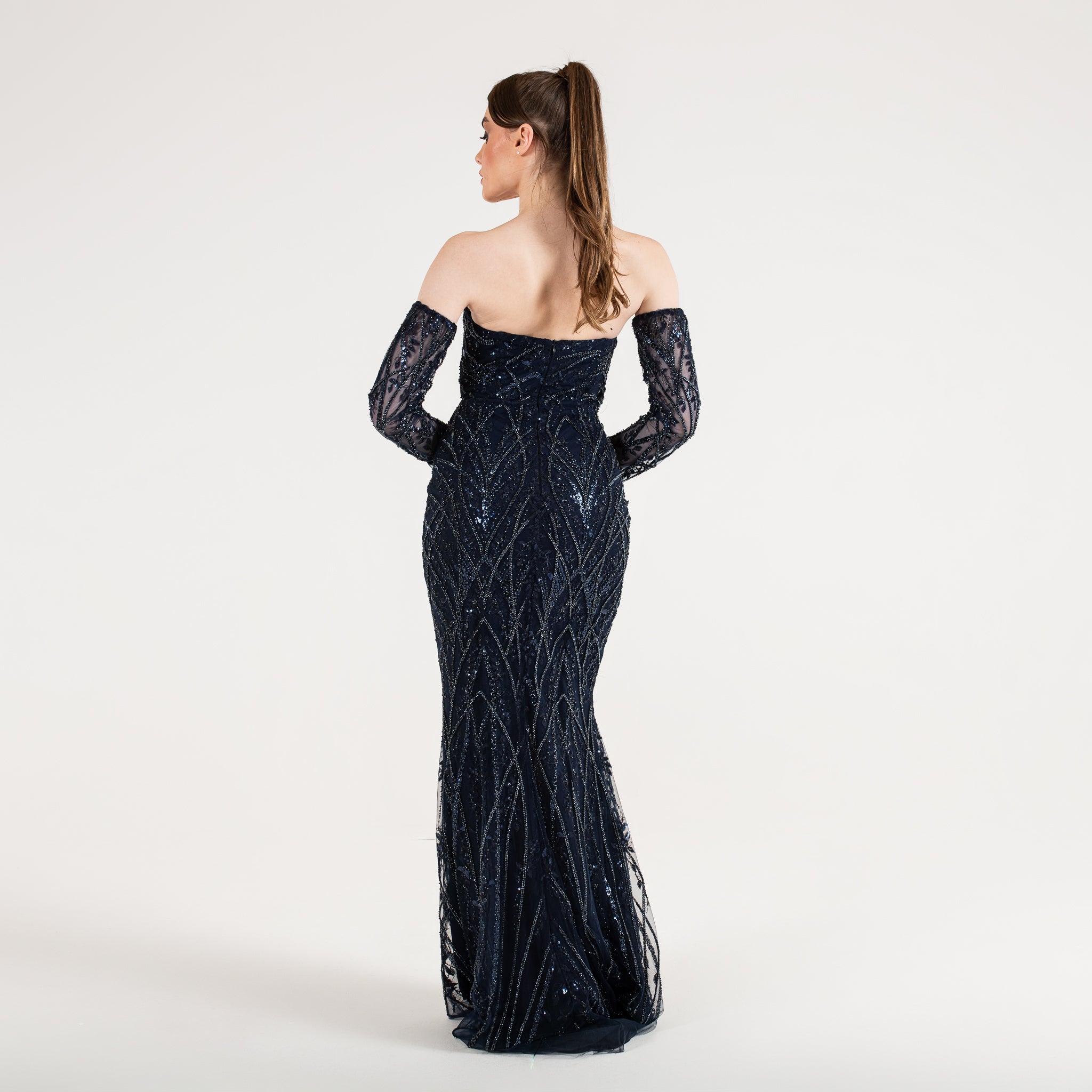 Cette robe longue et ajustée épouse parfaitement les courbes du corps avec une coupe sirène élégante qui s’évase légèrement à partir des genoux. Elle se distingue par son bustier en forme de cœur qui laisse les épaules dégagées, mettant en valeur le décolleté et la nuque. Les manches longues et détachables sont confectionnées dans un tissu semi-transparent richement orné de perles et de sequins, créant un effet visuel raffiné et luxueux. Le tissu principal est intégralement brodé de motifs géométriques et organiques scintillants, apportant éclat et sophistication à l’ensemble. Le dos est dégagé et structuré, offrant une allure aussi gracieuse de face que de dos, idéale pour des soirées élégantes ou des occasions spéciales.