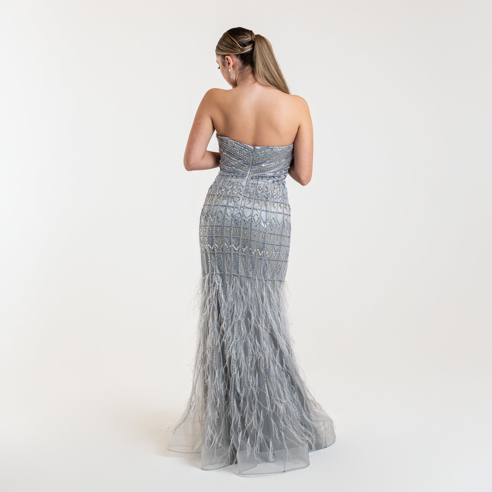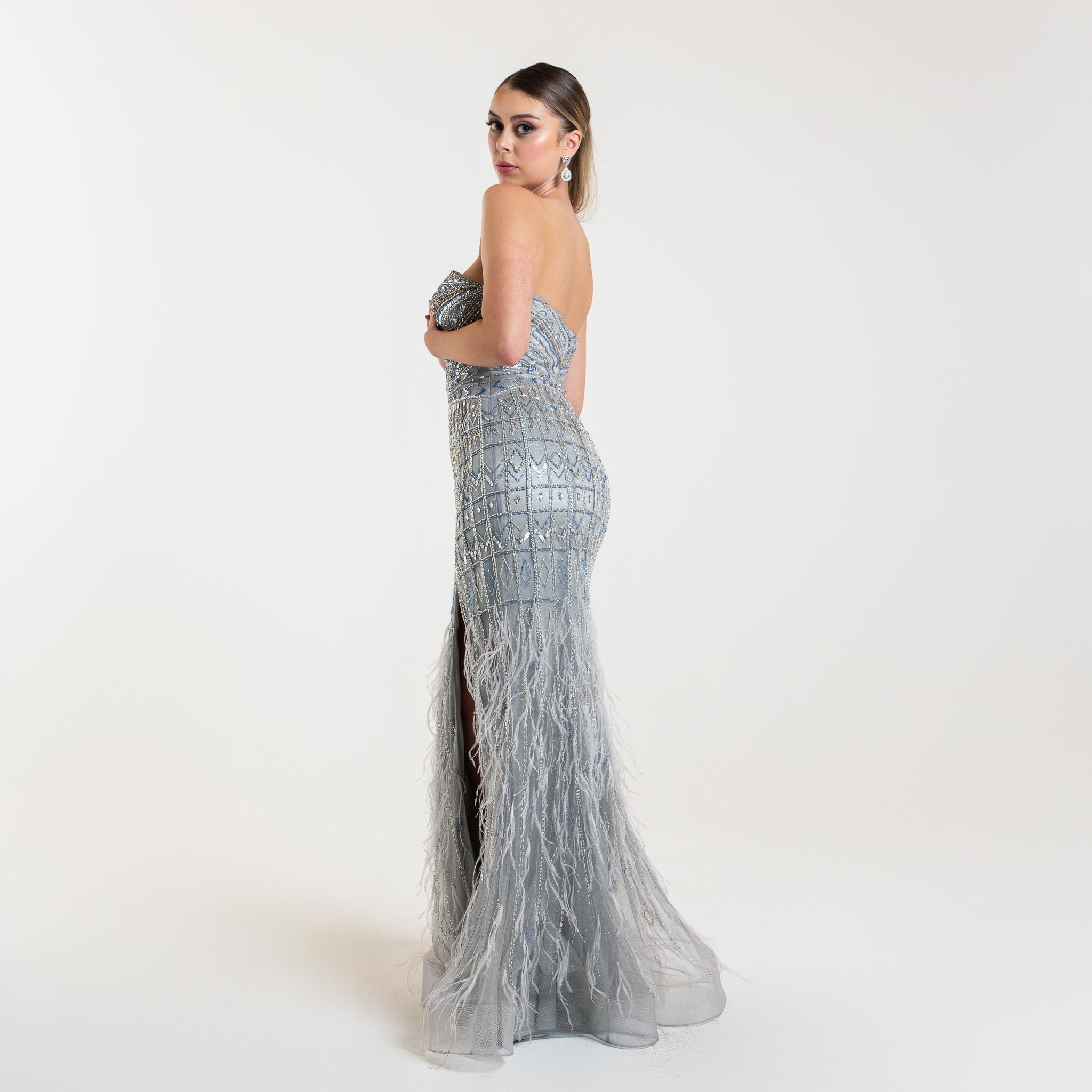La robe Exclusive ELEA est une pièce sophistiquée ornée de motifs perlés et scintillants pour un look glamour. Son décolleté en cœur ajoute une touche féminine, tandis que la partie inférieure est ornée de plumes légères pour un mouvement élégant. Disponible en couleur bleu argenté, elle est parfaite pour les soirées et événements prestigieux.