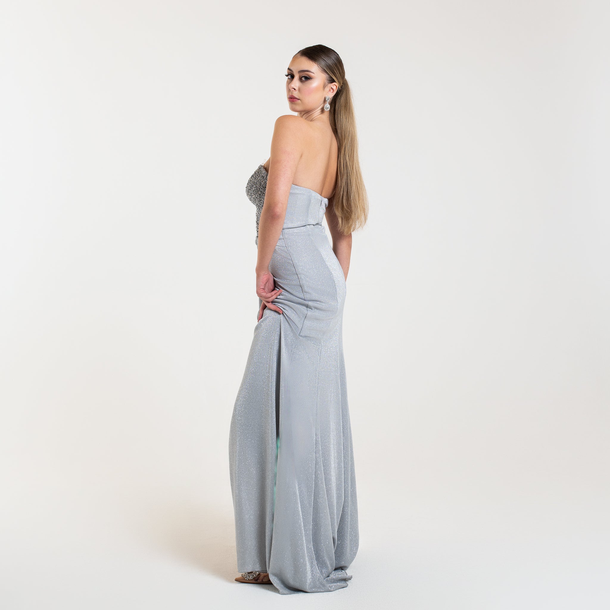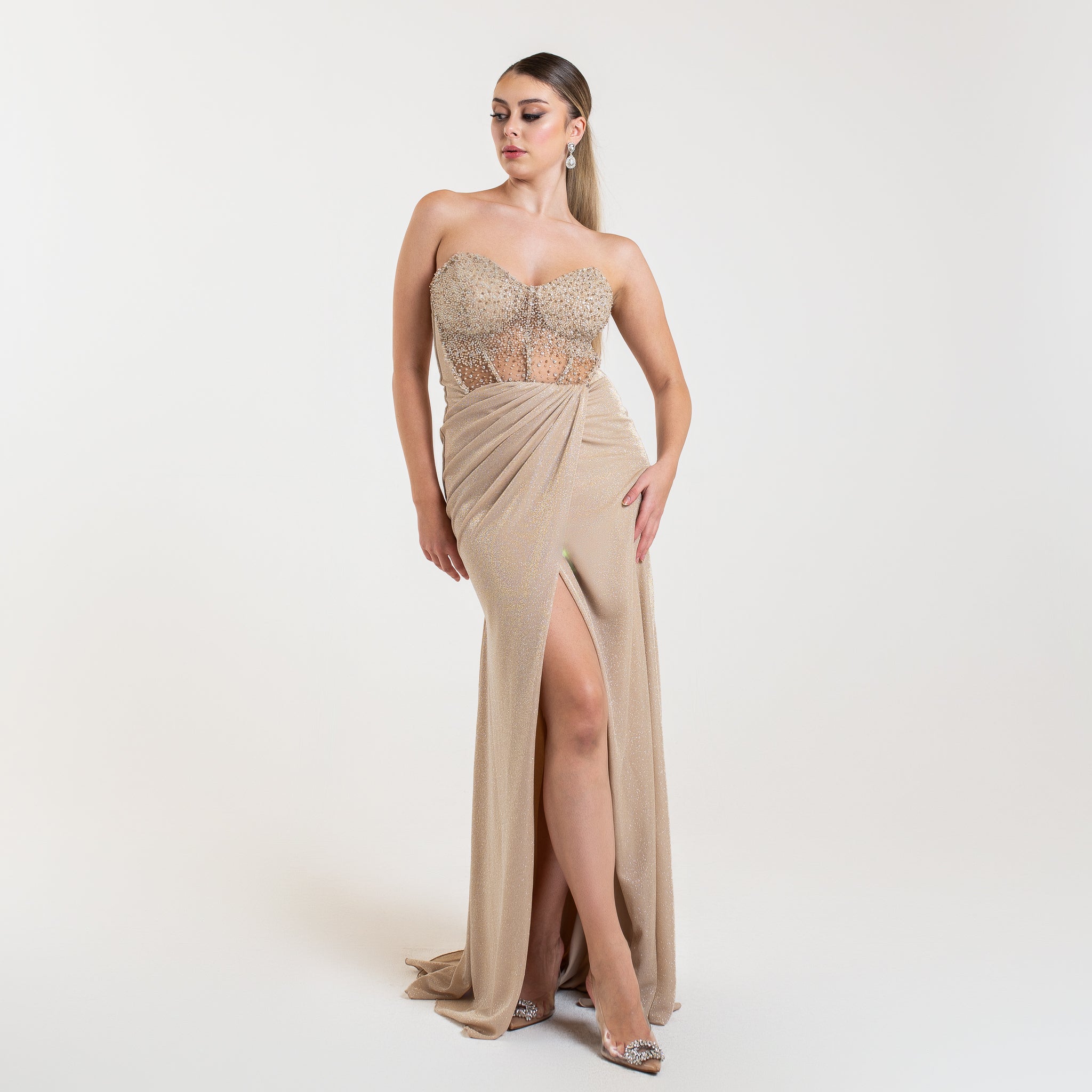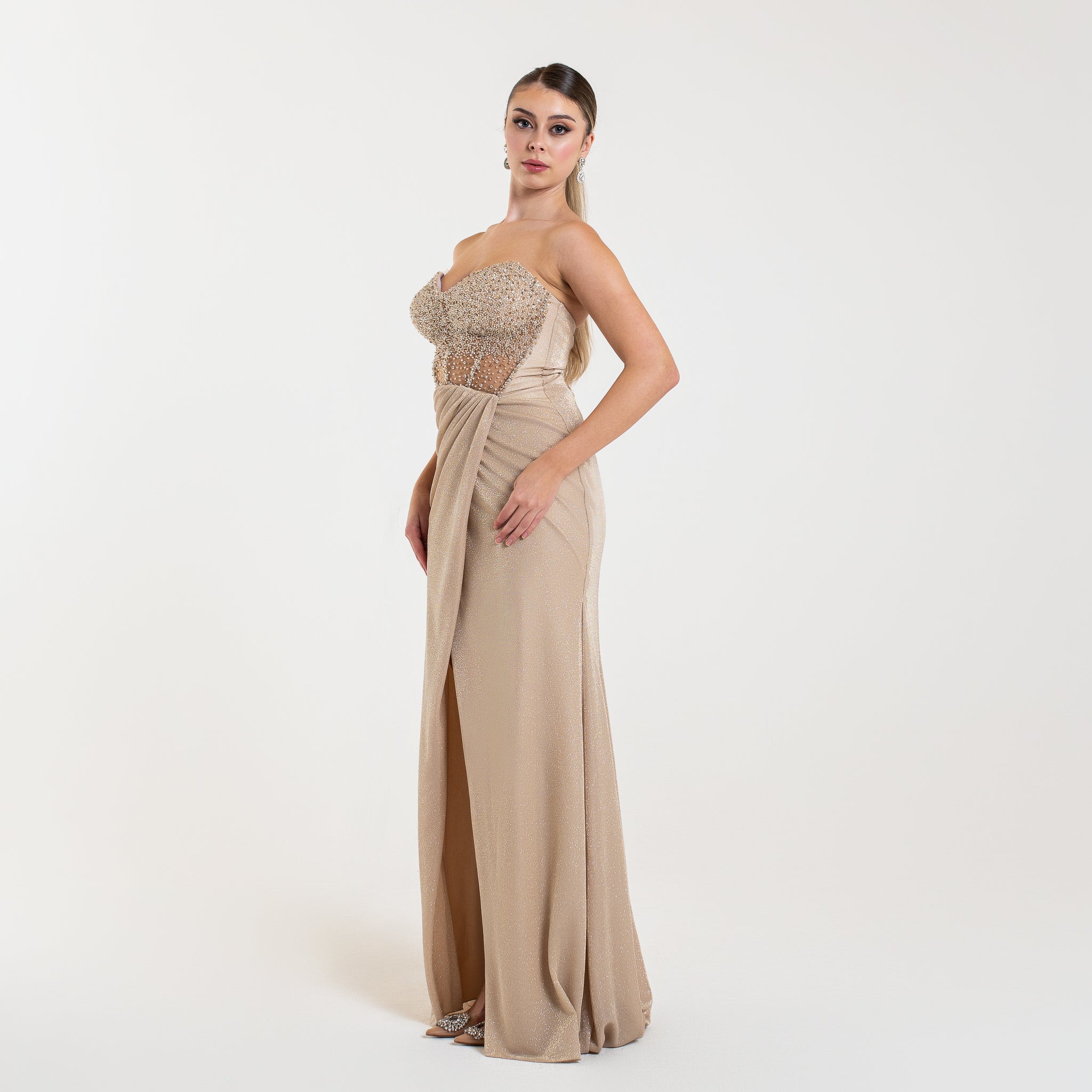 La robe LYANA est un modèle élégant et étincelant. Son corsage orné de cristaux et perles apporte un effet lumineux et glamour, tandis que le drapé fluide et la fente haute accentuent la silhouette de façon sensuelle. Idéale pour une soirée formelle ou un événement chic.
