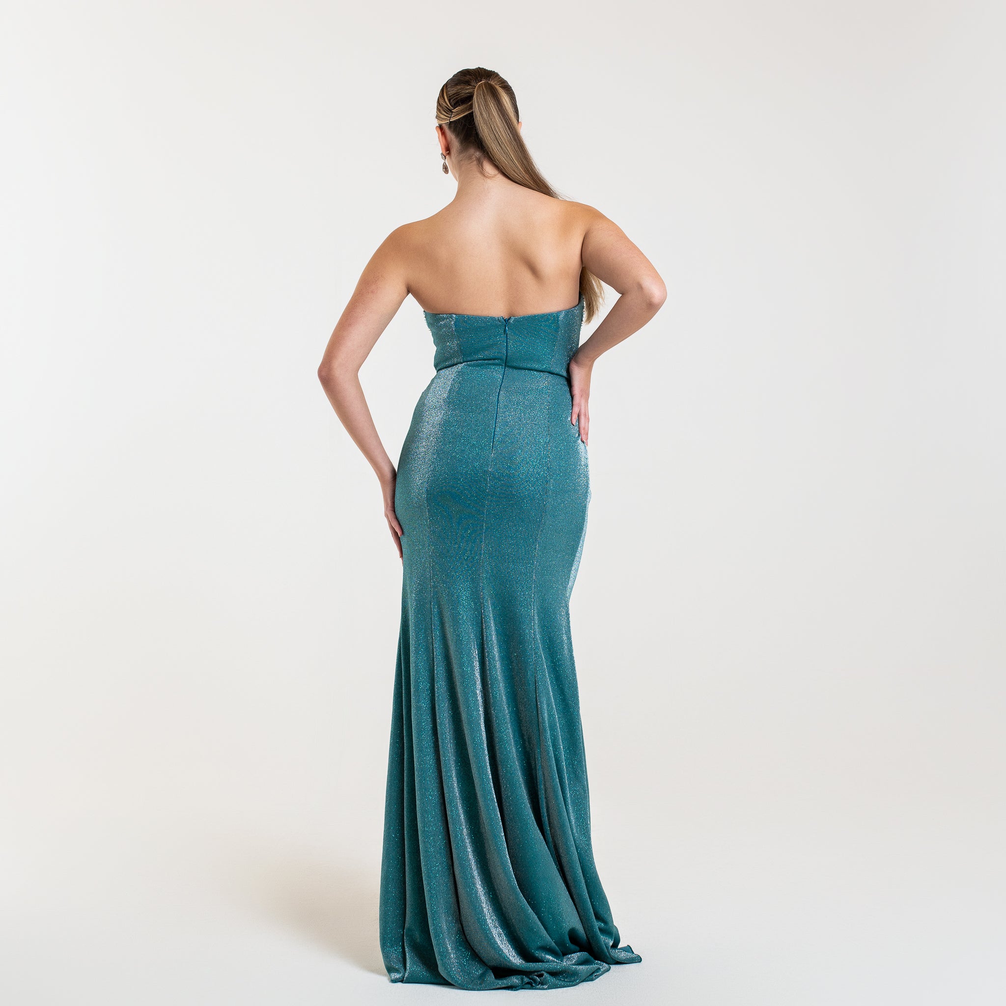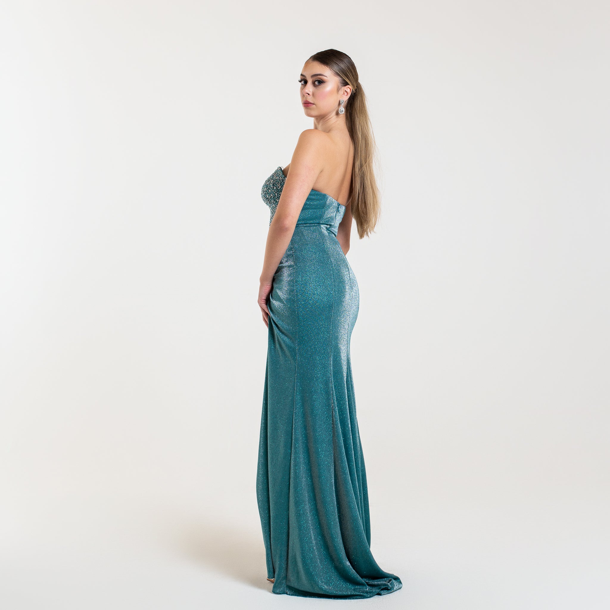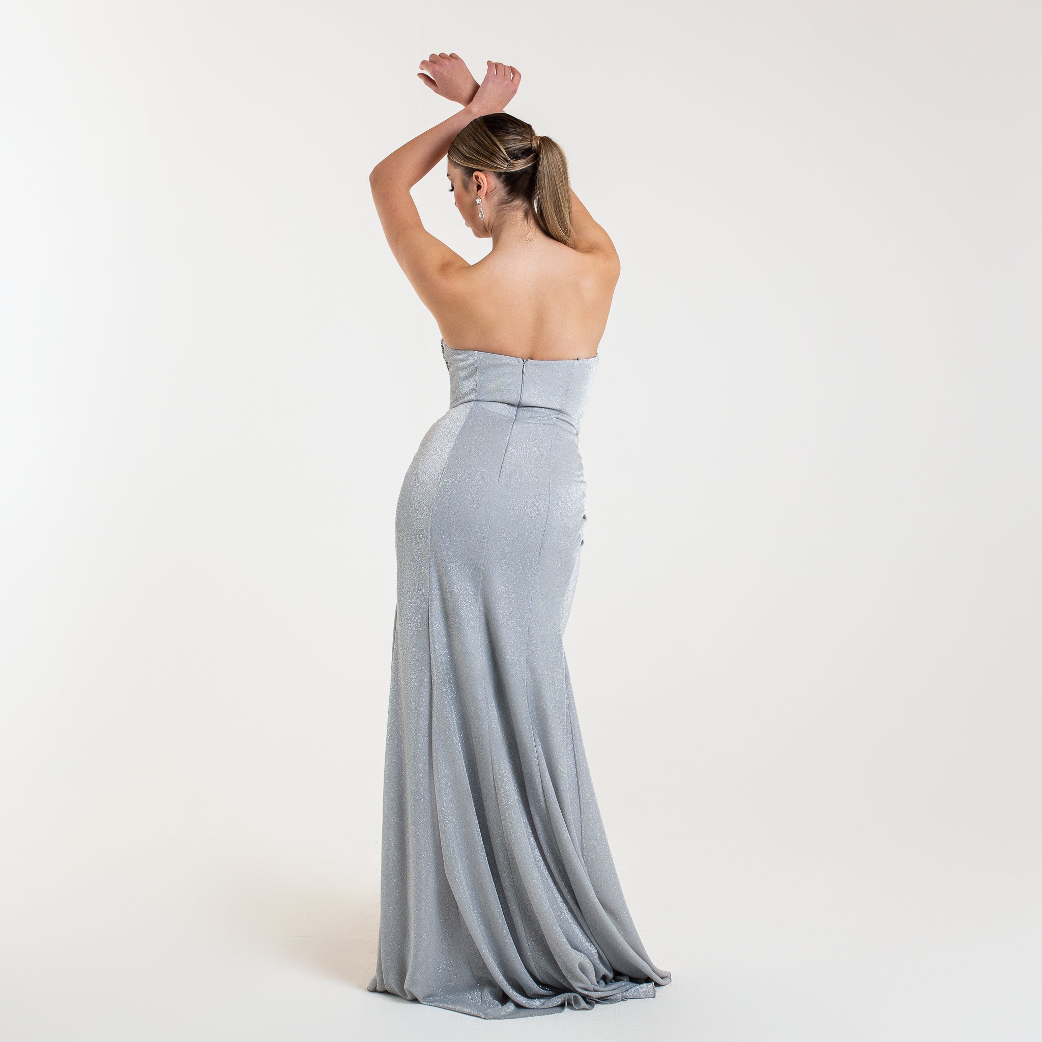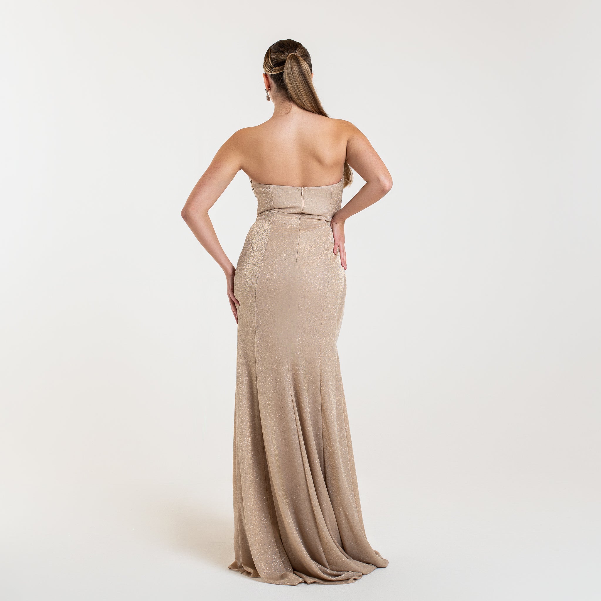 La robe LYANA est un modèle élégant et étincelant. Son corsage orné de cristaux et perles apporte un effet lumineux et glamour, tandis que le drapé fluide et la fente haute accentuent la silhouette de façon sensuelle. Idéale pour une soirée formelle ou un événement chic.
