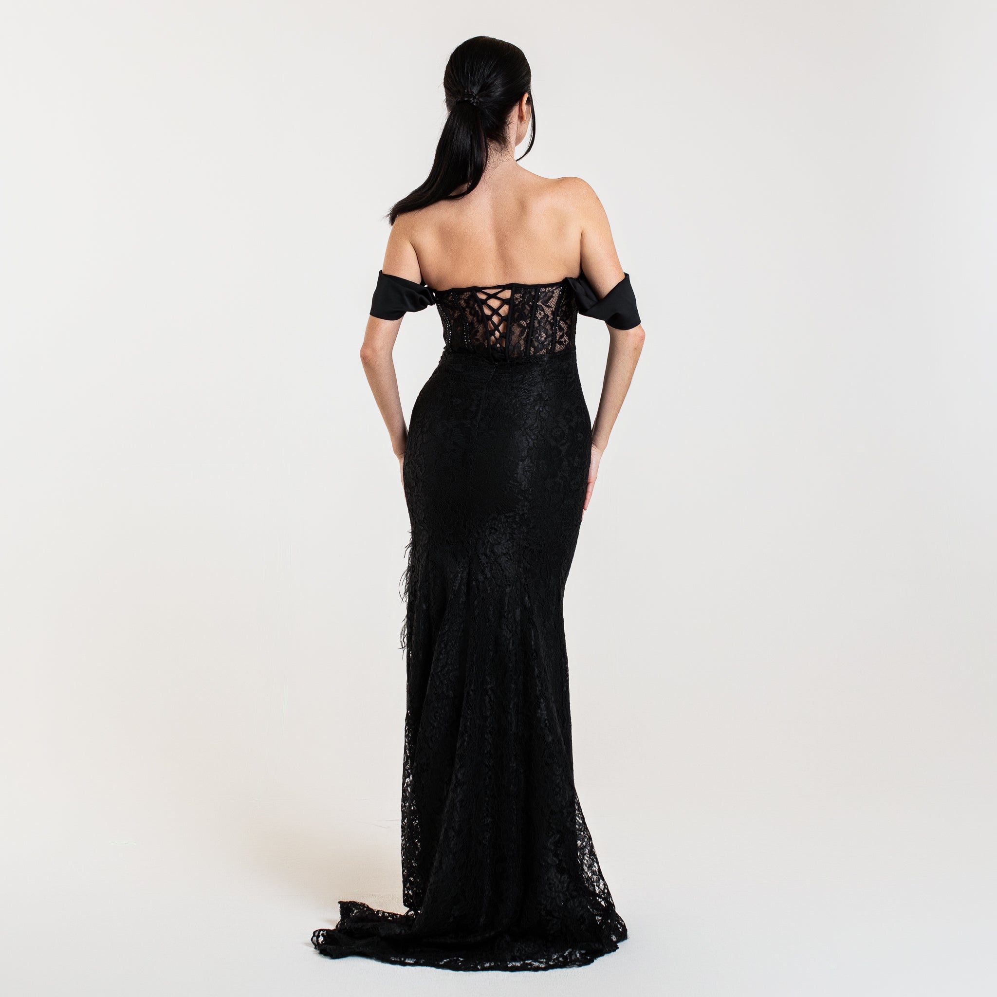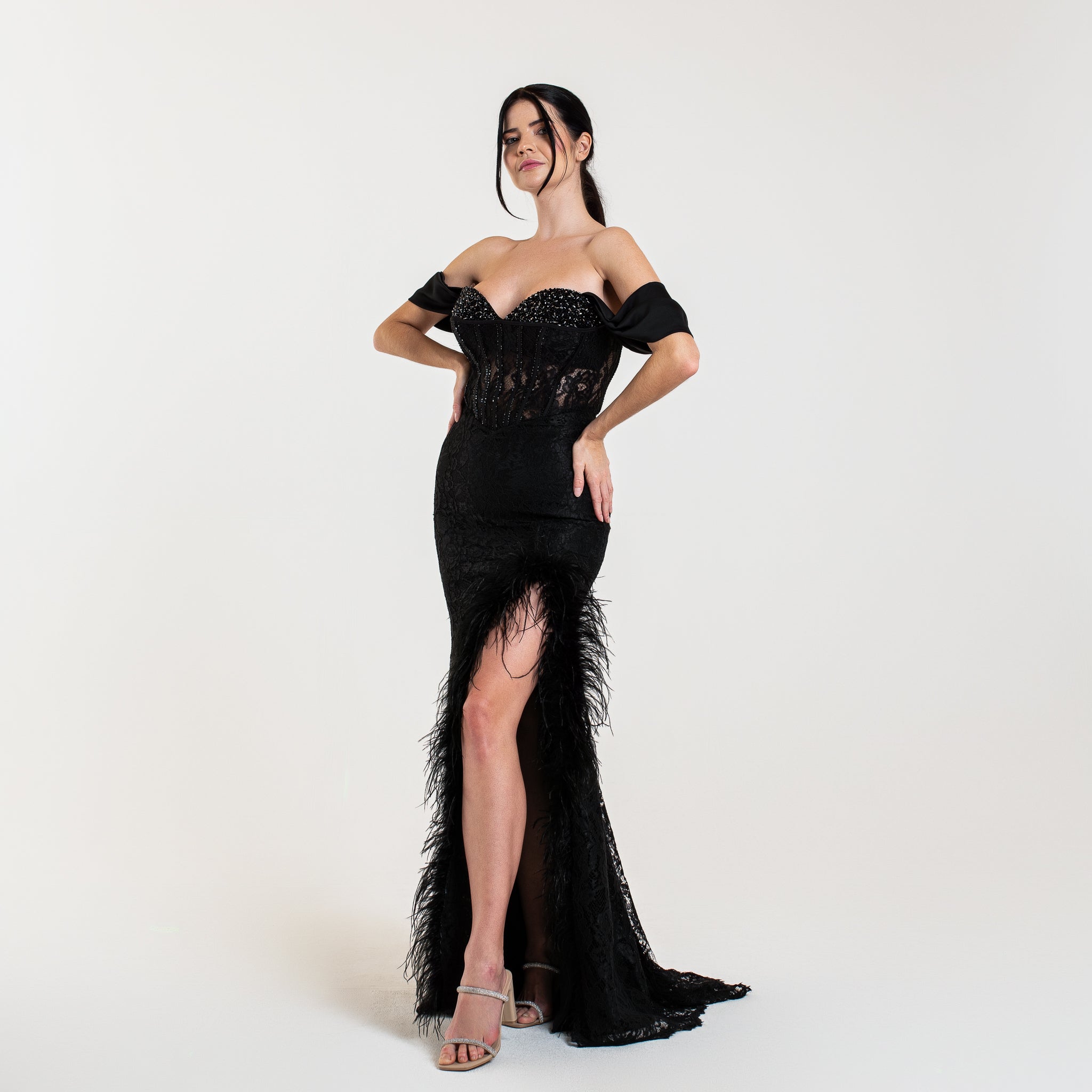 La robe Nina est une pièce élégante de type bustier pour les soirées spéciales. Avec ses éléments en dentelle et ses détails ornés, cette robe apporte une touche de glamour. La silhouette ajustée et l'ouverture haute sur la jambe révèlent un côté sexy et sophistiqué, avec un soupçon de tissu à plumes d’autruche. Les manches tombantes et le corset partiellement transparent dégagent les épaules, tandis que le motif en dentelle ajoute une touche de féminité. Cette robe vous donnera une allure irrésistible lors de vos soirées.