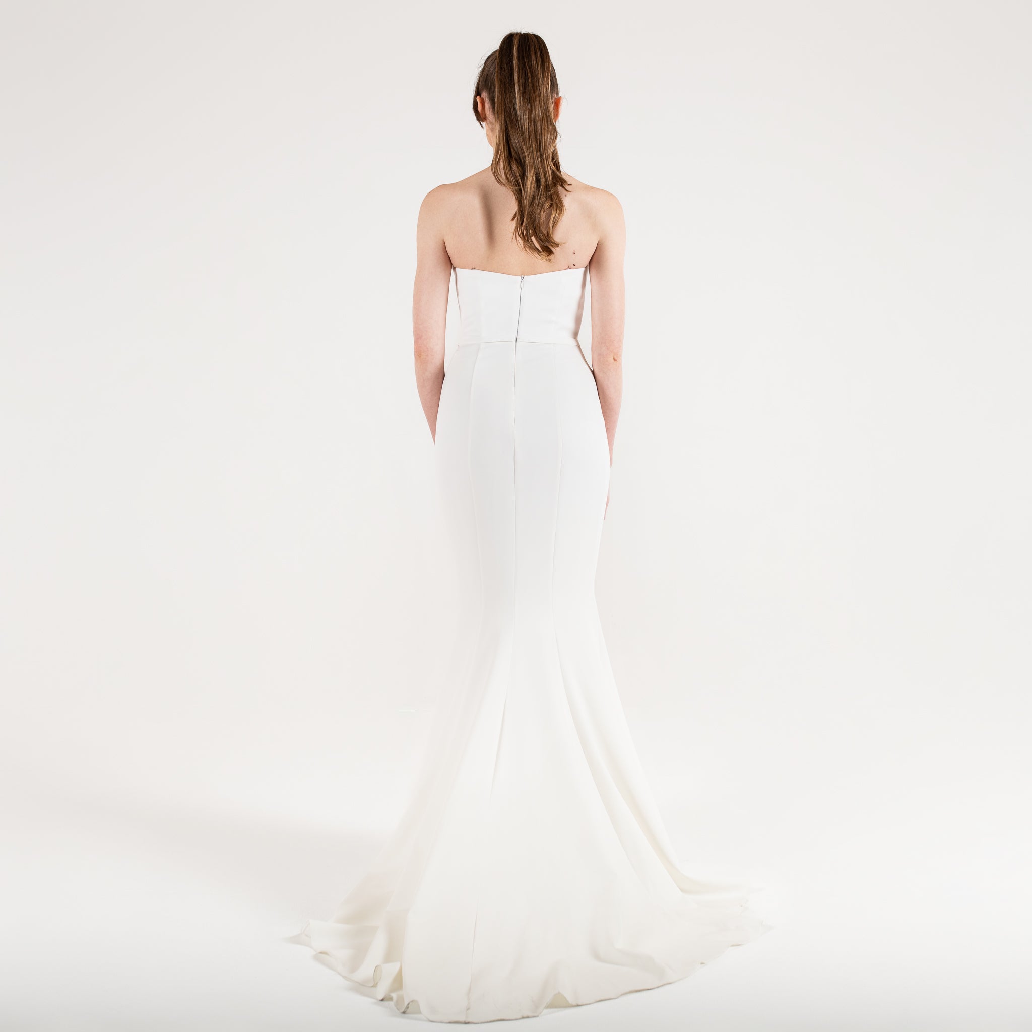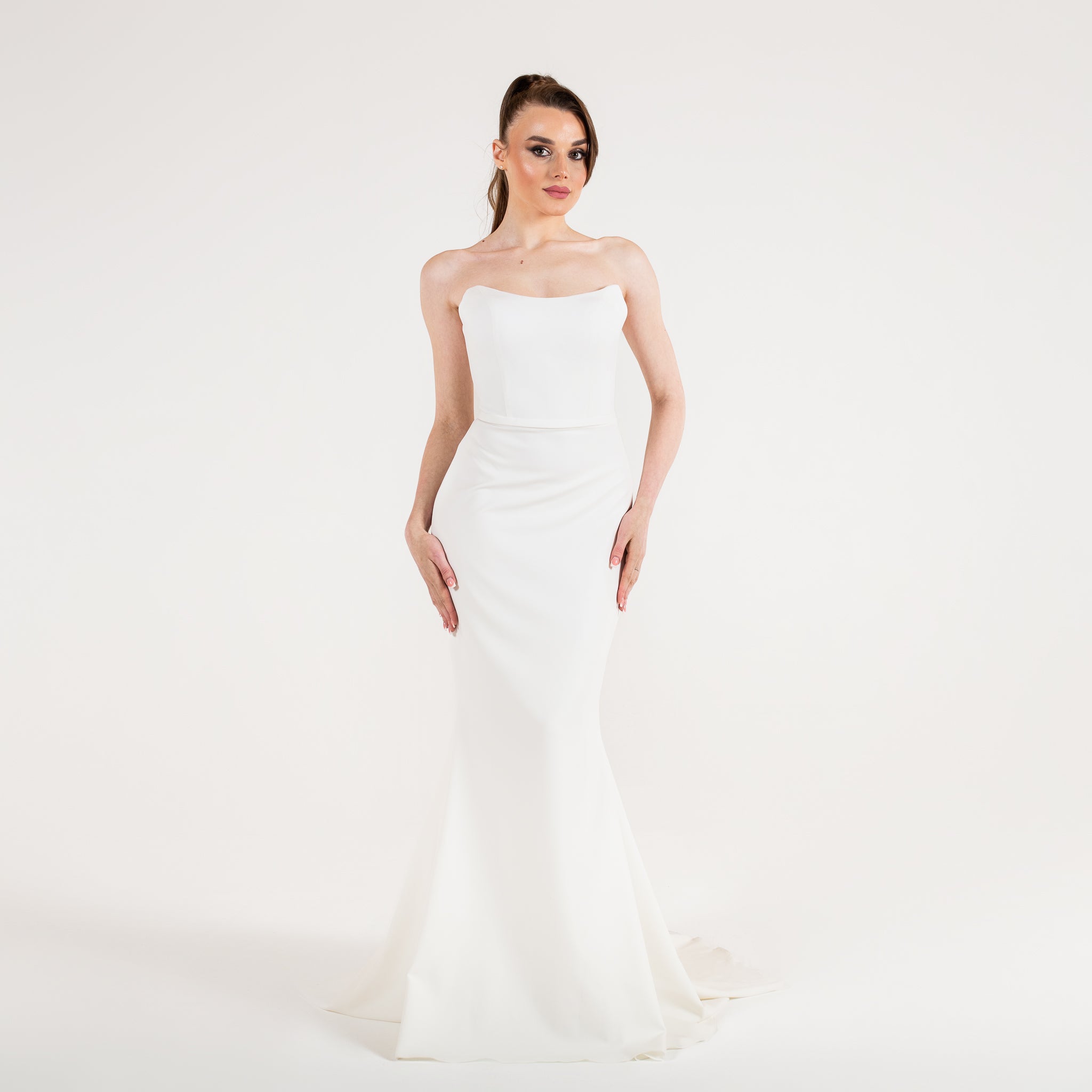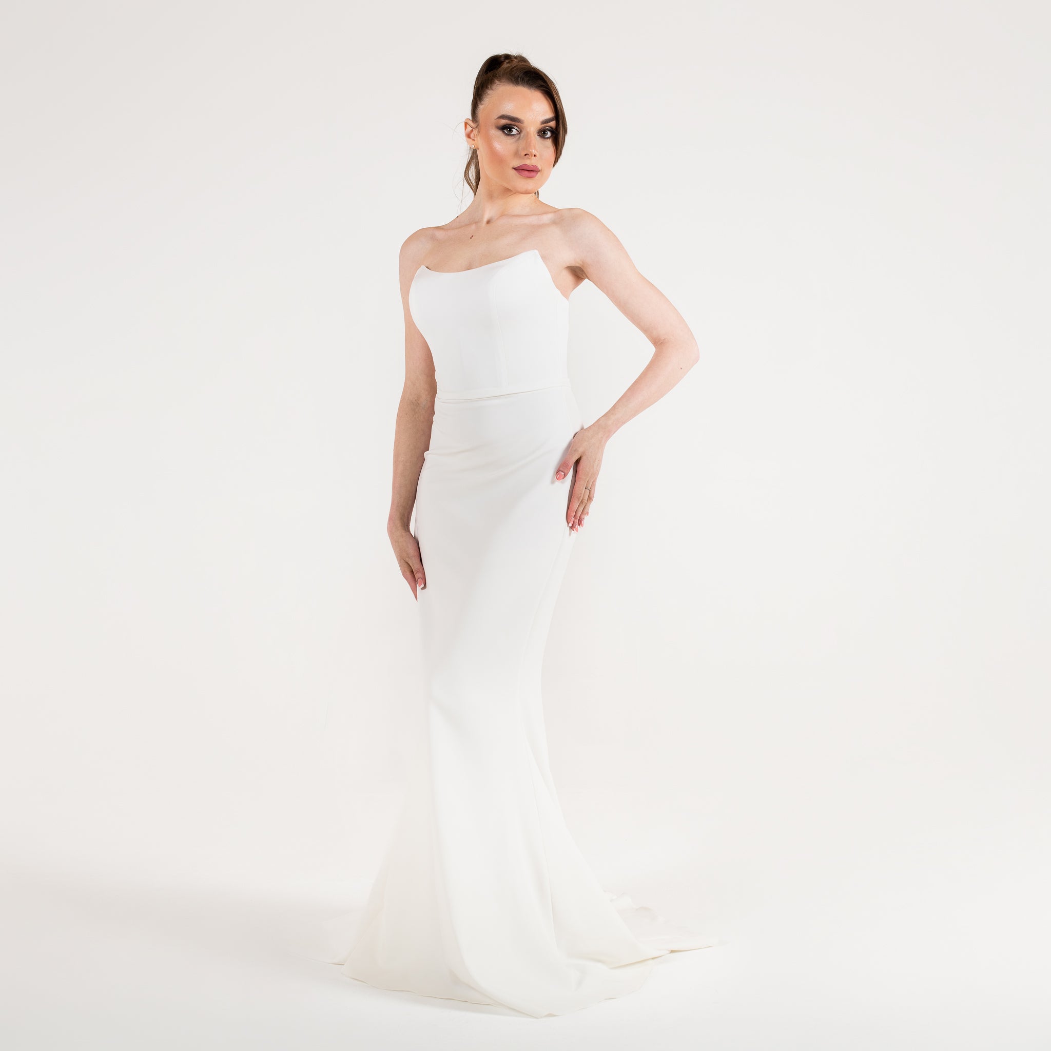 La robe LEANA incarne l’élégance minimaliste avec sa coupe sirène épurée et son décolleté droit sans bretelles, mettant en valeur la silhouette avec finesse et sophistication. Confectionnée dans un tissu lisse et fluide, elle épouse délicatement les courbes avant de s’évaporer en une traîne subtile, apportant une touche de grâce à chaque mouvement. Idéale pour une mariée moderne à la recherche de sobriété et de raffinement, cette création intemporelle allie pureté et allure contemporaine avec un charme incontestable.