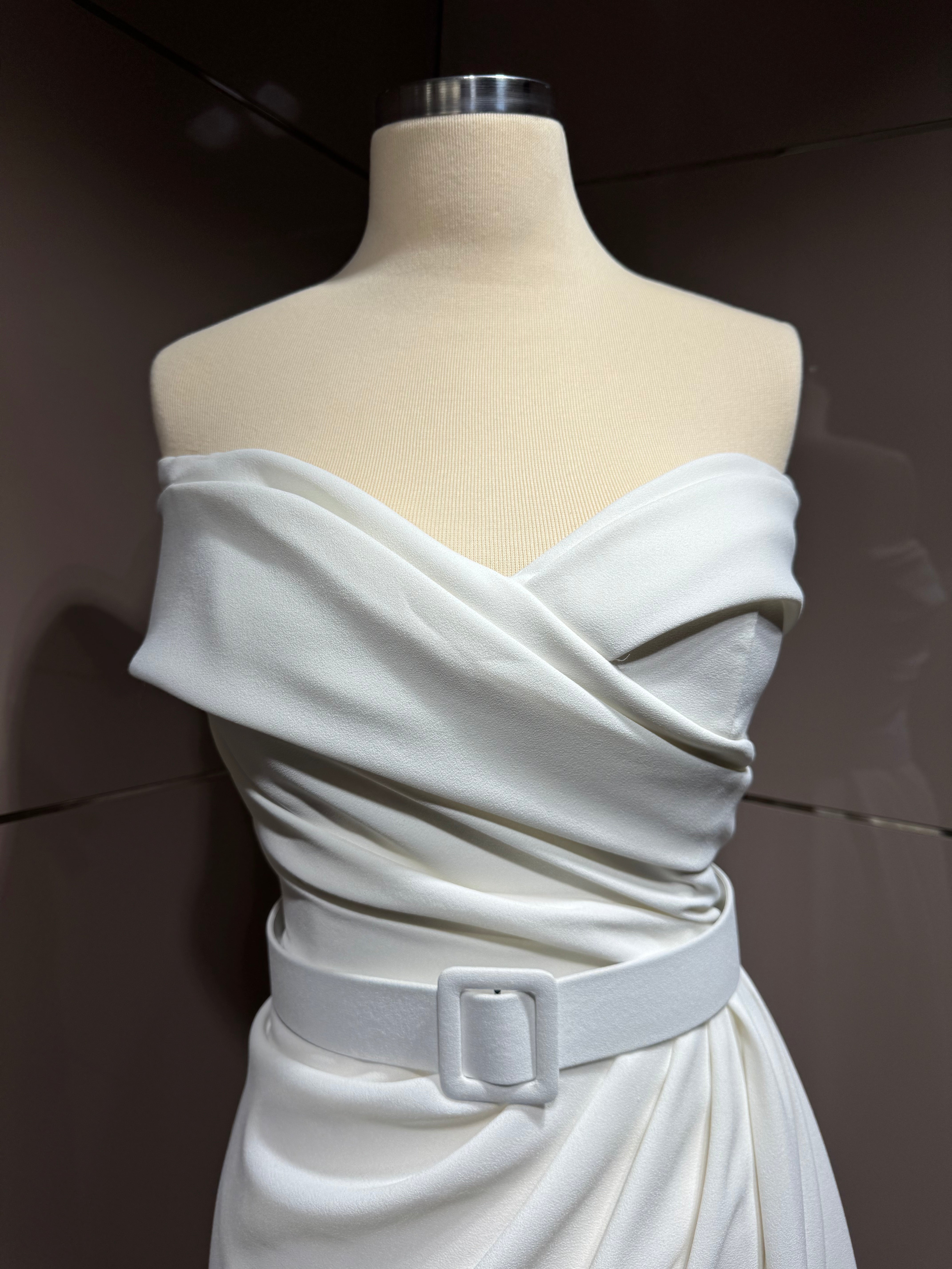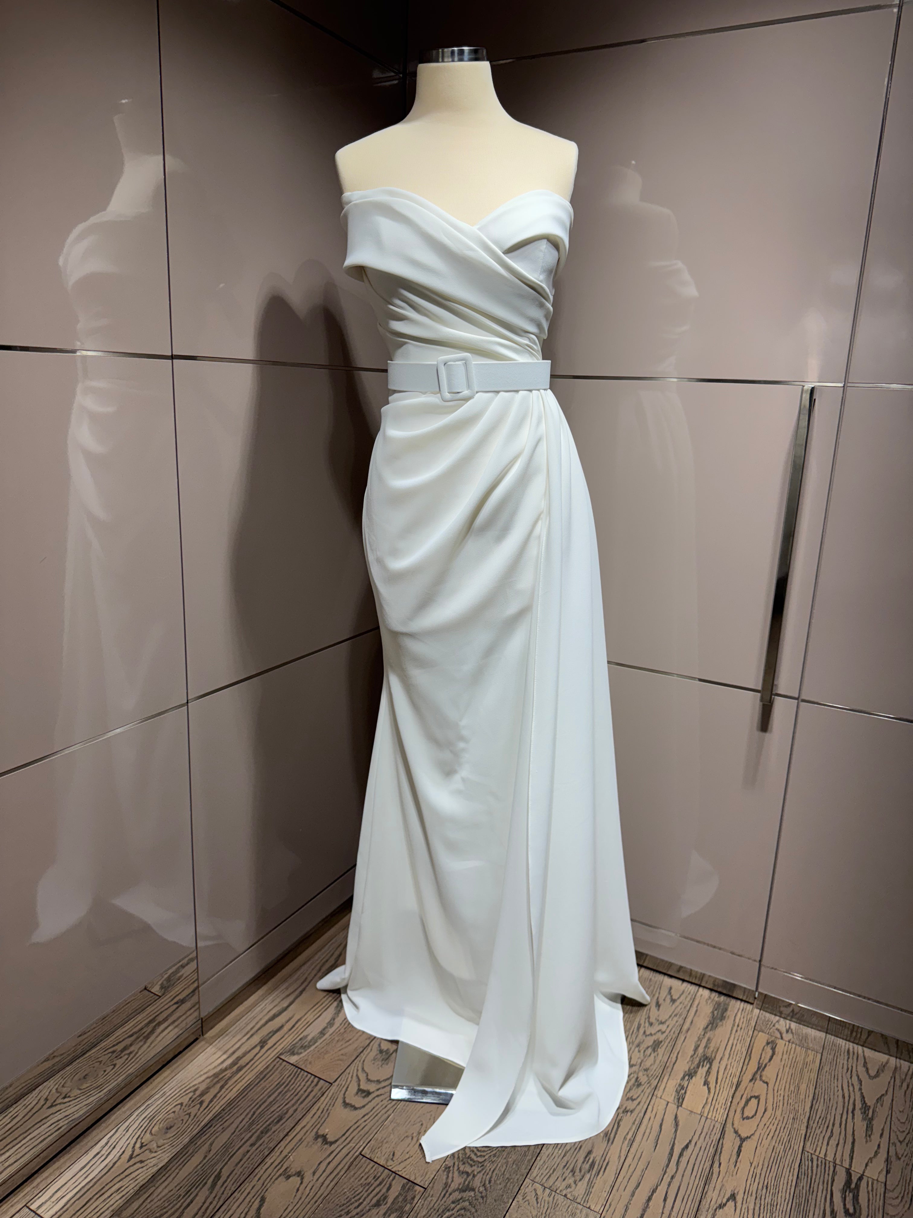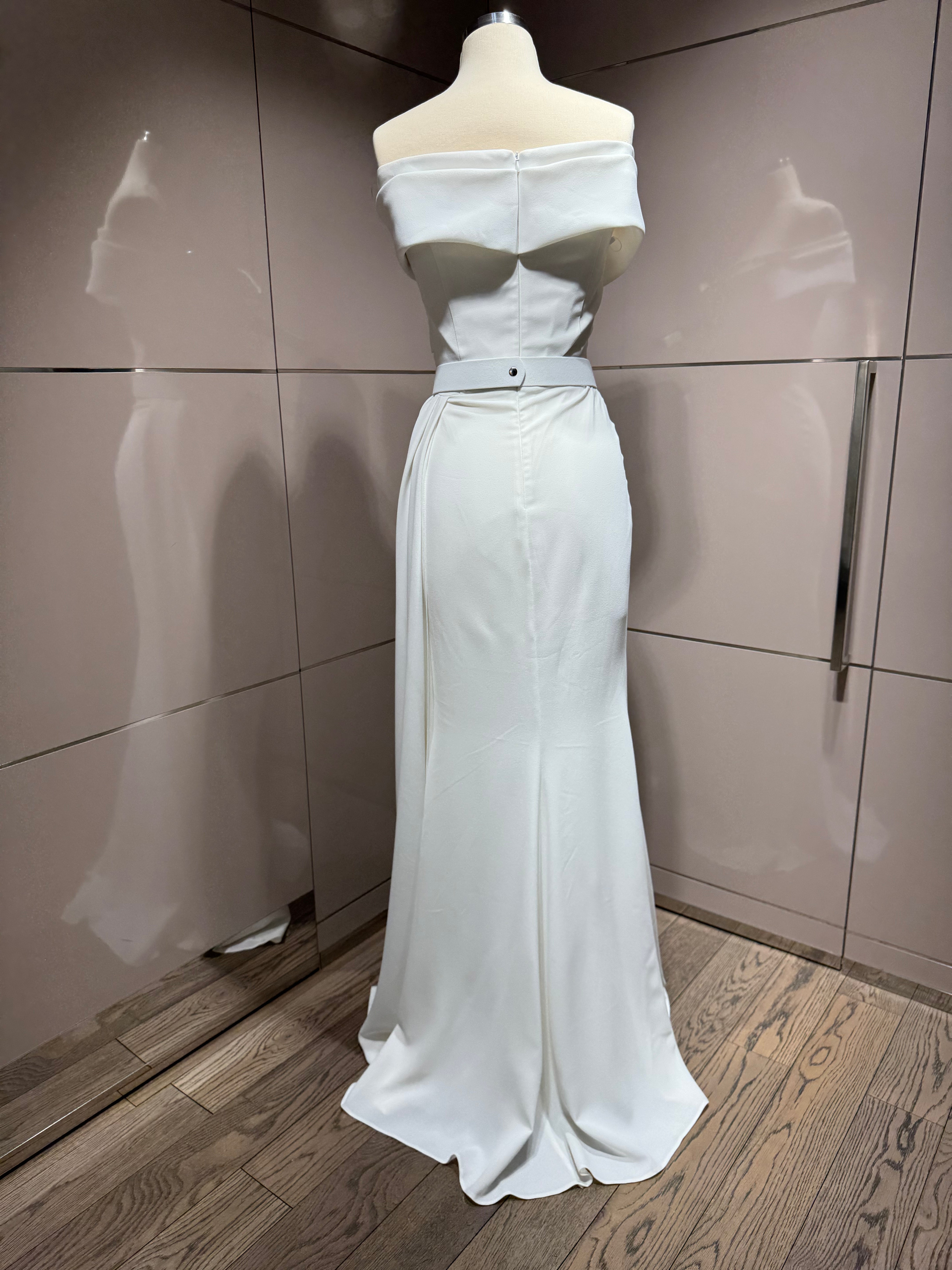 Découvrez notre robe Victoria, sophistiquée avec son encolure en V croisée et ses épaules dégagées, mettant en valeur votre décolleté. Cette robe possède une ceinture structurée qui souligne votre silhouette tandis que la jupe longue avec une fente haute ajoute une touche moderne. Son drapé fluide apporte mouvement et grâce, l'alliance parfaite entre élégance classique et allure contemporaine.