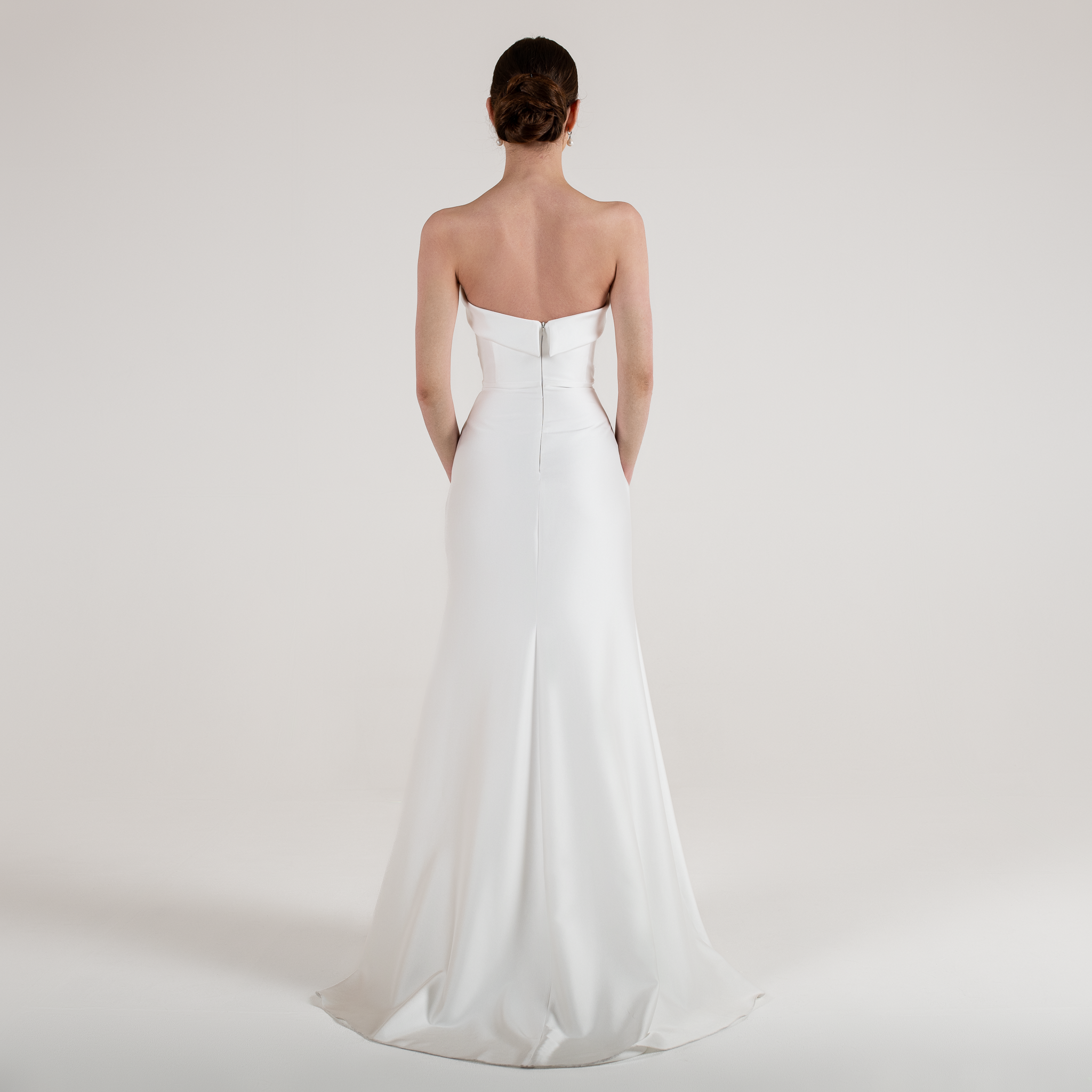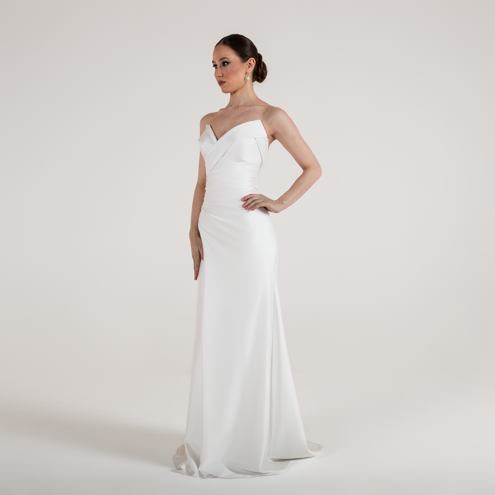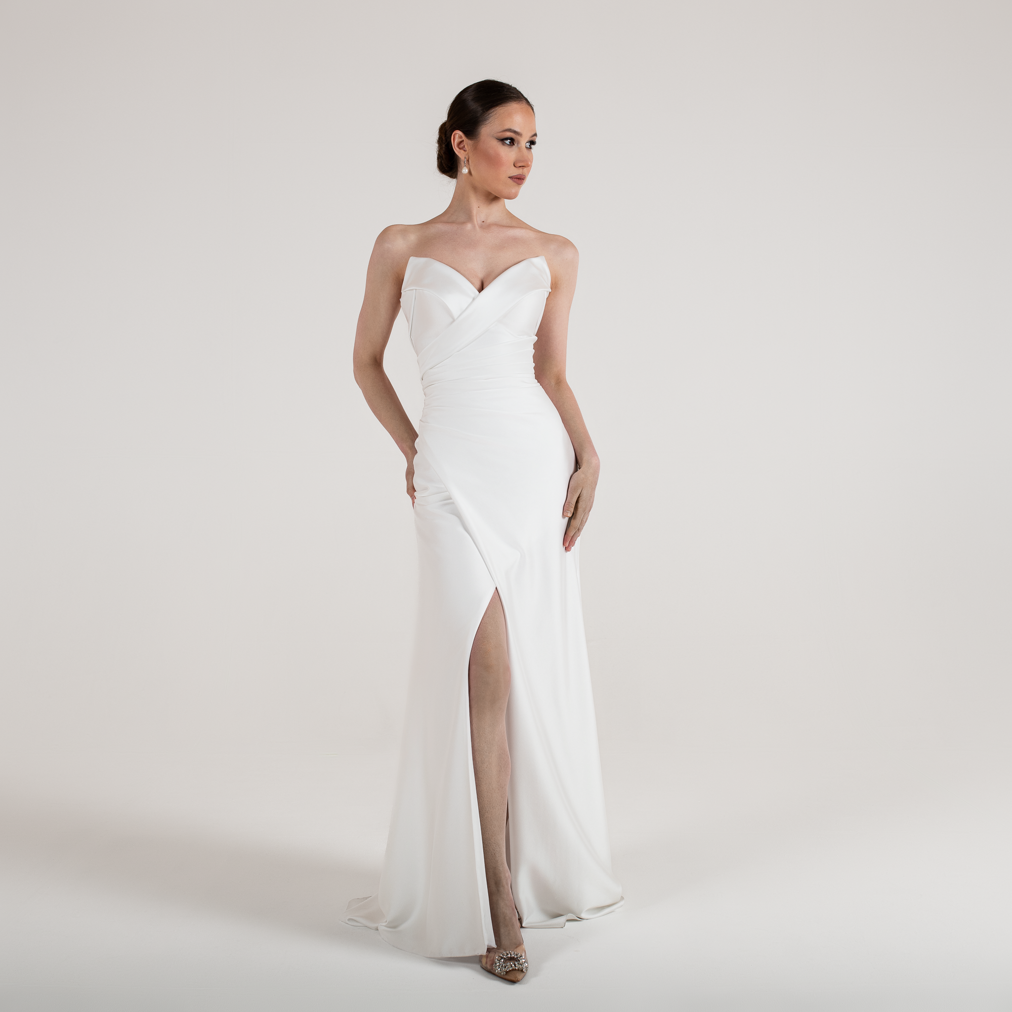 Découvrez la robe SIERRA, longue et satinée. Elle possède un bustier en forme de cœur sans bretelles qui met en valeur vos épaules, avec une taille ajustée et une jupe fluide en fente haute pour une touche de sensualité et d'élégance. Parfaite pour votre mariage civil ou événements formels.