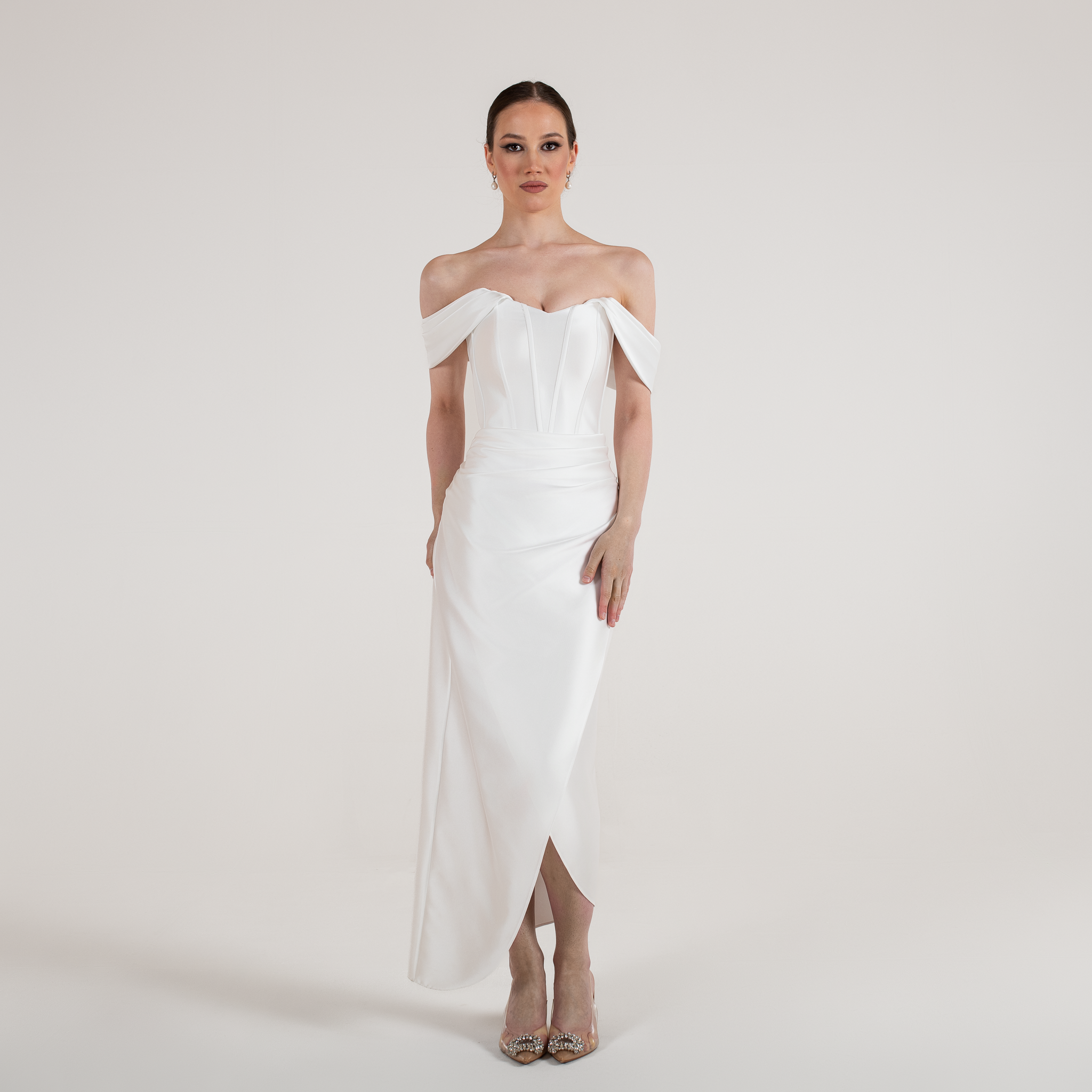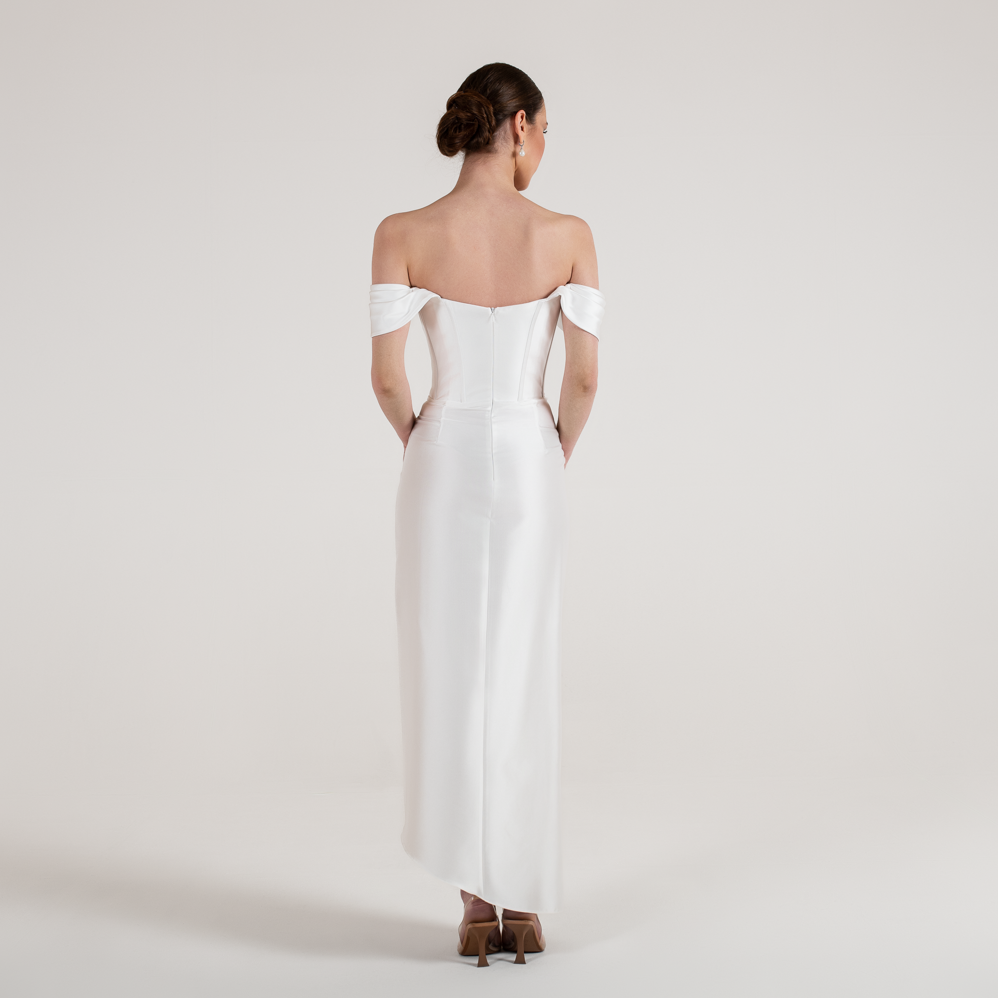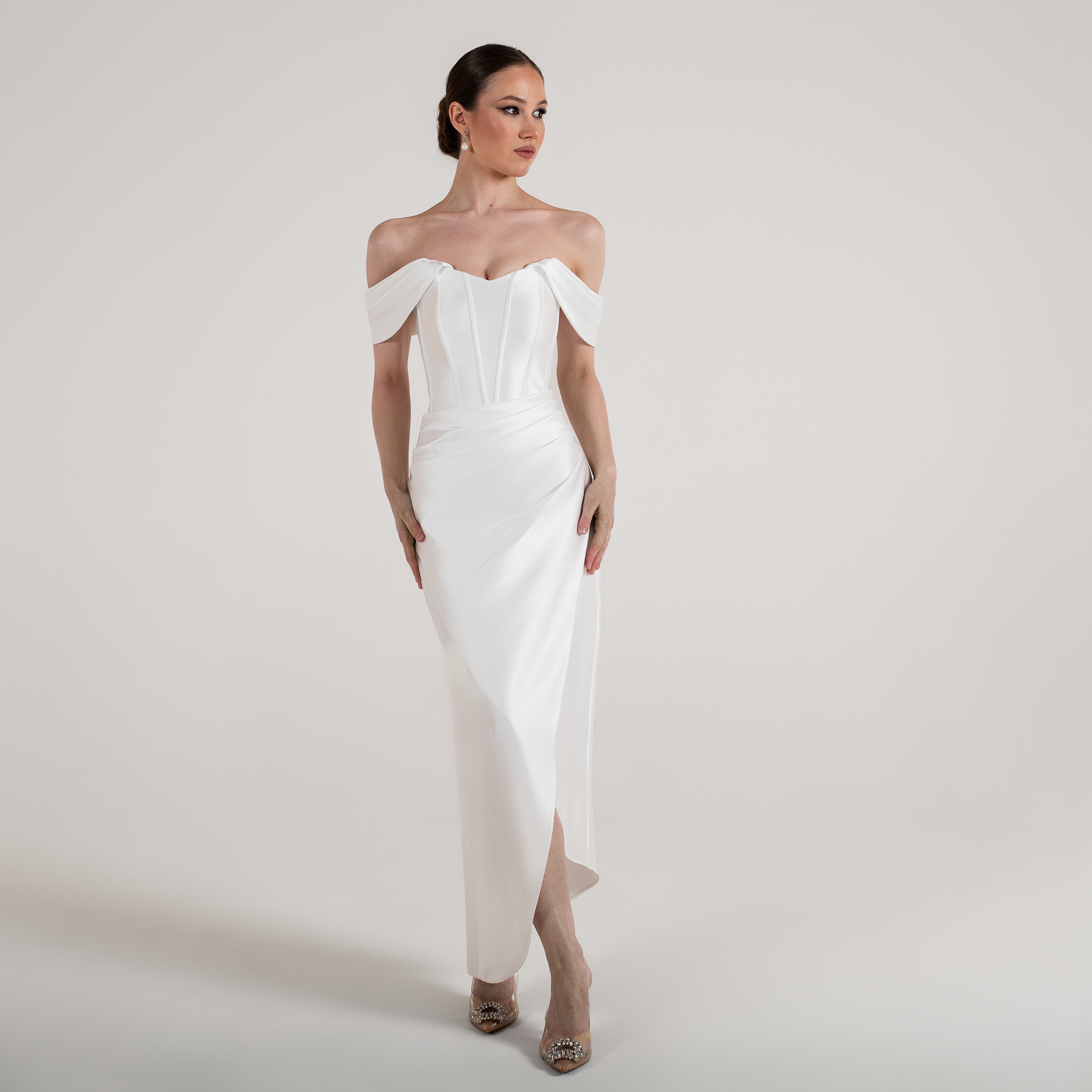 Cette robe de mariée courte et élégante souligne la taille et les courbes grâce à sa silhouette ajustée et son tissu satiné blanc. Son corsage structuré avec des plis délicats sur les épaules dénudées offre un effet sculptural et moderne, tandis que la jupe asymétrique avec un léger drapé à l'avant apporte du mouvement et de la sophistication. Idéale pour une mariée moderne et glamour.