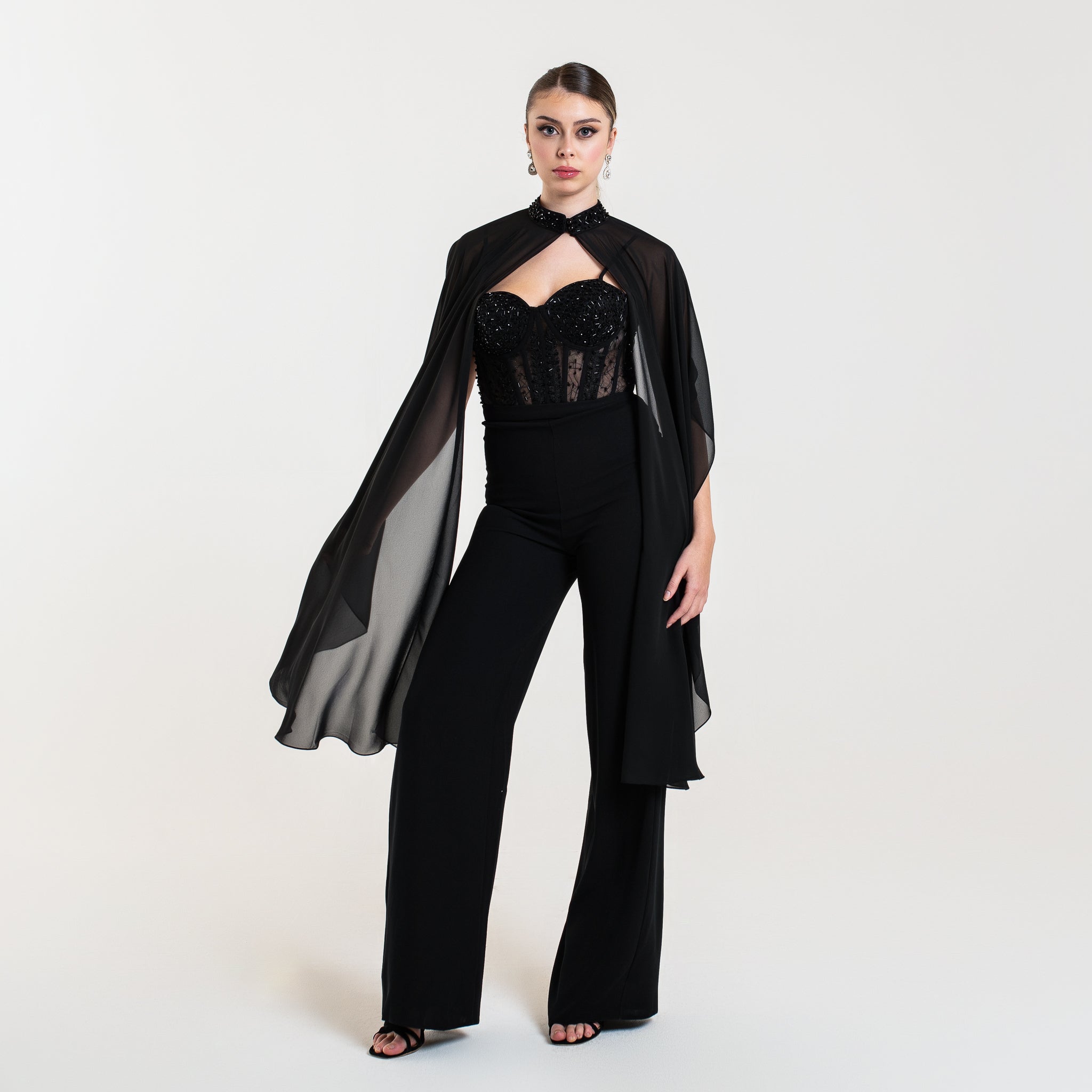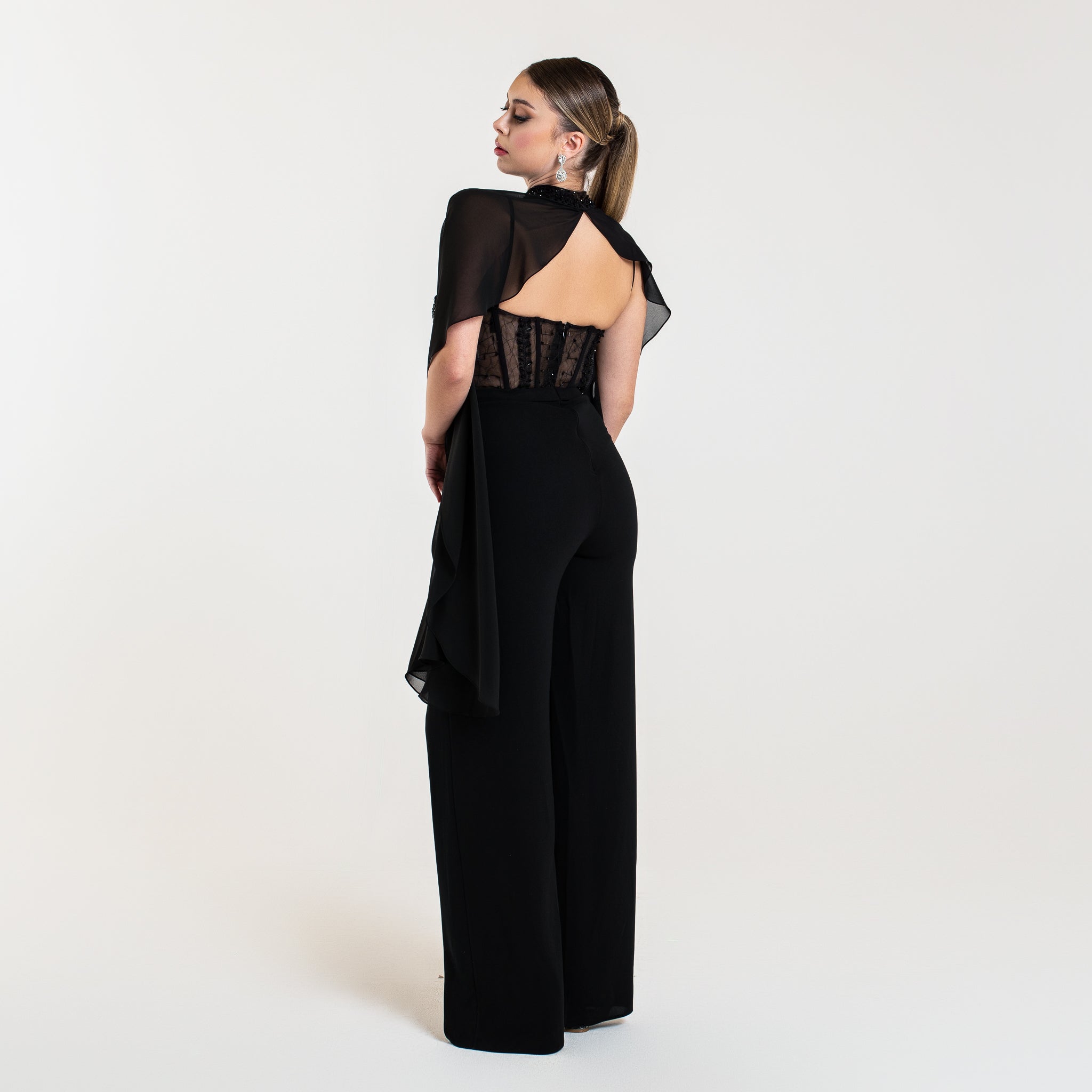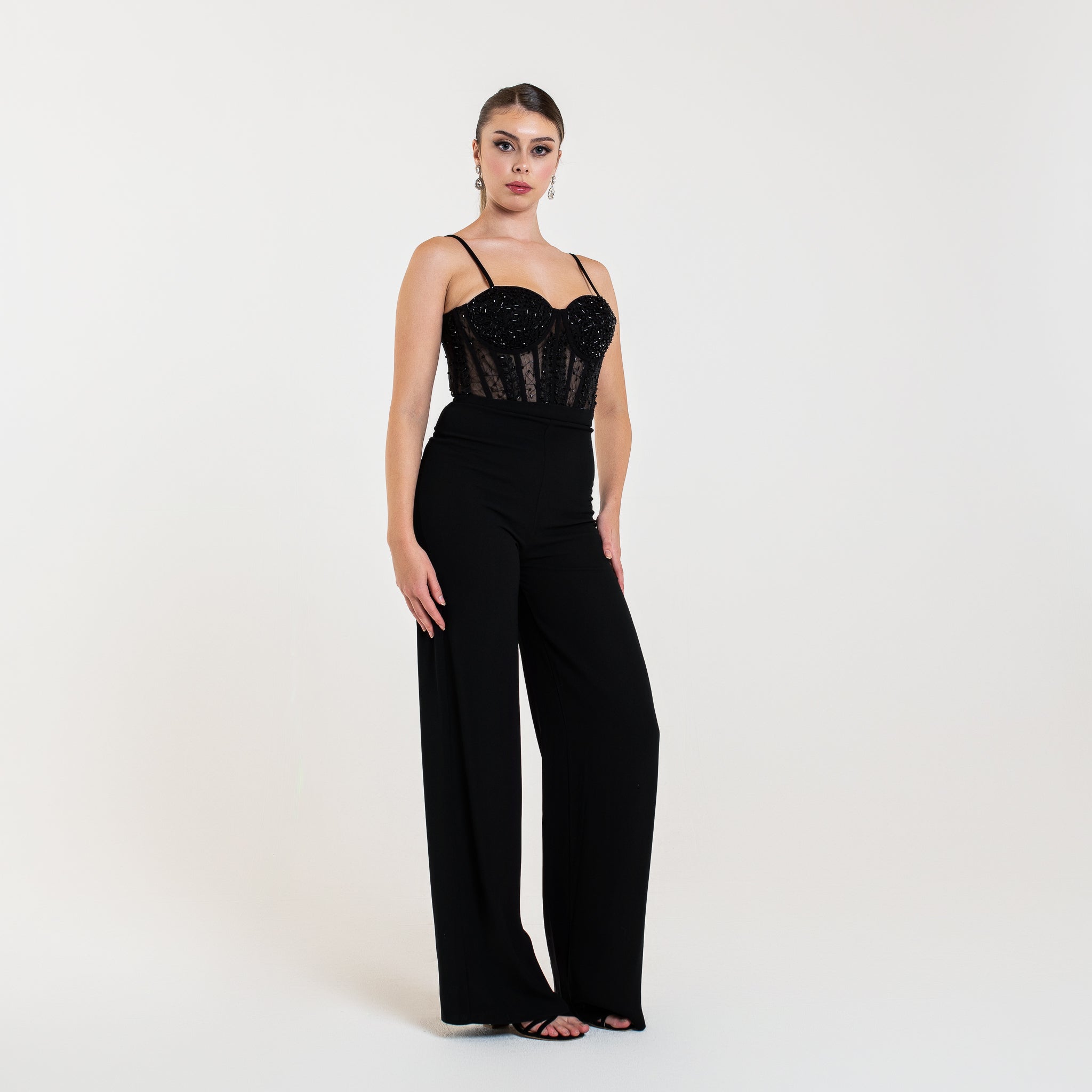 Bei diesem Outfit handelt es sich um einen raffinierten schwarzen Overall, ideal für elegante Anlässe. Das Oberteil des Jumpsuits ist im Korsett-Stil mit Bustier-Cups strukturiert. Es ist mit schimmernden Perlen oder Stickereien verziert, die einen Hauch von Glamour und Luxus verleihen und einen strukturierten, funkelnden Effekt auf der Brust erzeugen. Die dünnen Träger sorgen für diskreten Halt und verleihen dem Design gleichzeitig eine filigrane Note.