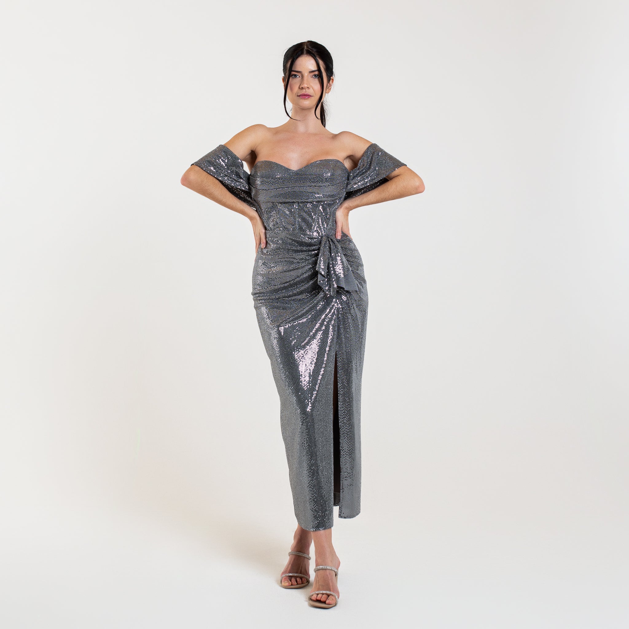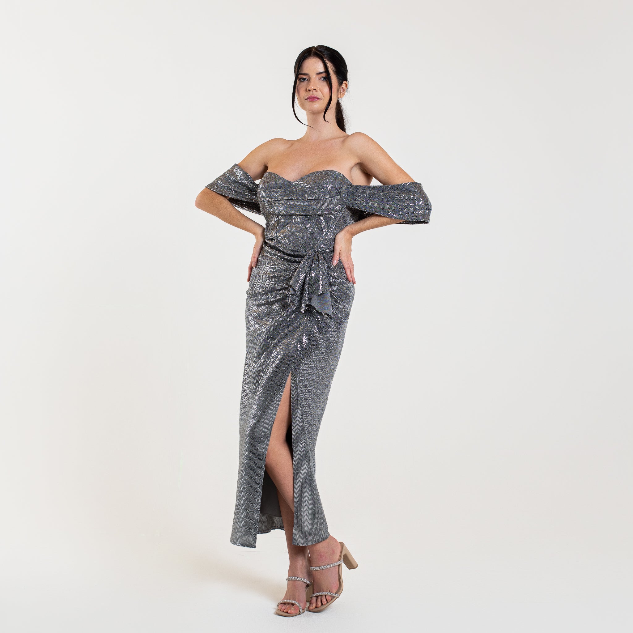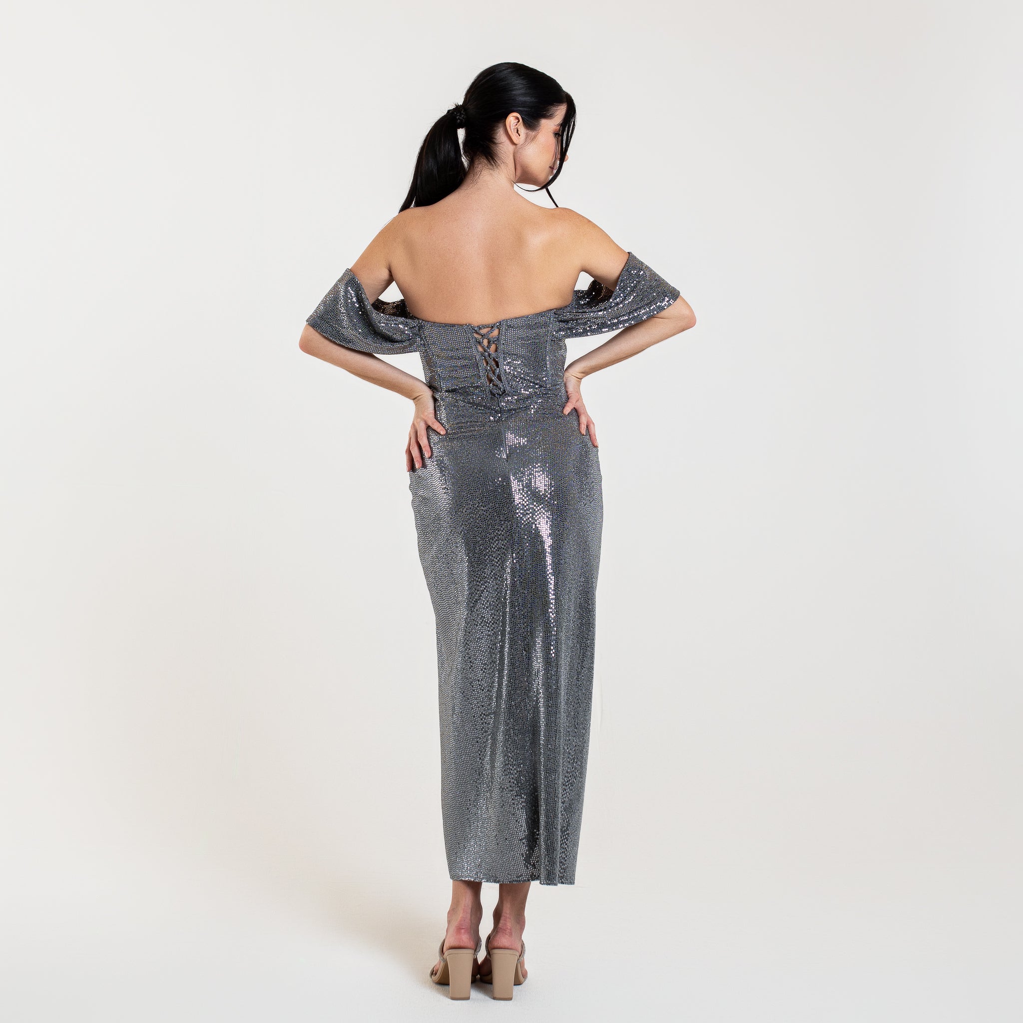 Der verwendete Stoff schimmert mit metallischem Effekt und unterstreicht den luxuriösen Look. Die Rückseite des Kleides ist geschnürt, was eine individuelle und elegante Passform ermöglicht, während ein Seitenschlitz für eine sinnliche Note sorgt und das Bein hervorhebt.
