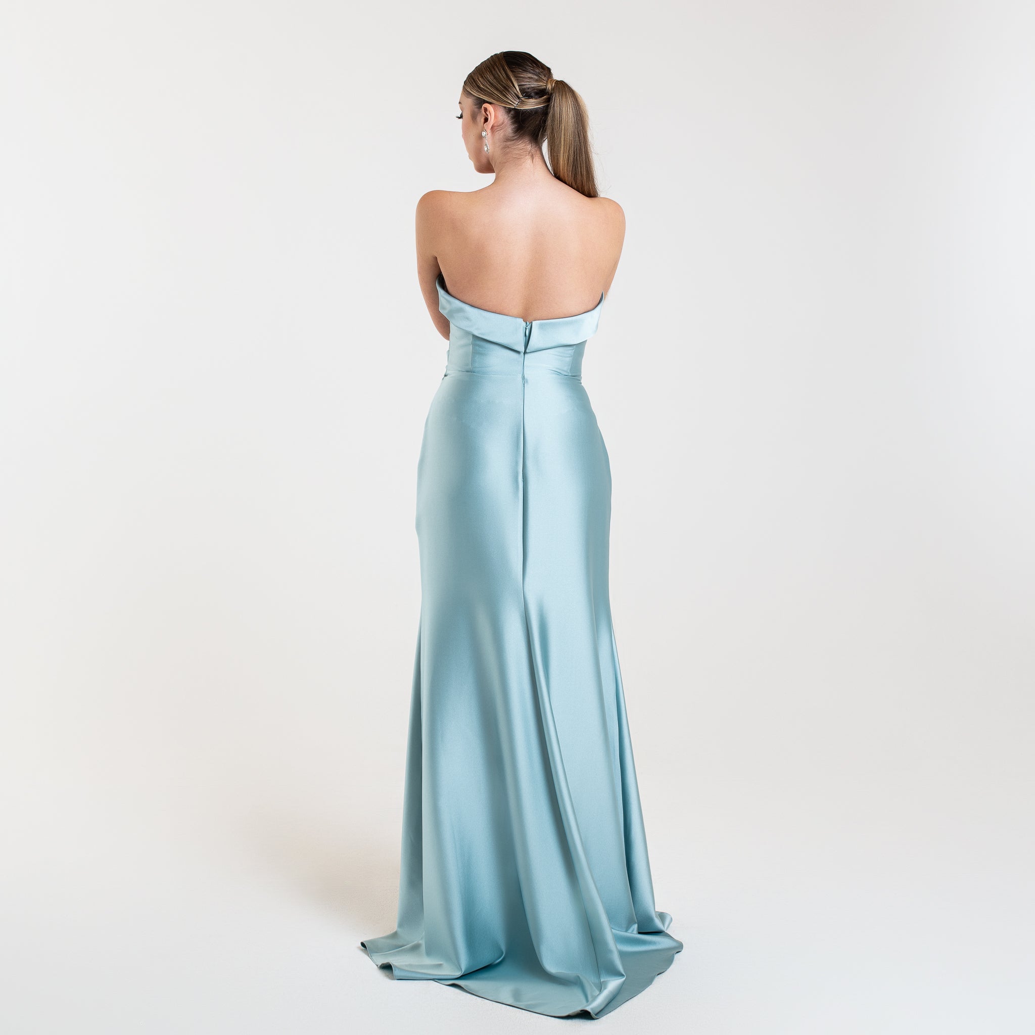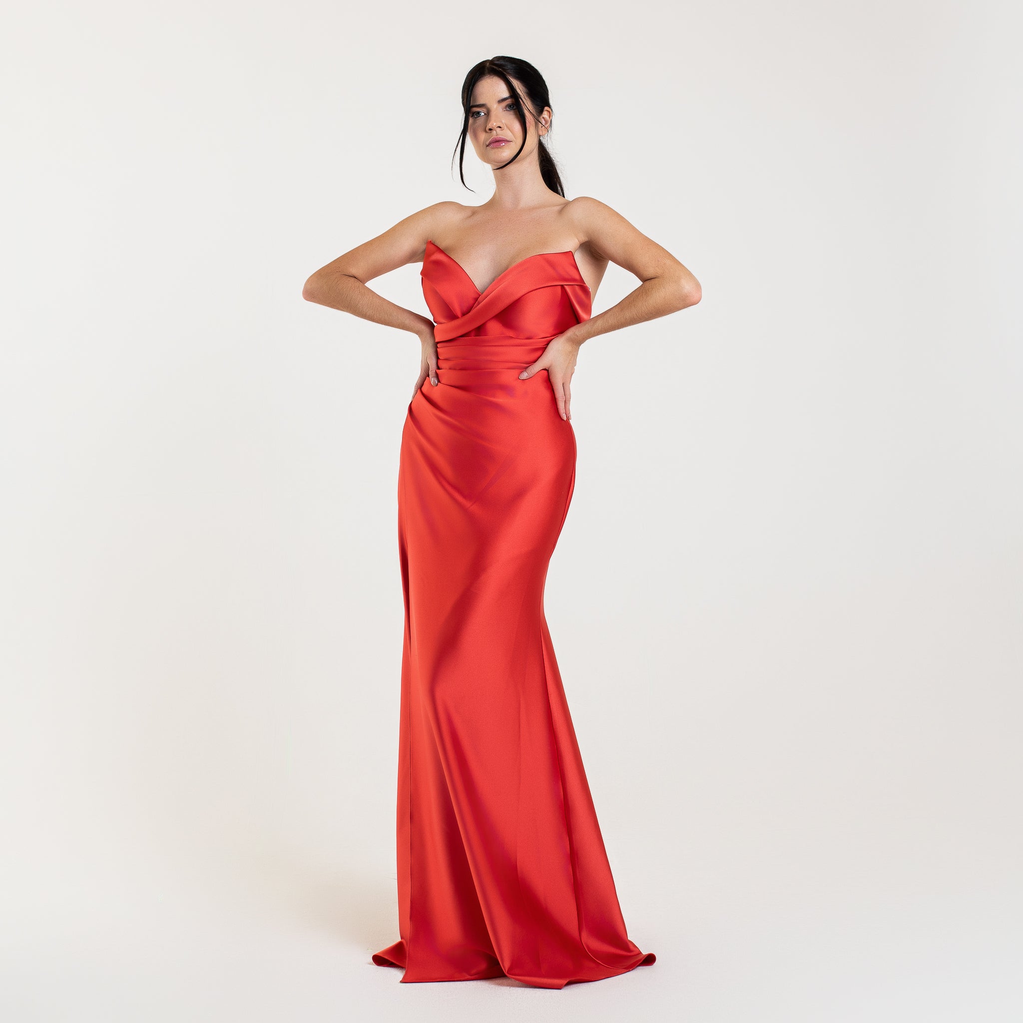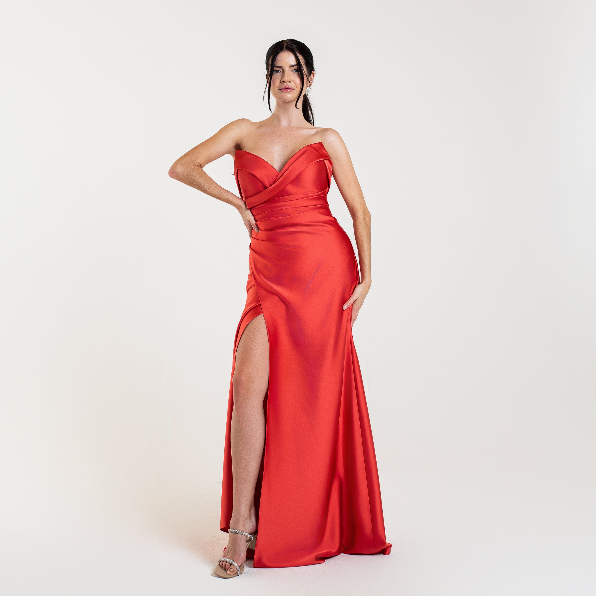 Entdecken Sie das lange und seidige Kleid SIENNA. Es verfügt über ein trägerloses, herzförmiges Oberteil, das Ihre Schultern betont, mit einer taillierten Taille und einem fliessenden Rock mit hohem Schlitz für einen Hauch von Sinnlichkeit und Eleganz. Perfekt für Abende oder formelle Veranstaltungen.