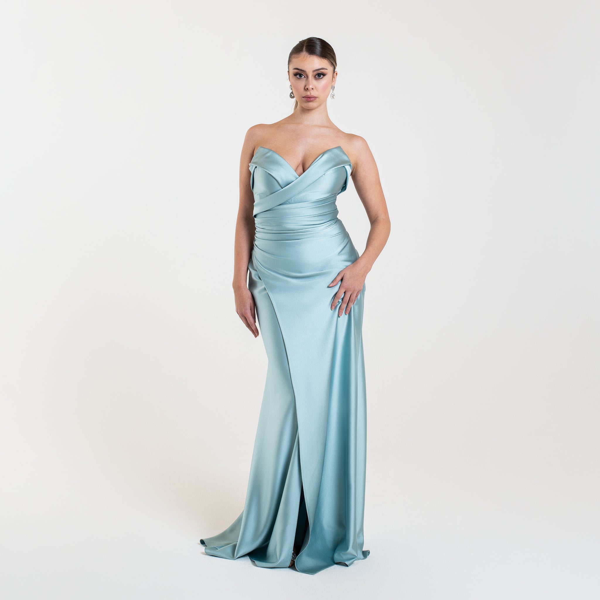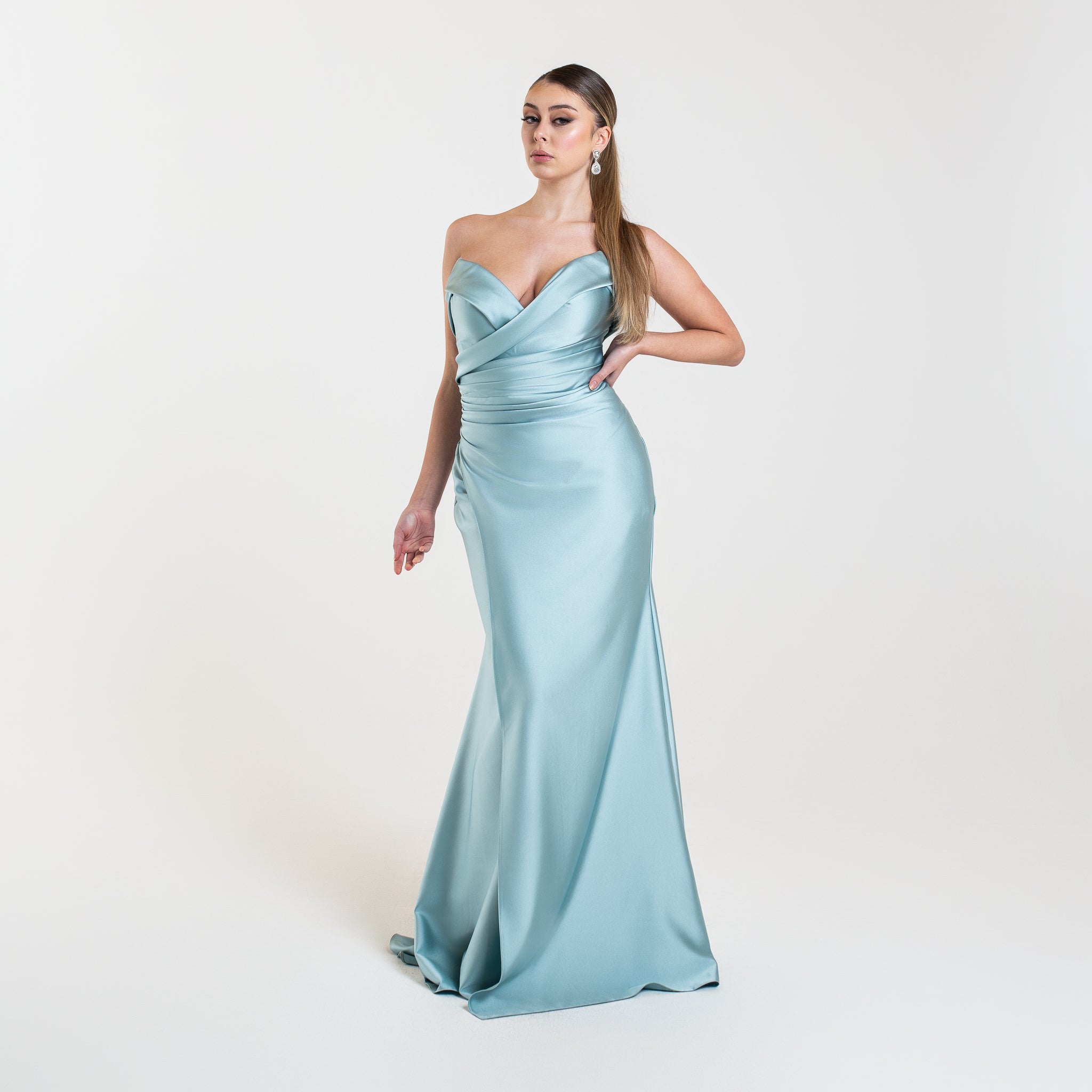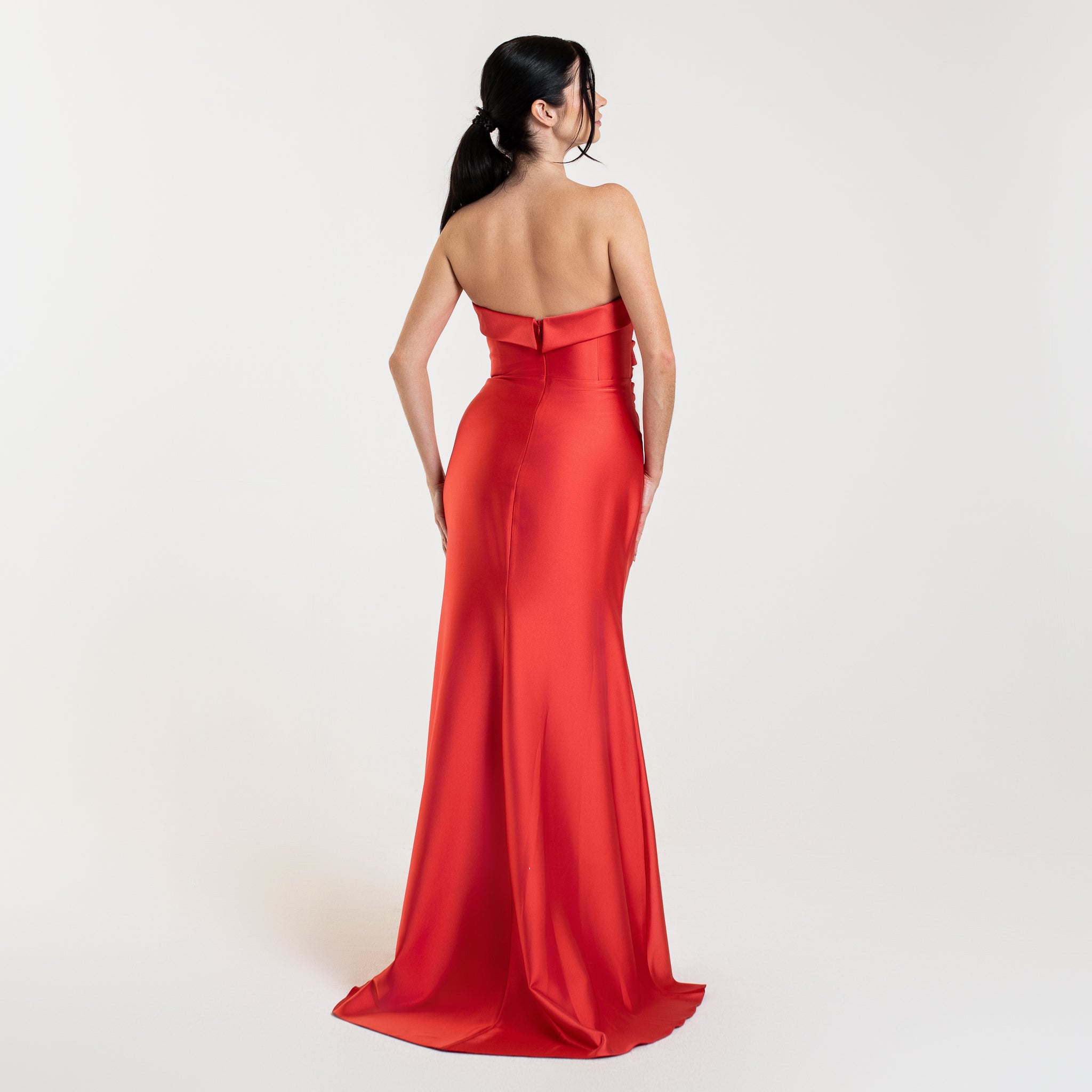 Entdecken Sie das lange und seidige Kleid SIENNA. Es verfügt über ein trägerloses, herzförmiges Oberteil, das Ihre Schultern betont, mit einer taillierten Taille und einem fliessenden Rock mit hohem Schlitz für einen Hauch von Sinnlichkeit und Eleganz. Perfekt für Abende oder formelle Veranstaltungen.