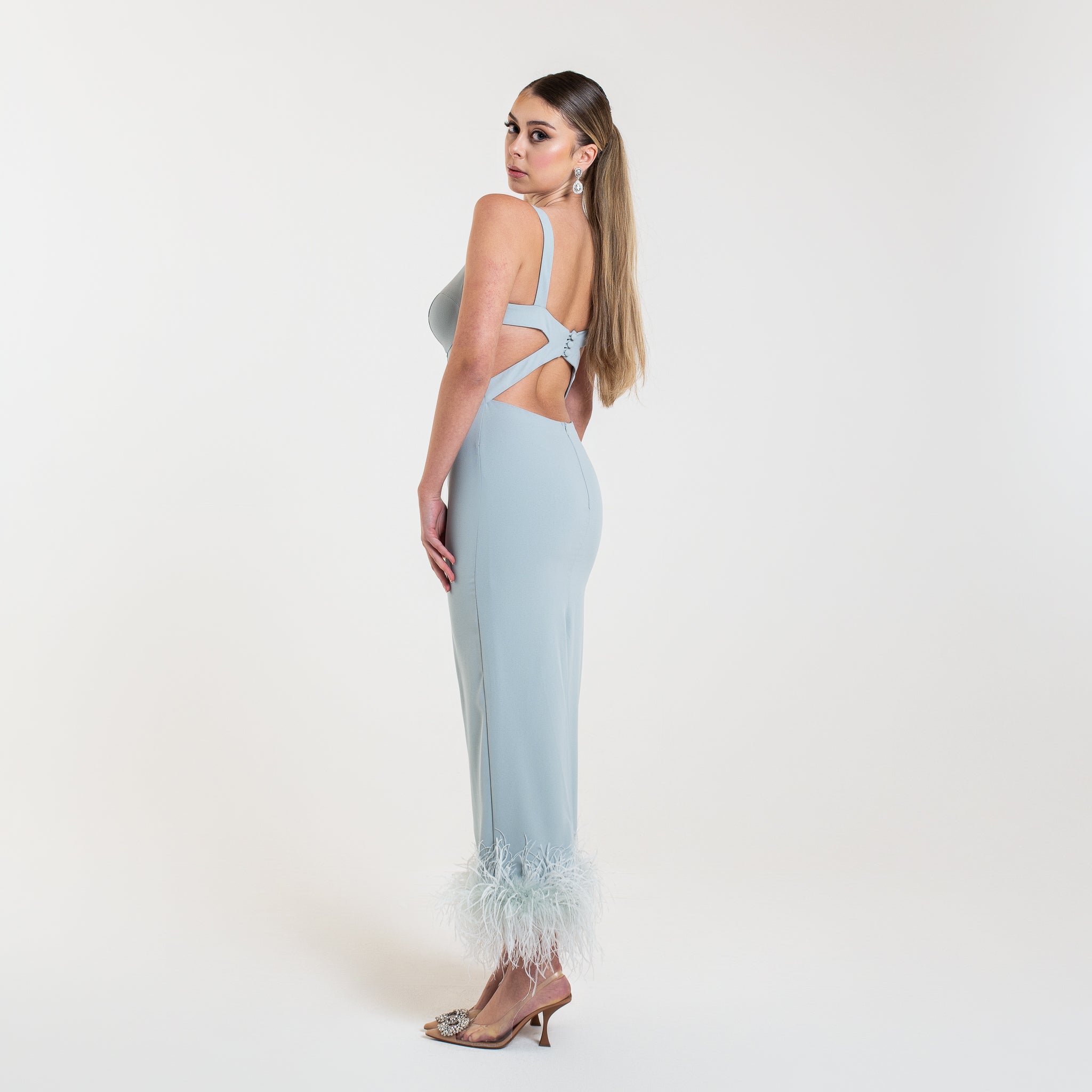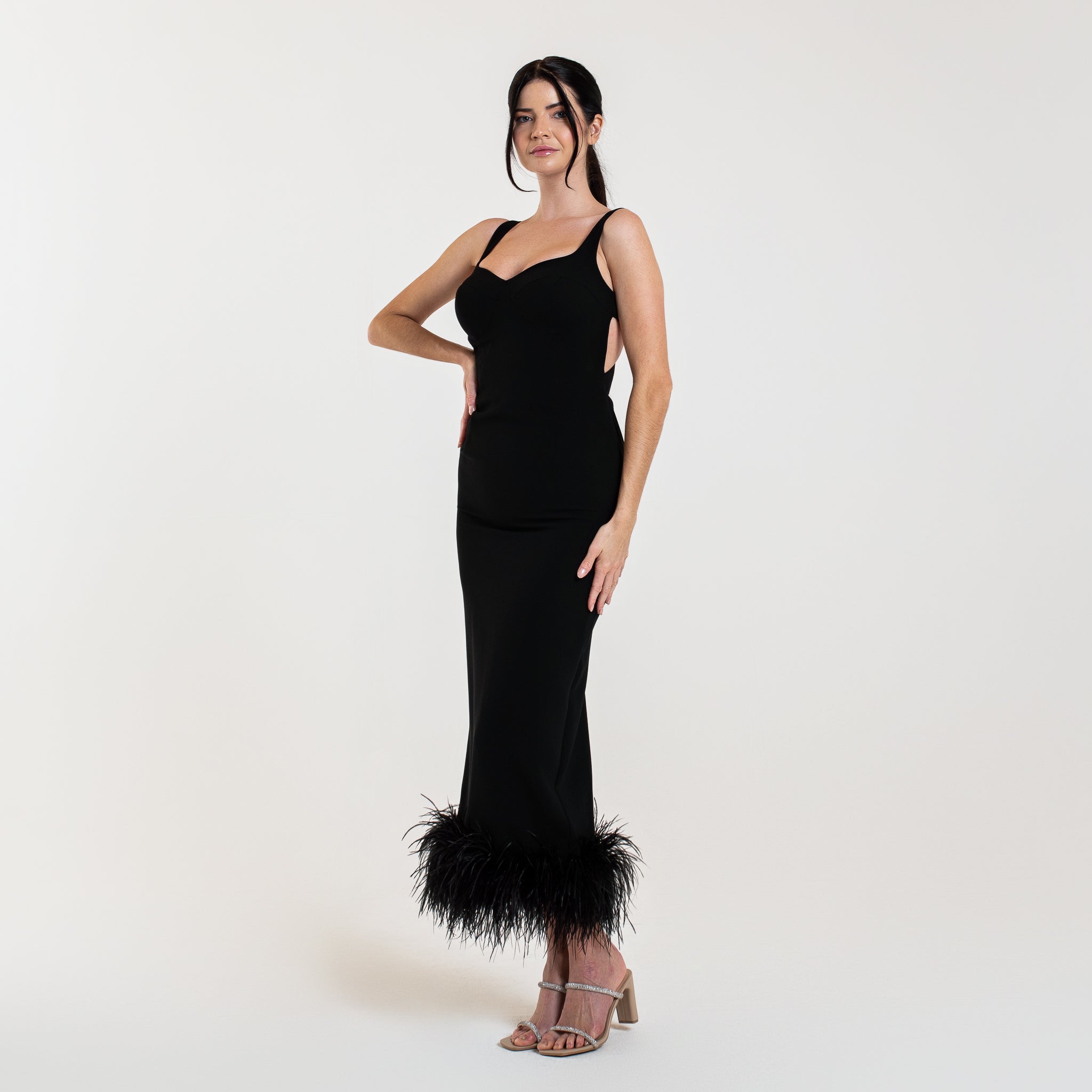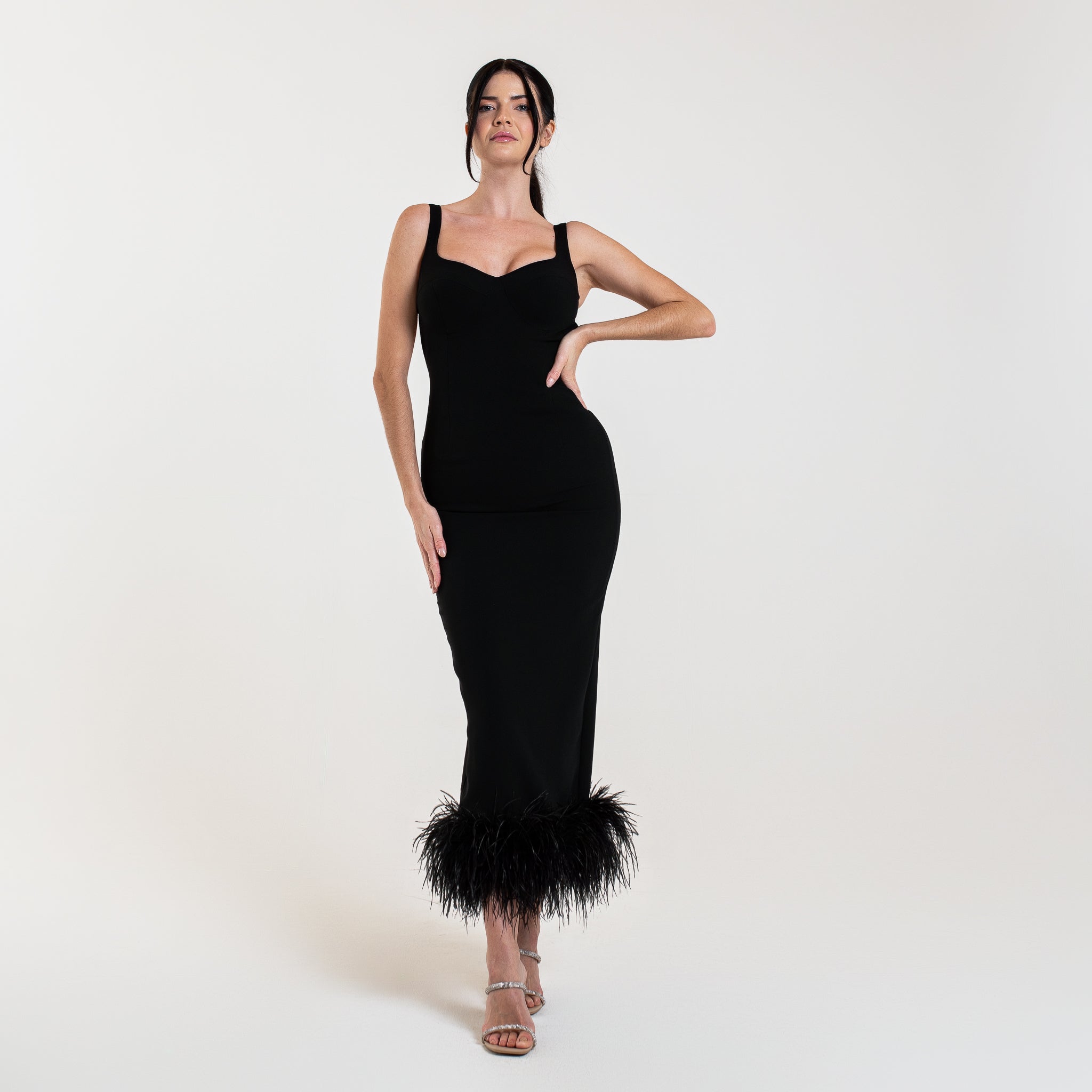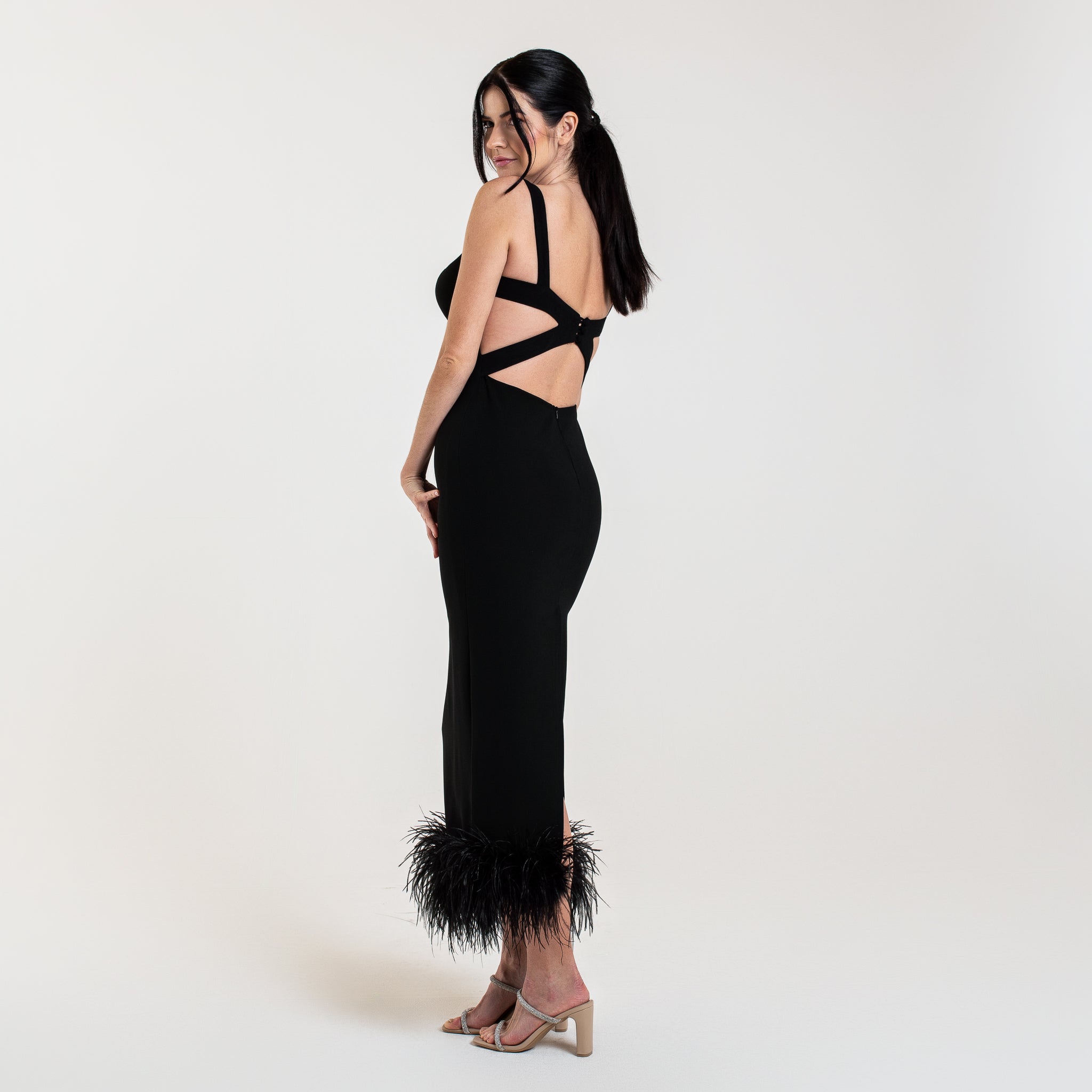 L'abito ELYA è una scelta sofisticata per le occasioni speciali. Con un lusinghiero taglio midi, schiena aperta e spacco posteriore, questo abito valorizzerà la vostra figura. Le spalline aggiungono un tocco di eleganza, mentre le piume di struzzo sul fondo aggiungono un tocco di glamour.