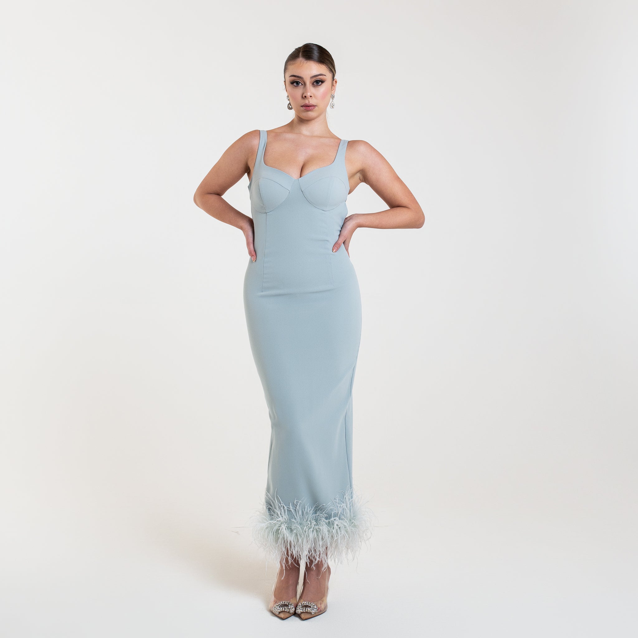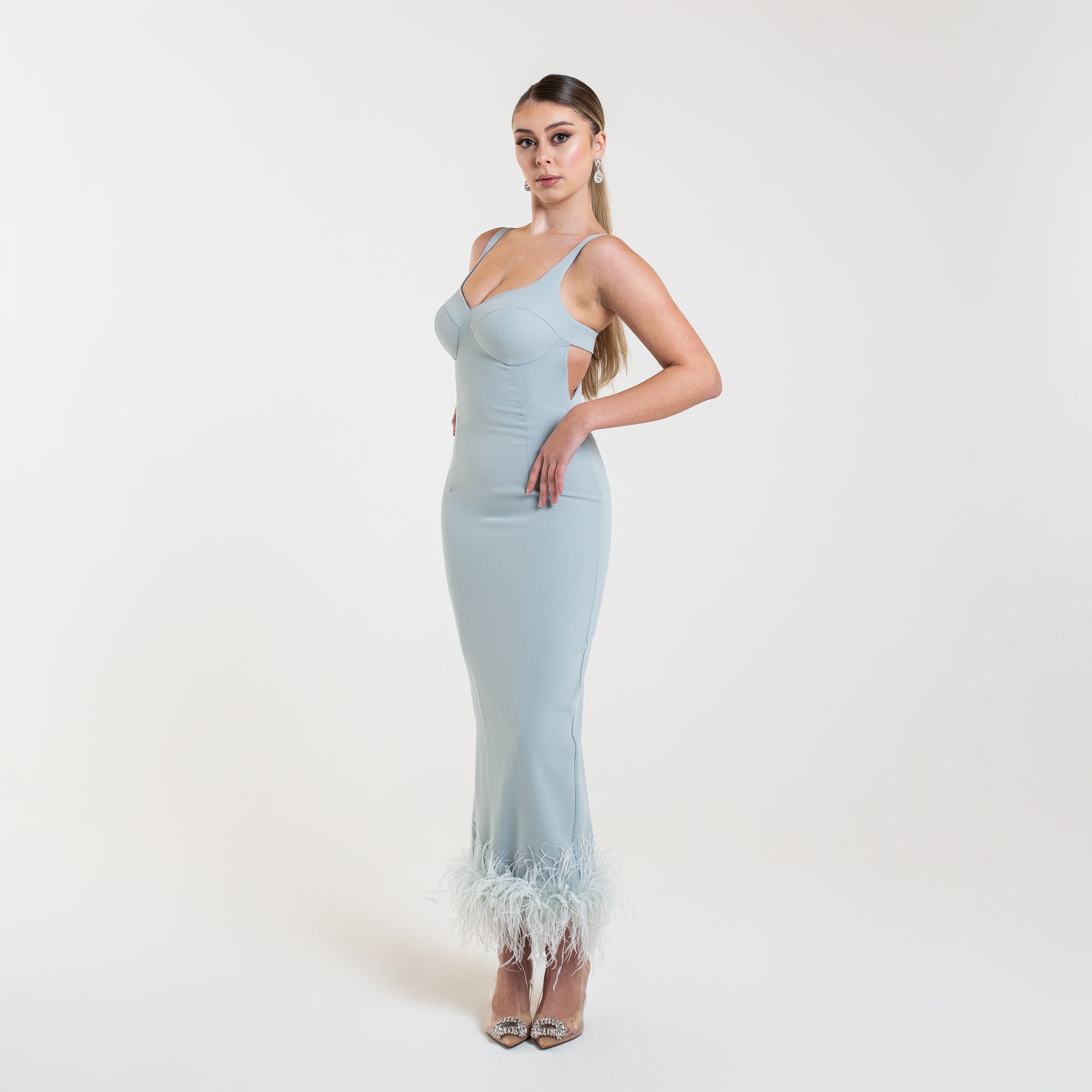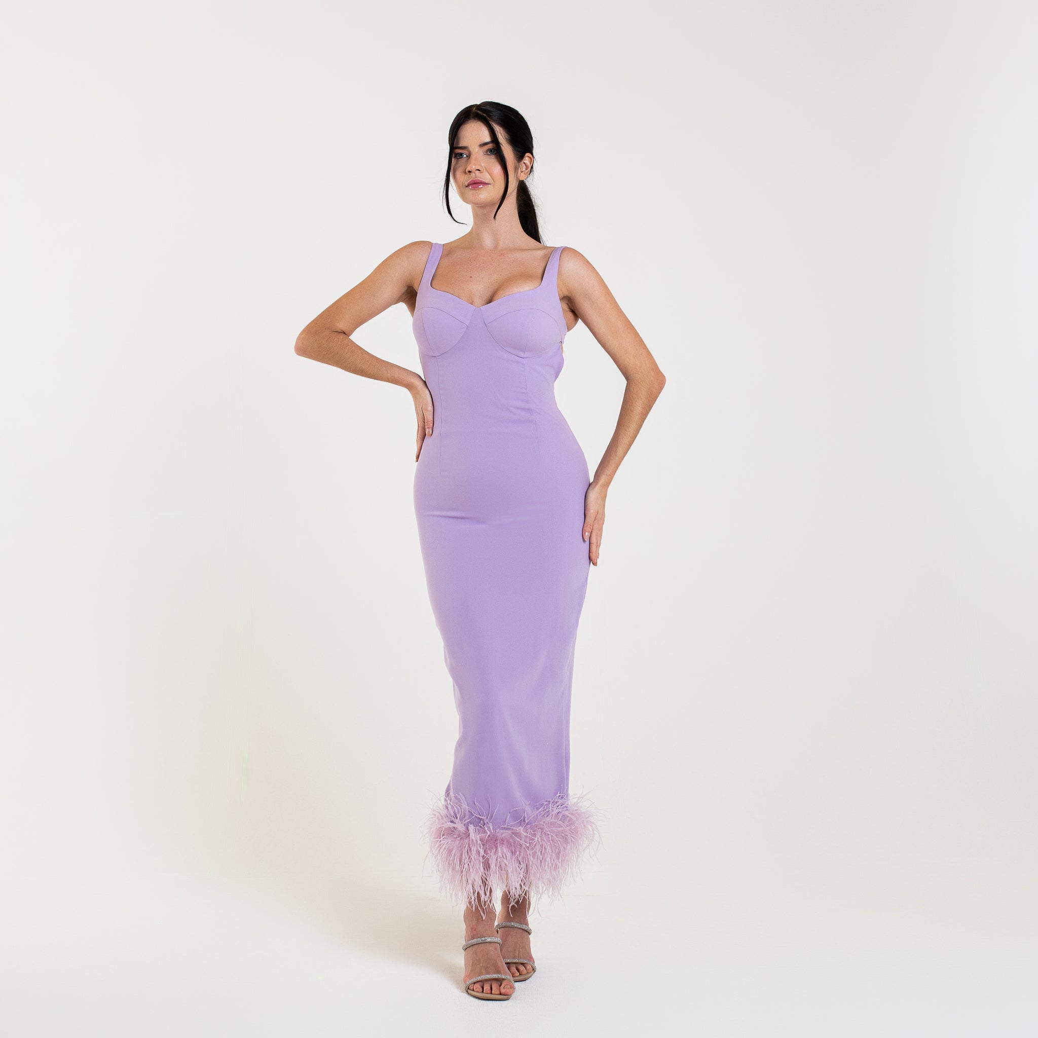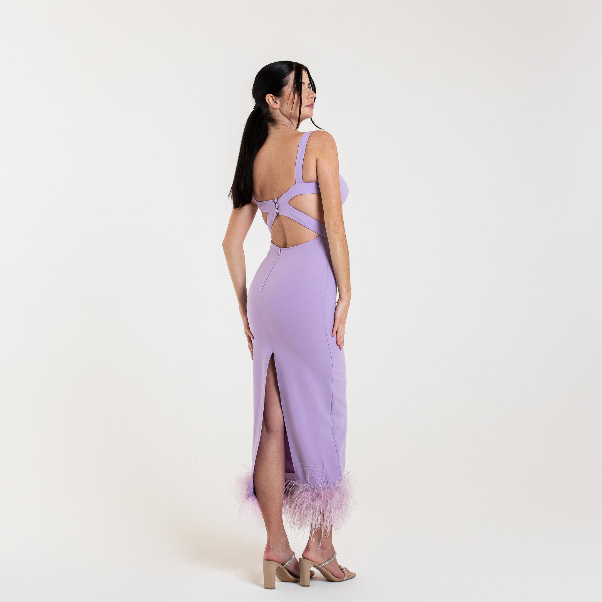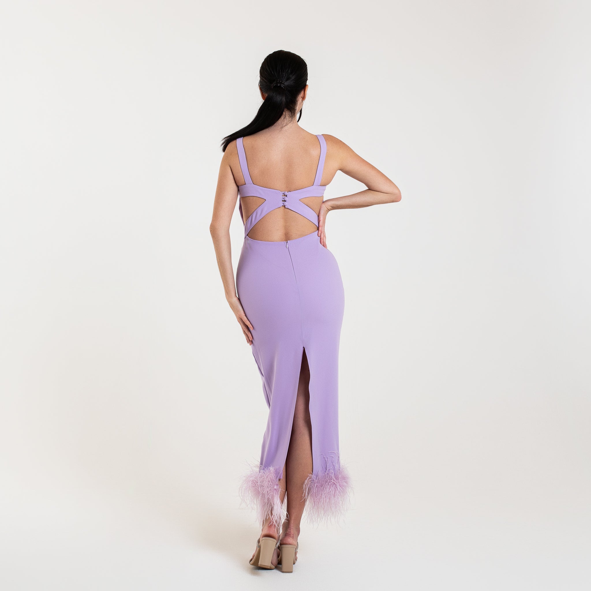 L'abito ELYA è una scelta sofisticata per le occasioni speciali. Con un lusinghiero taglio midi, schiena aperta e spacco posteriore, questo abito valorizzerà la vostra figura. Le spalline aggiungono un tocco di eleganza, mentre le piume di struzzo sul fondo aggiungono un tocco di glamour.