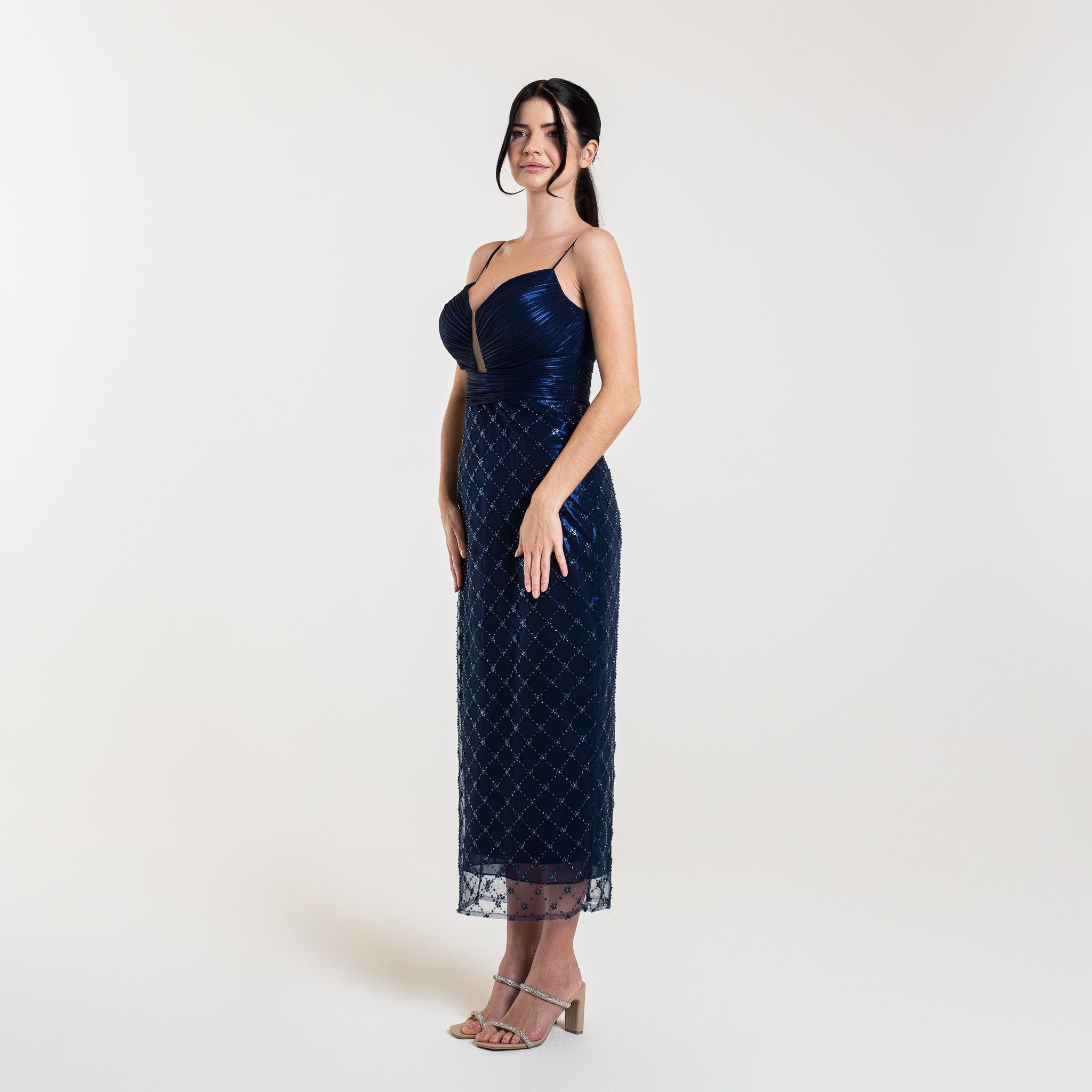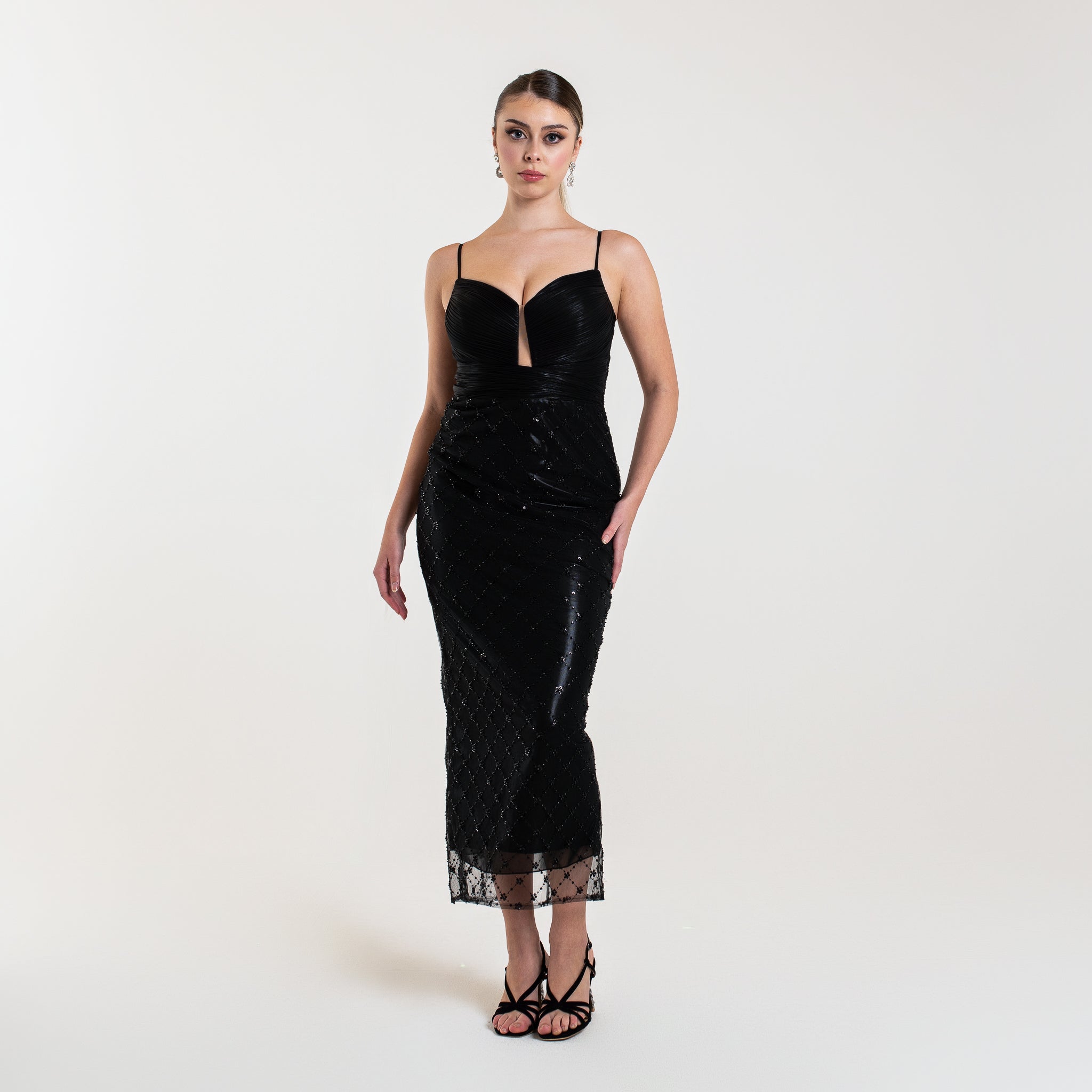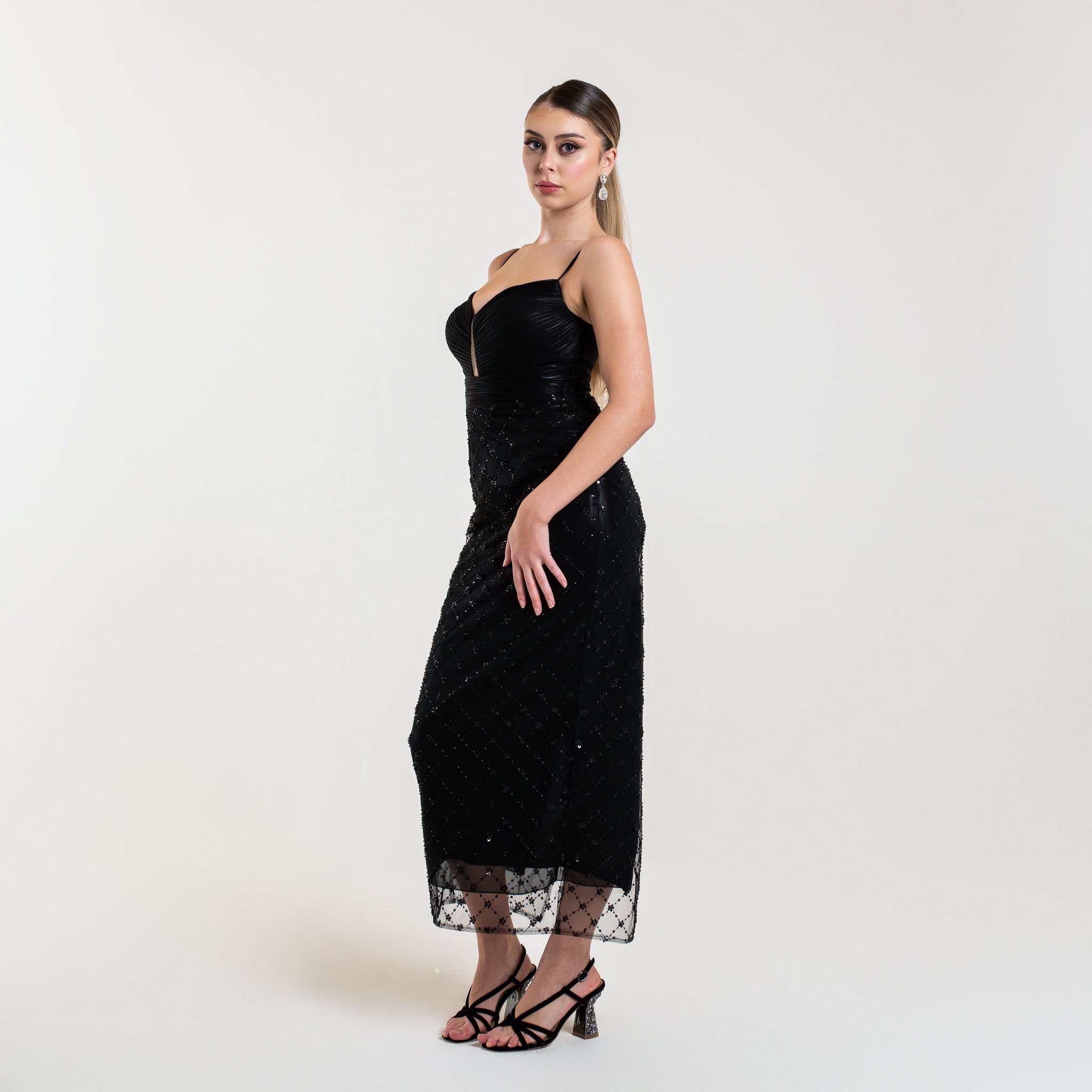 Cette robe est une pièce de soirée sophistiquée, combinant élégance et détails raffinés. Elle présente un corsage ajusté avec un décolleté en V profond, encadré par de fines bretelles qui lui confèrent un look léger et délicat. Le haut de la robe est confectionné dans un tissu plissé horizontalement, ce qui crée un effet texturé et sculptant, mettant en valeur la silhouette de la poitrine de manière subtile et élégante.