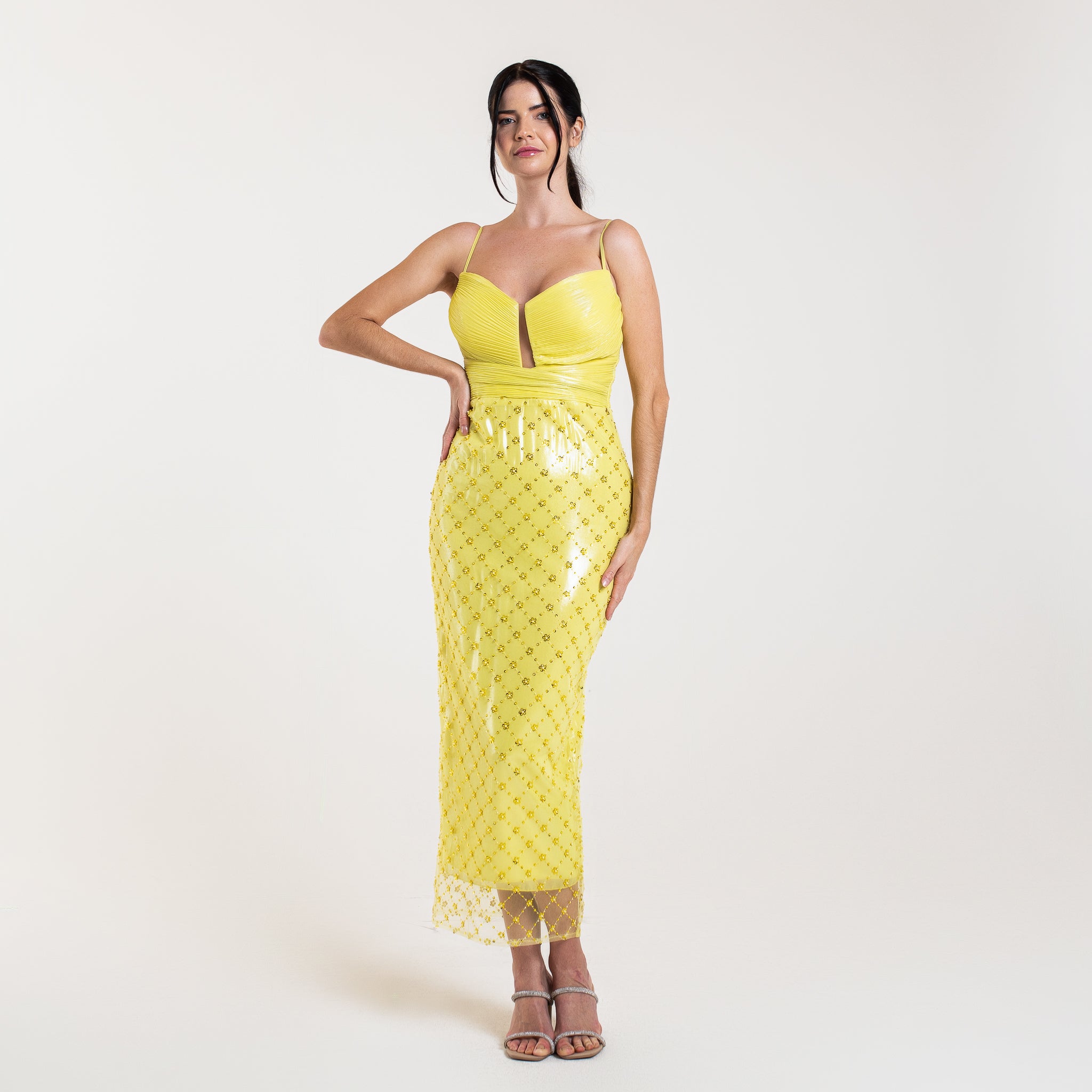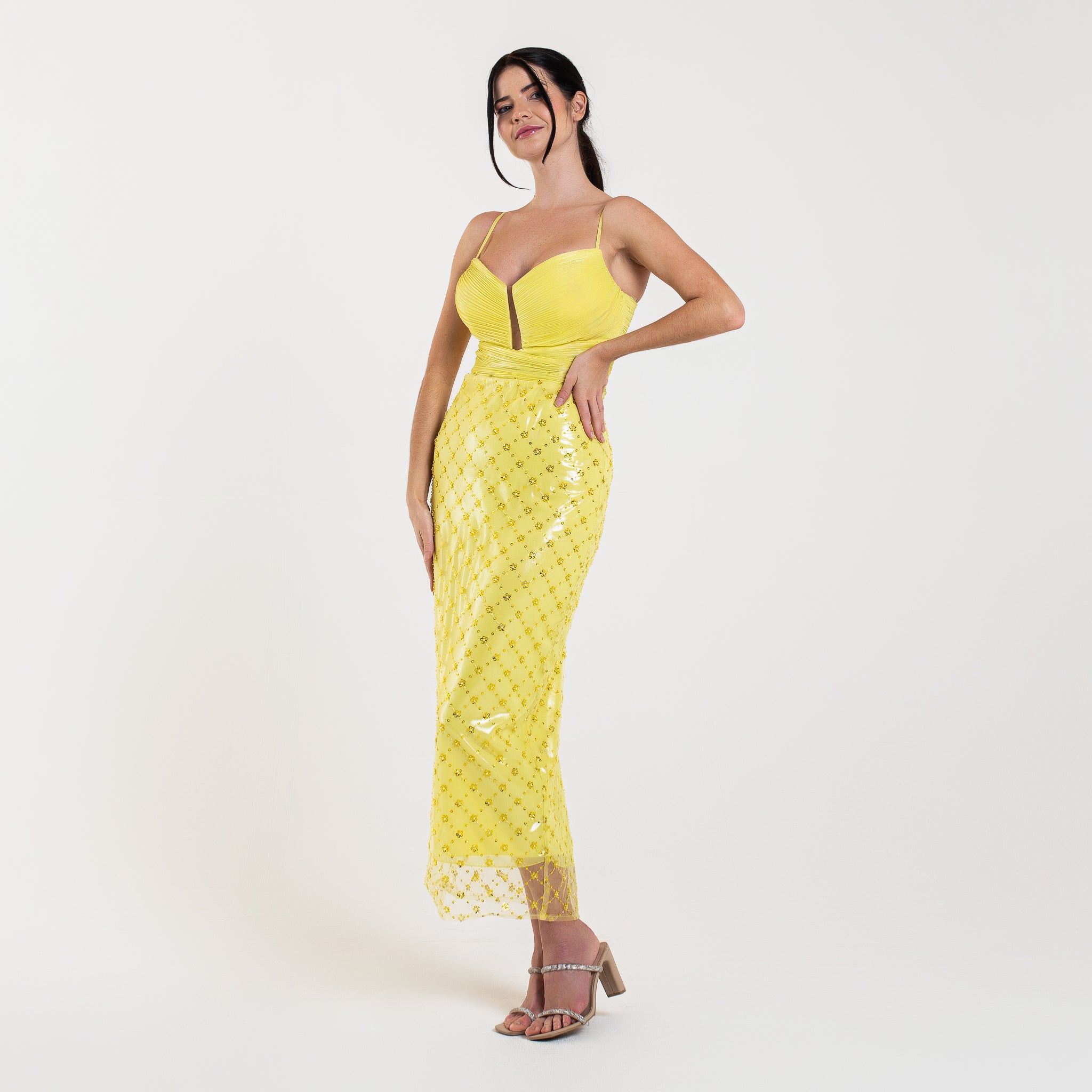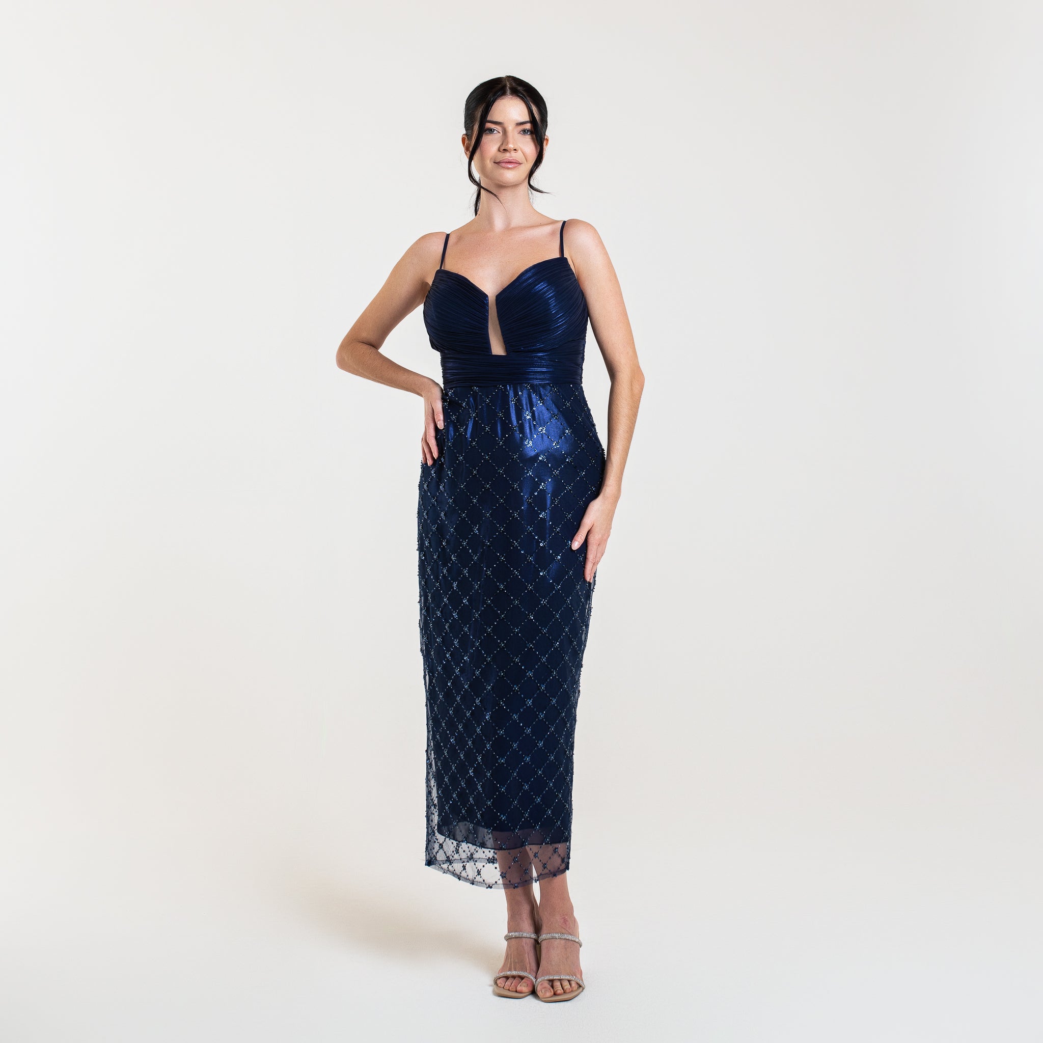 Cette robe est une pièce de soirée sophistiquée, combinant élégance et détails raffinés. Elle présente un corsage ajusté avec un décolleté en V profond, encadré par de fines bretelles qui lui confèrent un look léger et délicat. Le haut de la robe est confectionné dans un tissu plissé horizontalement, ce qui crée un effet texturé et sculptant, mettant en valeur la silhouette de la poitrine de manière subtile et élégante.