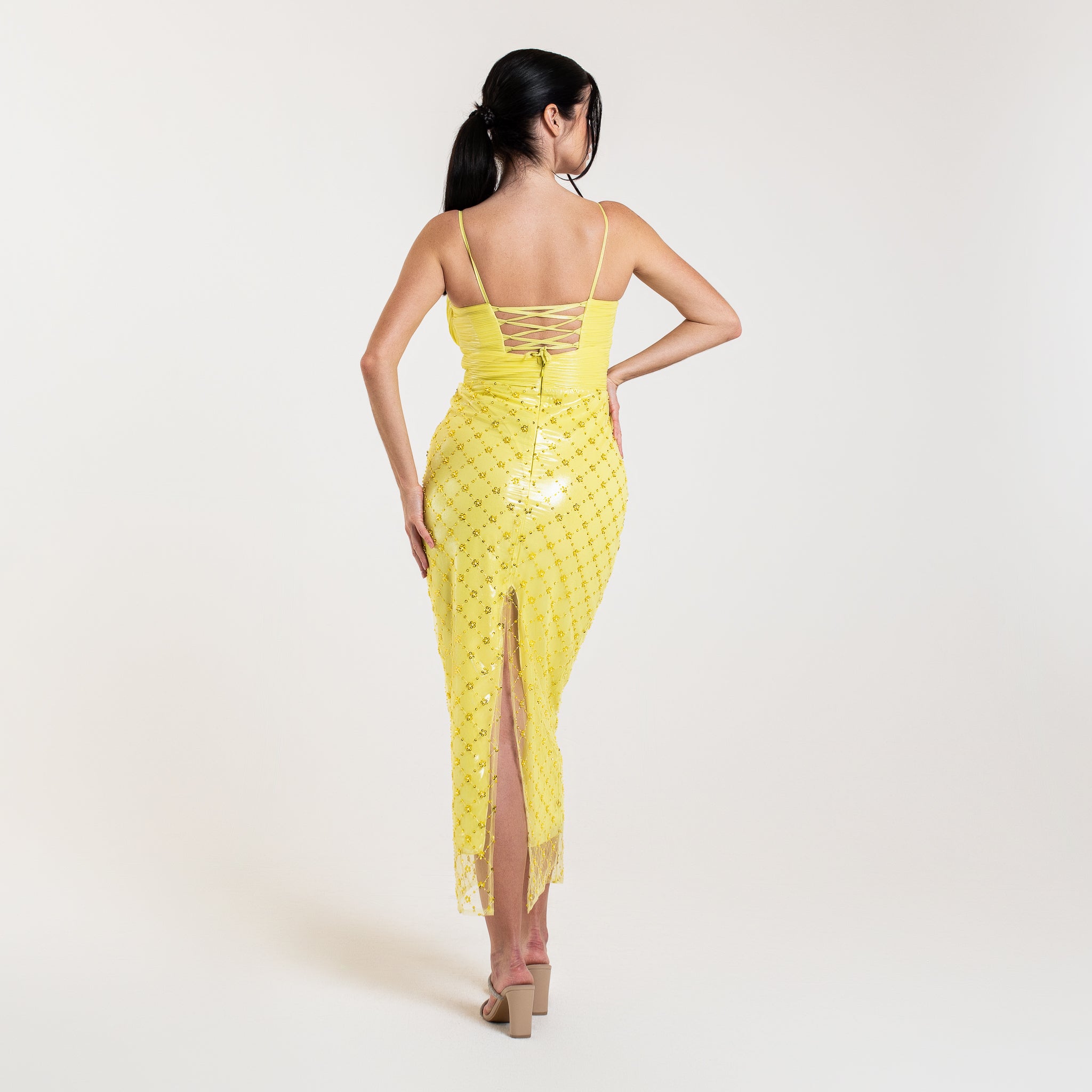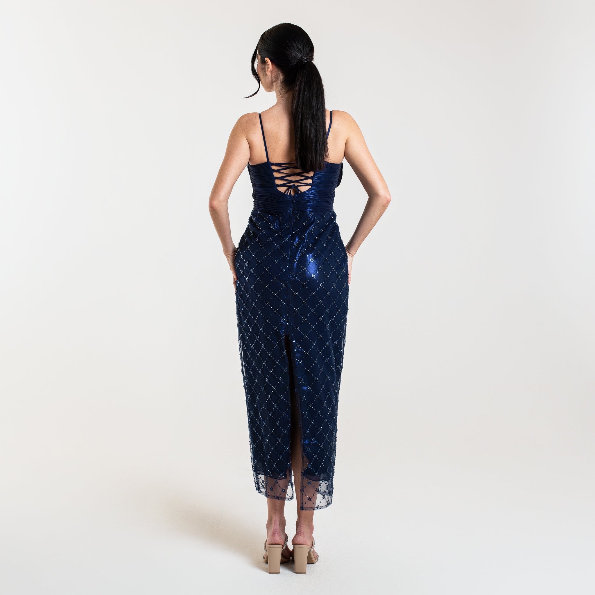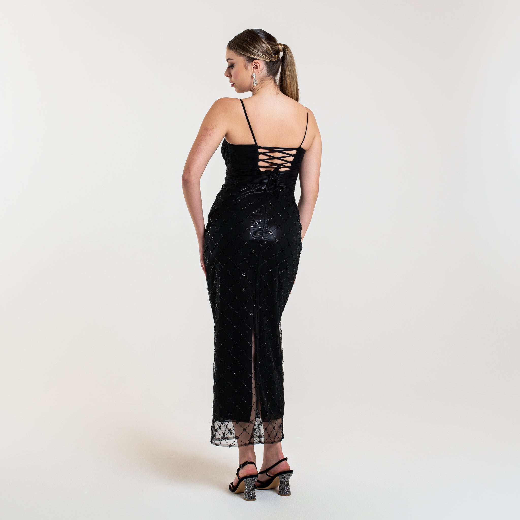 À l’arrière, la robe dispose d’un système de laçage croisé, permettant d’ajuster la tenue tout en ajoutant une note séduisante avec l’ouverture sur le dos. Ce détail accentue l’élégance du modèle tout en offrant une touche de modernité.