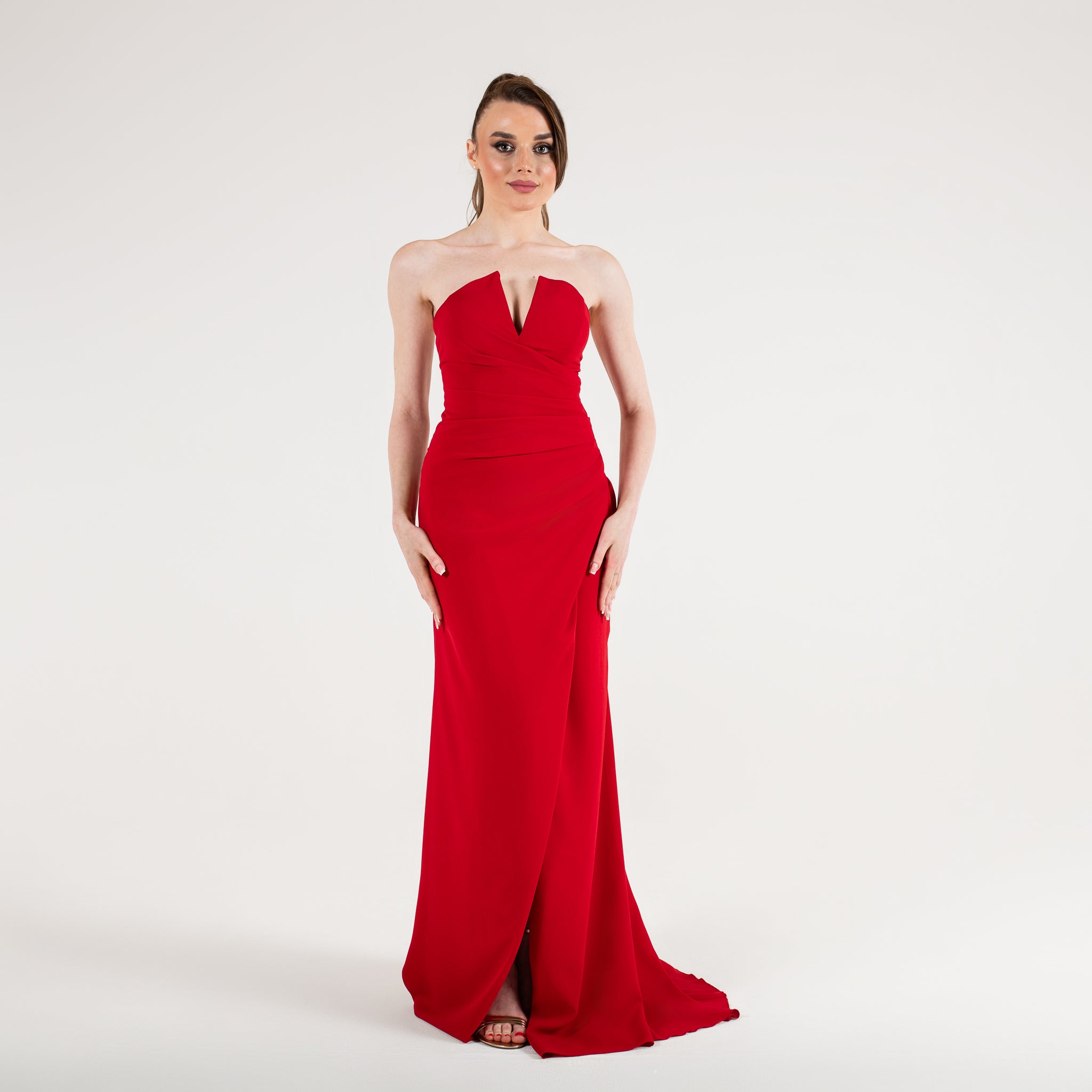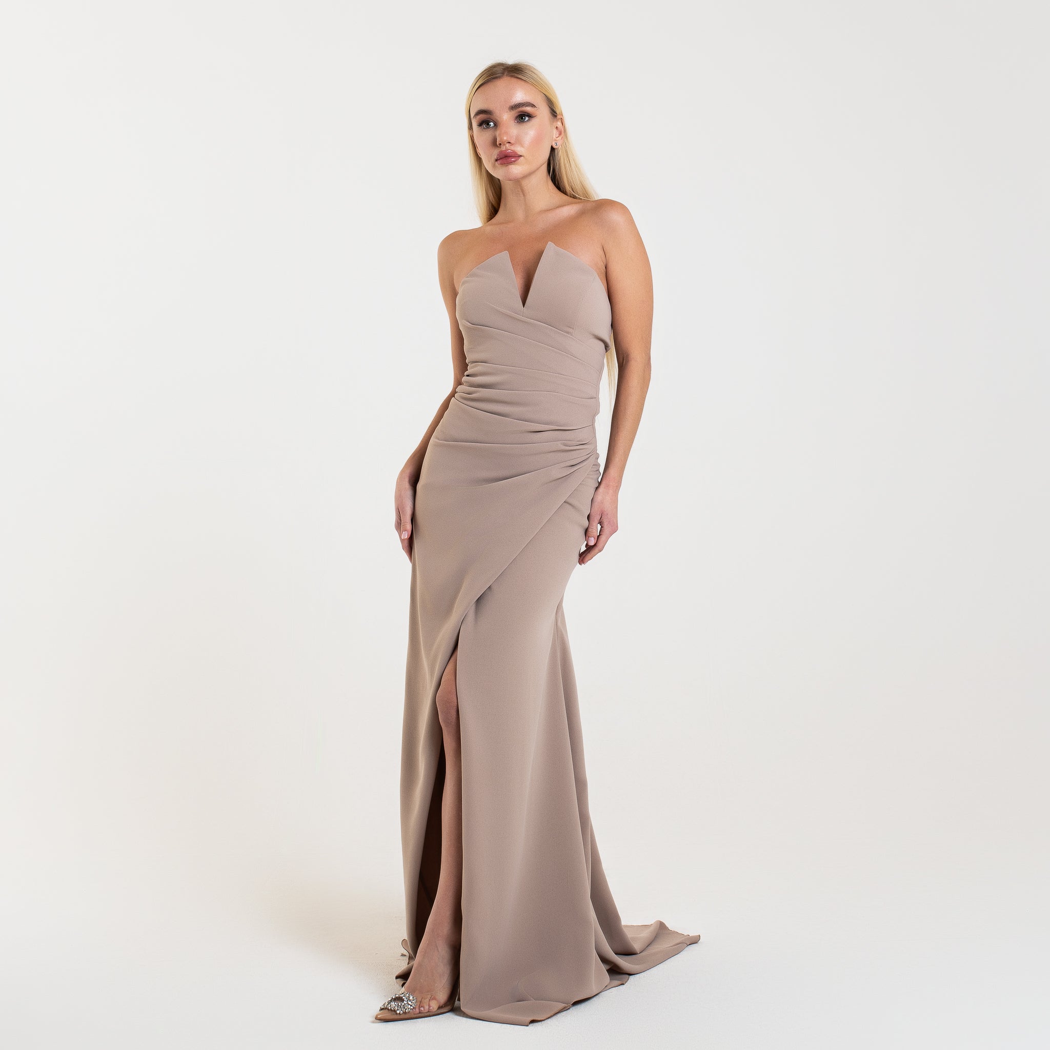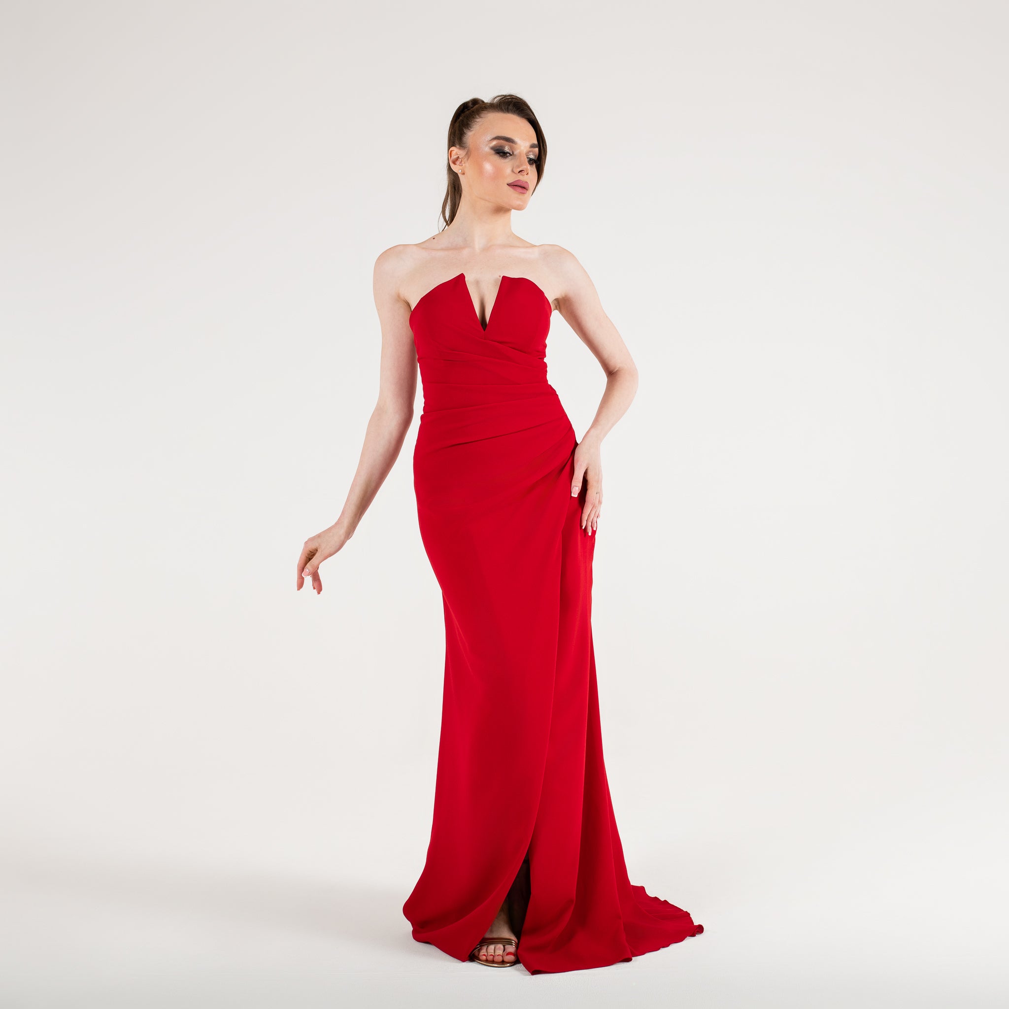 Cette robe est une pièce élégante et sophistiquée, parfaite pour une soirée formelle ou un gala. Elle est longue et fluide, avec un drapé qui descend avec grâce le long de la jupe, créant un effet de mouvement et de fluidité. Le haut de la robe est sans bretelles et présente un décolleté unique en forme de cœur inversé, ajoutant une touche moderne et structurée au design.