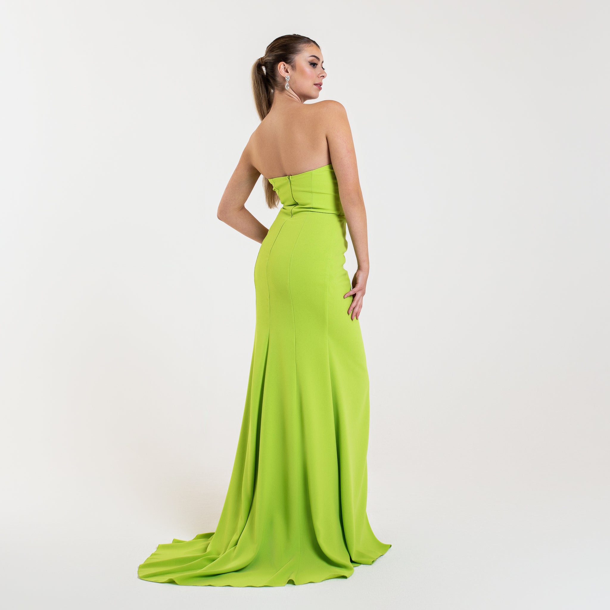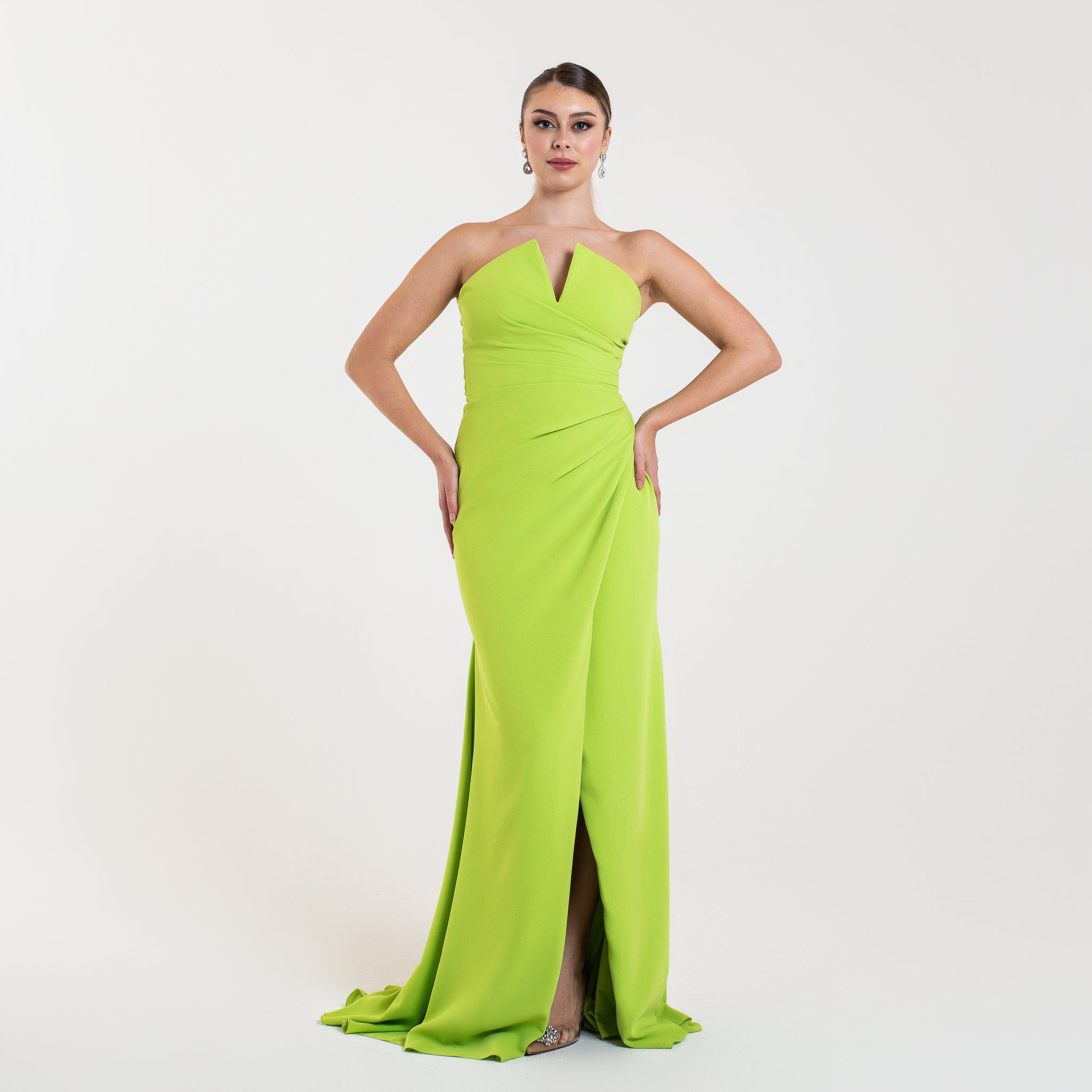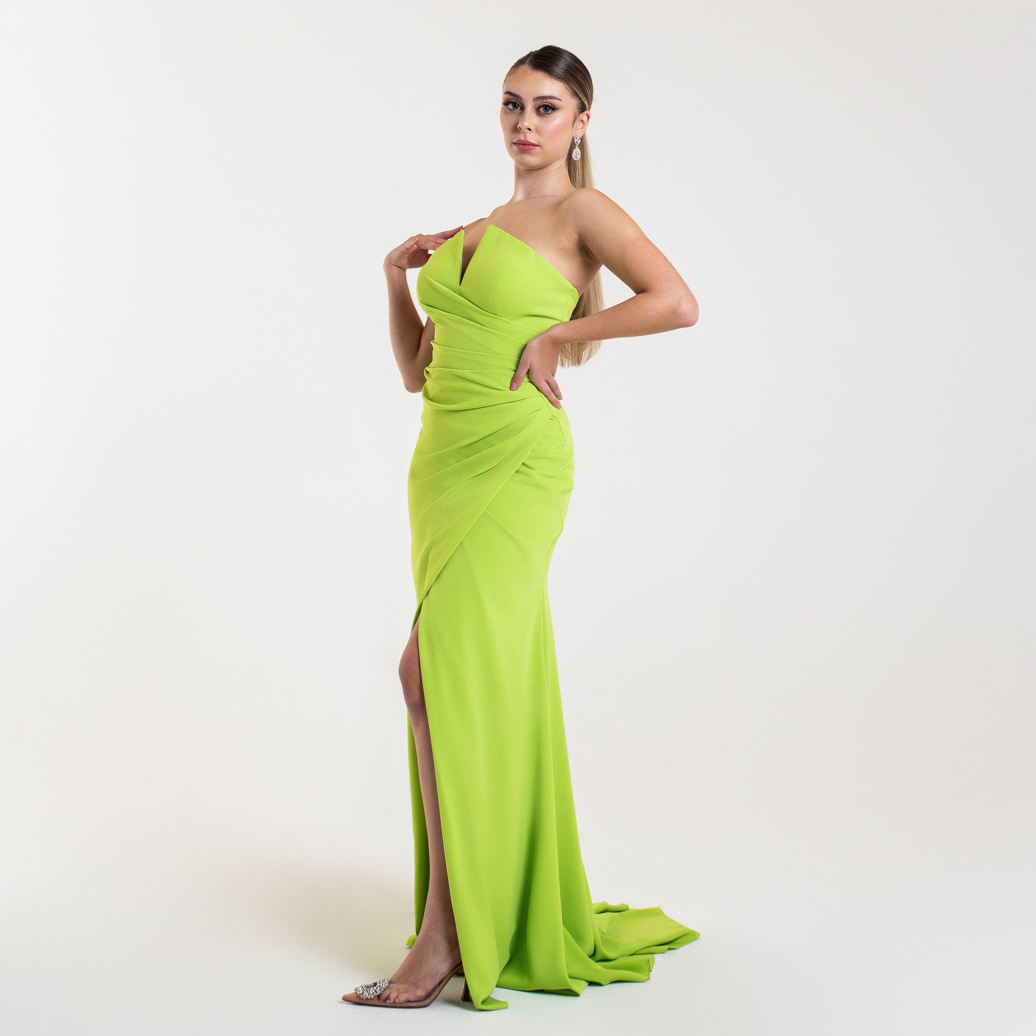 Cette robe est une pièce élégante et sophistiquée, parfaite pour une soirée formelle ou un gala. Elle est longue et fluide, avec un drapé qui descend avec grâce le long de la jupe, créant un effet de mouvement et de fluidité. Le haut de la robe est sans bretelles et présente un décolleté unique en forme de cœur inversé, ajoutant une touche moderne et structurée au design.