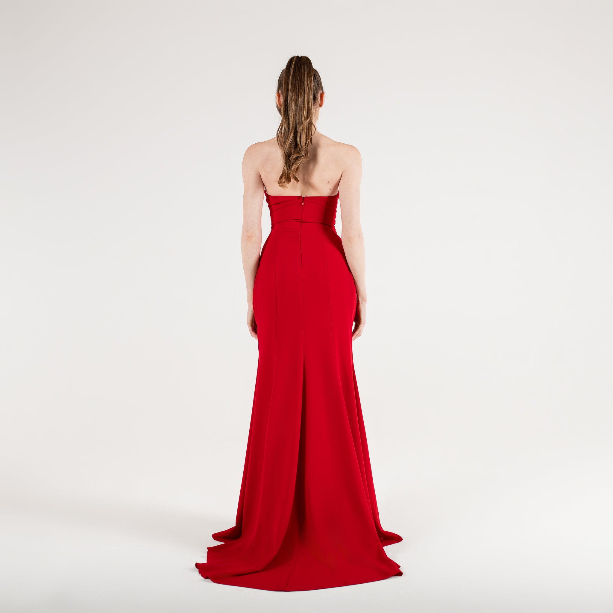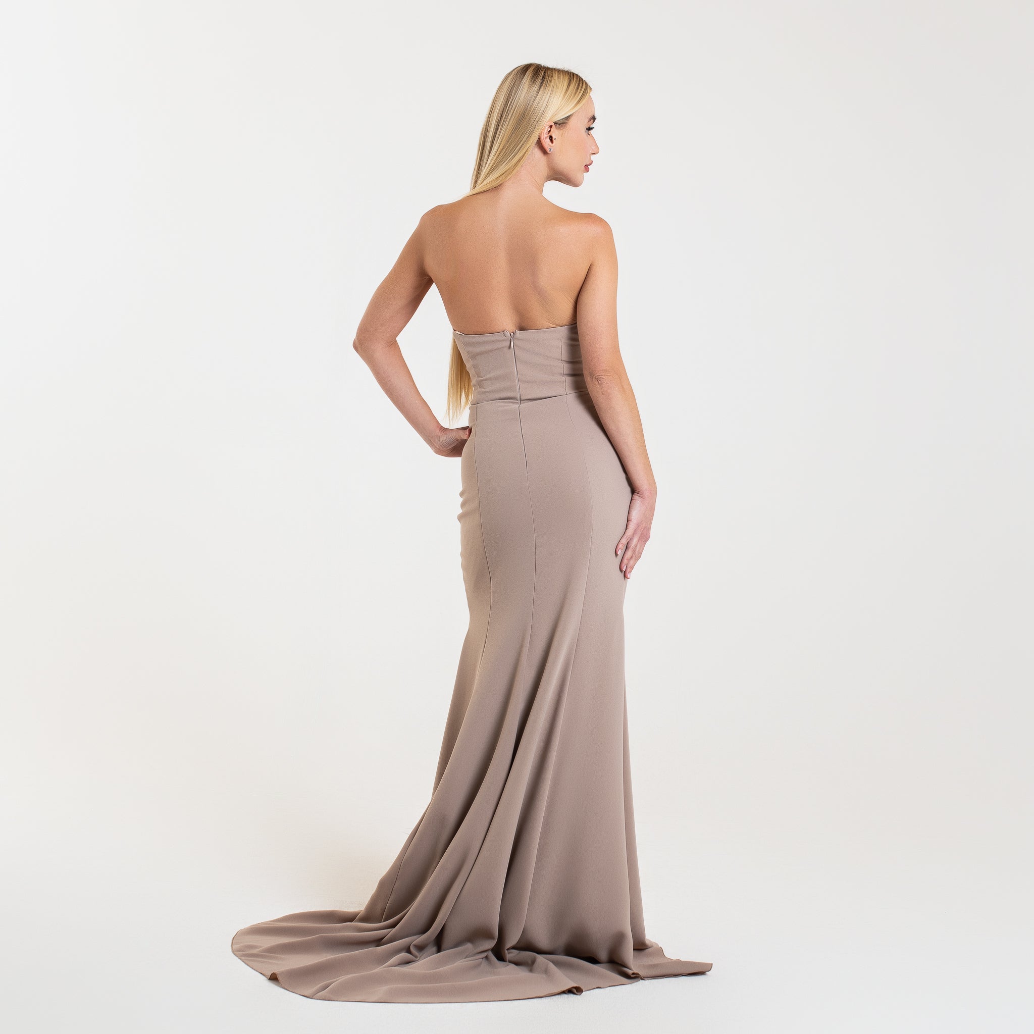 La taille est subtilement marquée, ce qui met en valeur la silhouette et accentue l’effet de cascade du tissu qui tombe jusqu’au sol. Le bas de la robe est légèrement évasé, avec un effet de superposition discrète à l’arrière, ce qui lui donne une allure majestueuse et élancée.